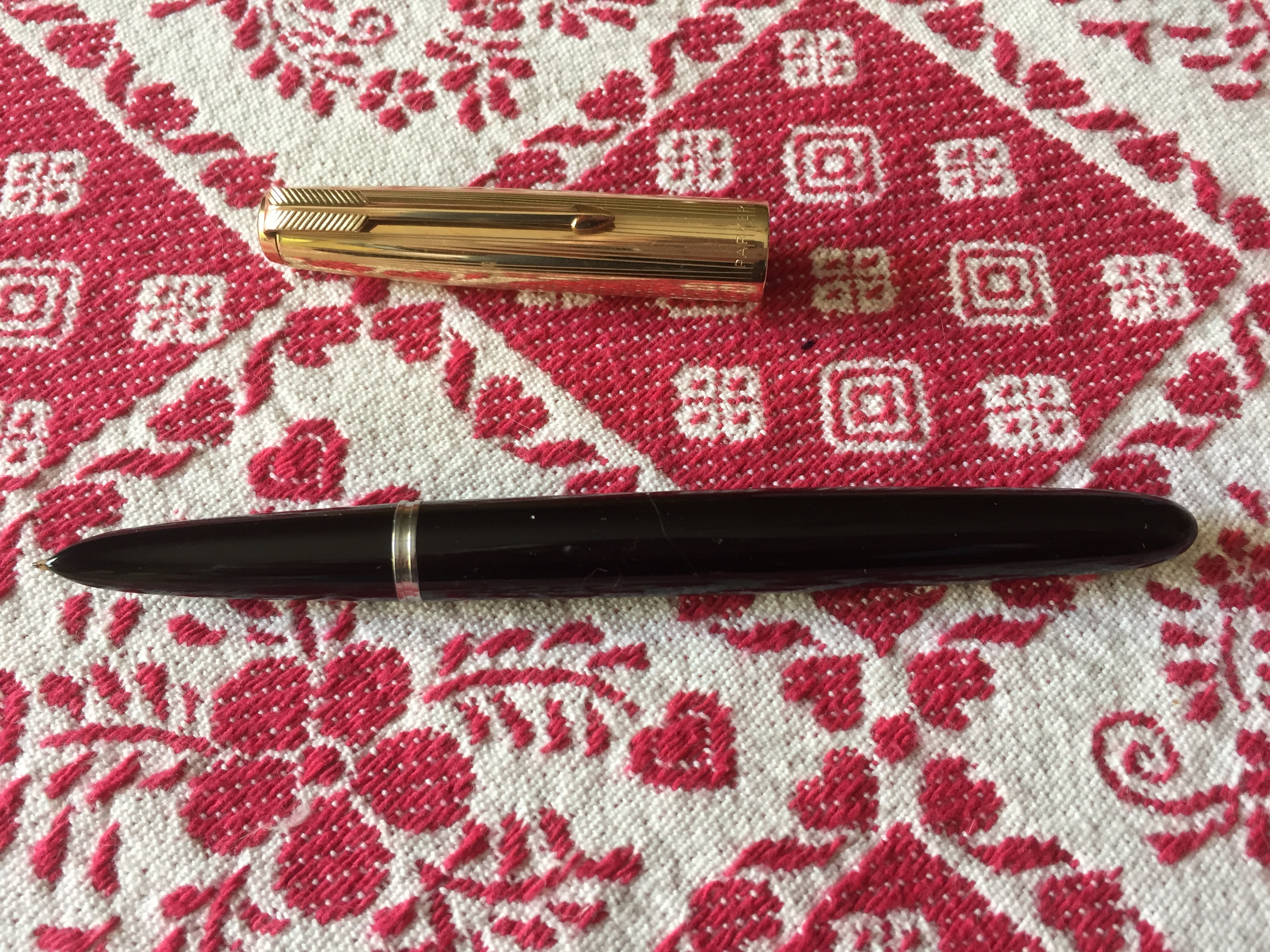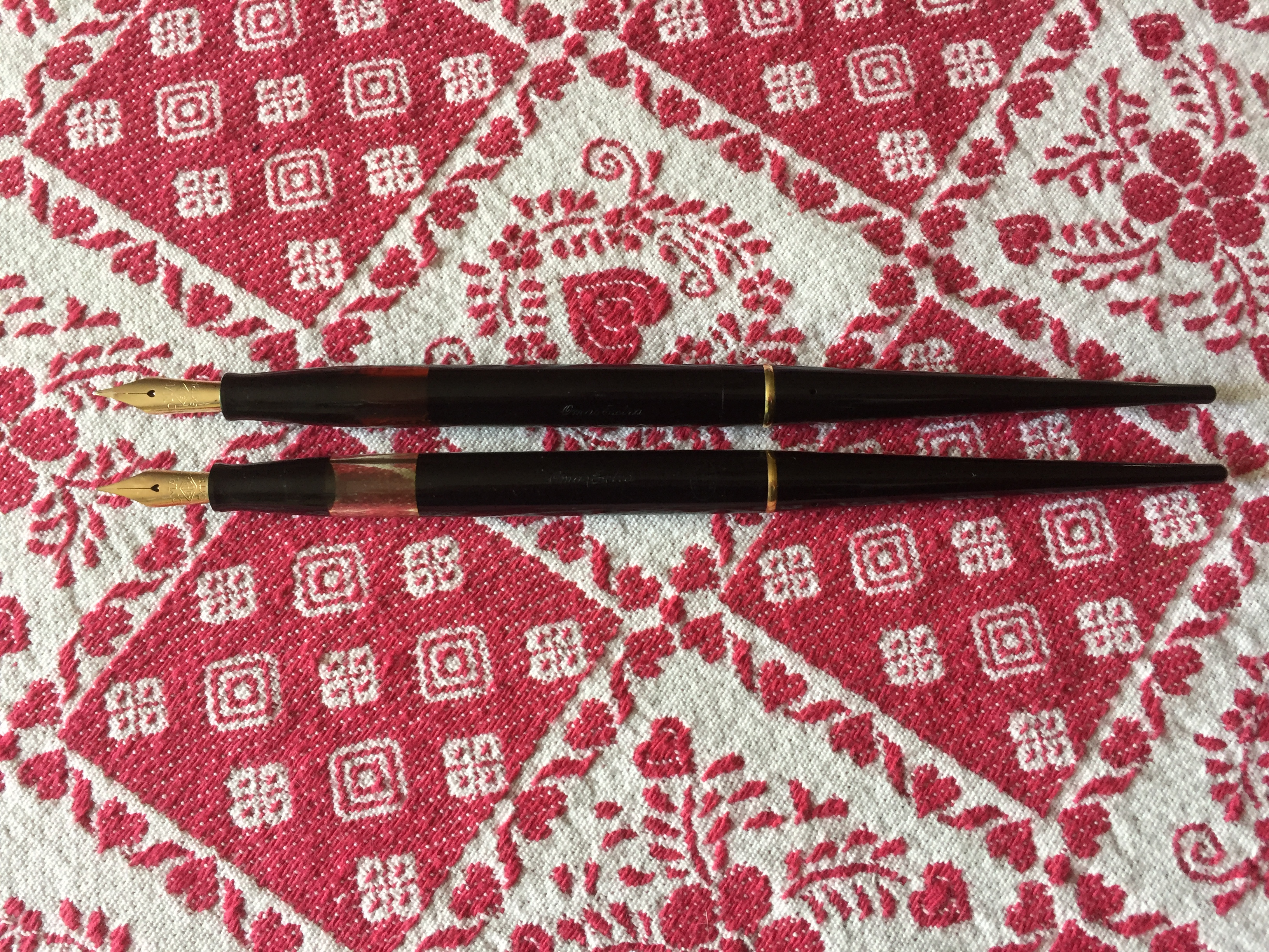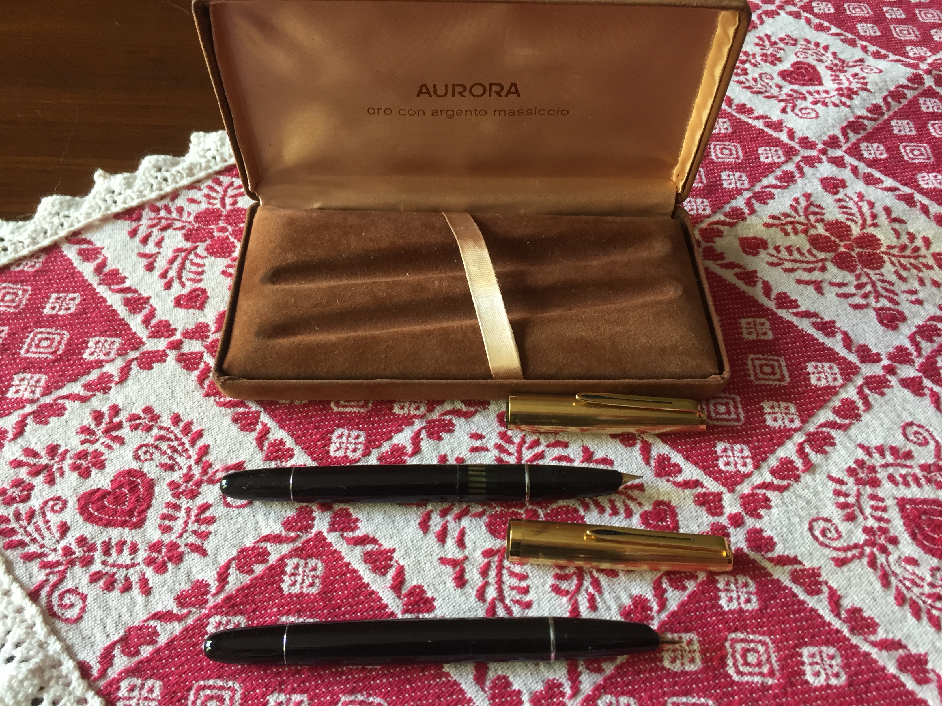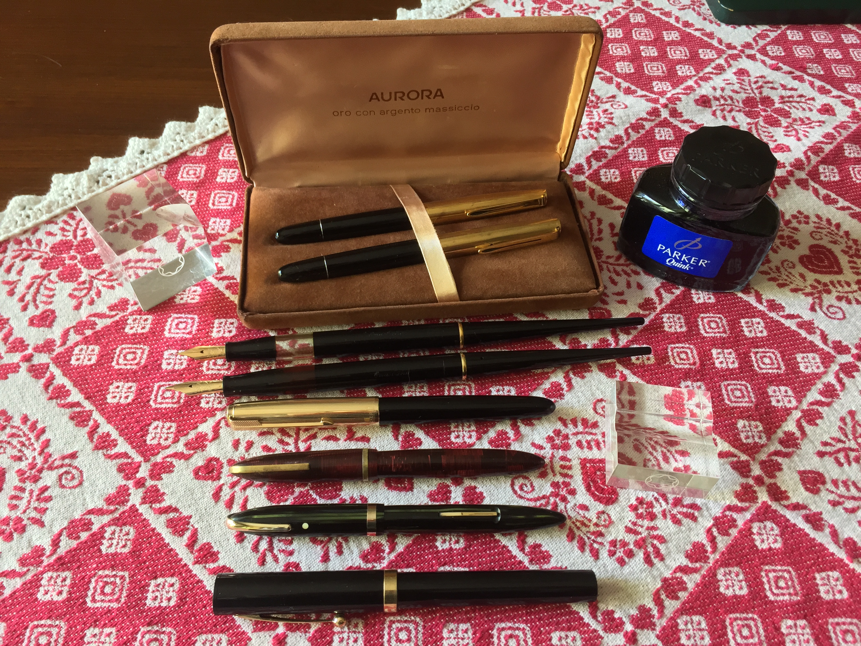 Come sempre vi mostro i miei nuovi arrivi, monotoni ma pur sempre gradevoli. Due stilografiche Aurora P88 in ottime condizioni, funzionanti (probabilmente la scatola conteneva una matita meccanica); Parker 51, anche questa funzionante in condizioni eccellenti; stilografica a pulsante di fondo Verbana, con pennino oro 585 analogo, molto bella la celluloide anellata rossa, in buone condizioni, da sostituire il serbatoio inchiostro; una Sheaffer Balance Lifetime 875 Green Striated, con clip militare, funzionante in ottimo stato; Sheaffer NoNonSense, nera con converter annesso, pennino misura M dorato, funzionante, in ottimo stato; due penne per stiloforo Omas Extra, pennino oro 585 Omas, di cui una (praticamente nuova, ha il sughero ancora intatto) con il marchio Corrado Accossano Roma (negozio storico romano per articoli da scrittura); per finire boccetta d'inchiostro Parker, mai usata o aperta e due poggia penne per vetrina della MB.