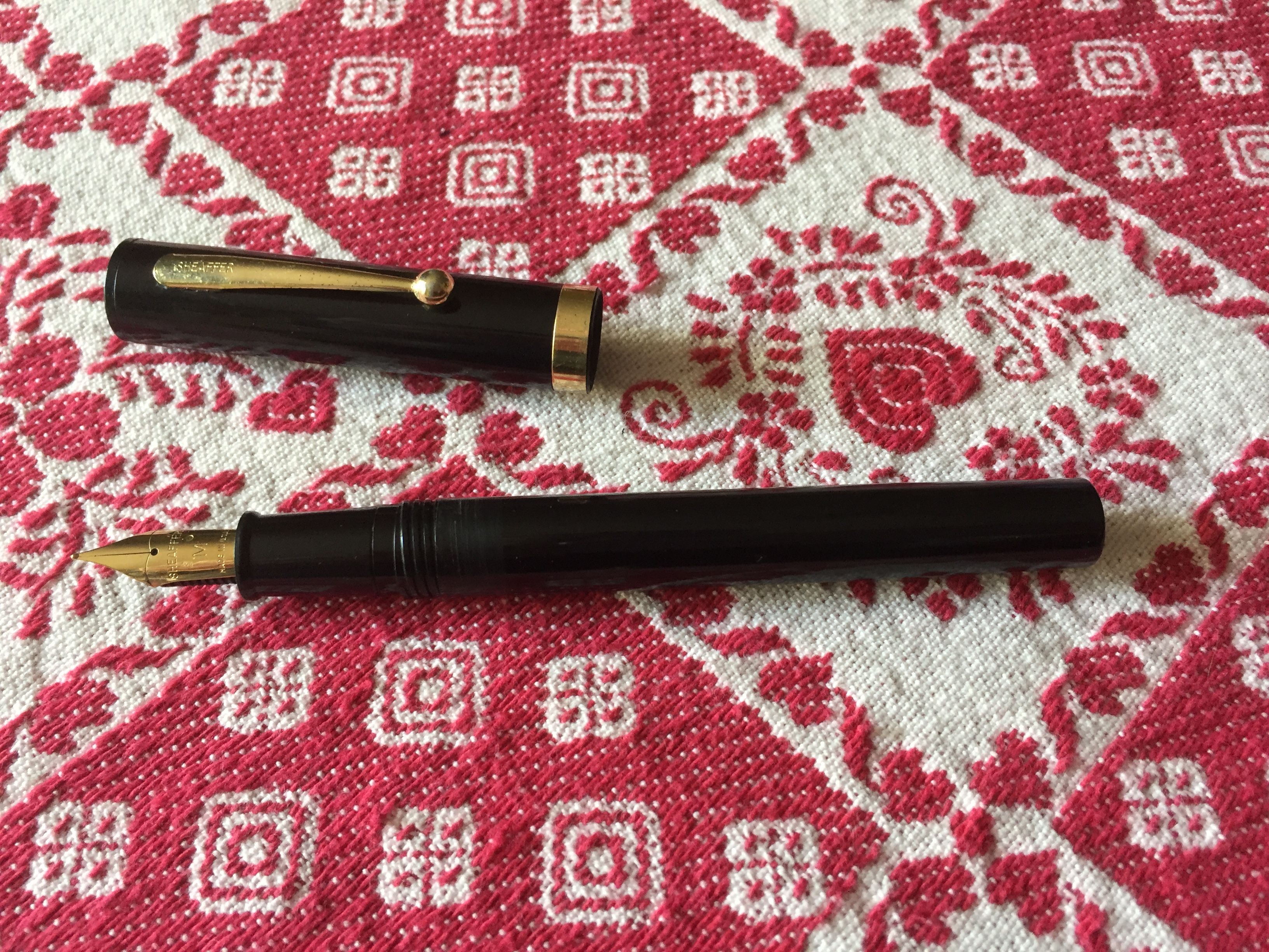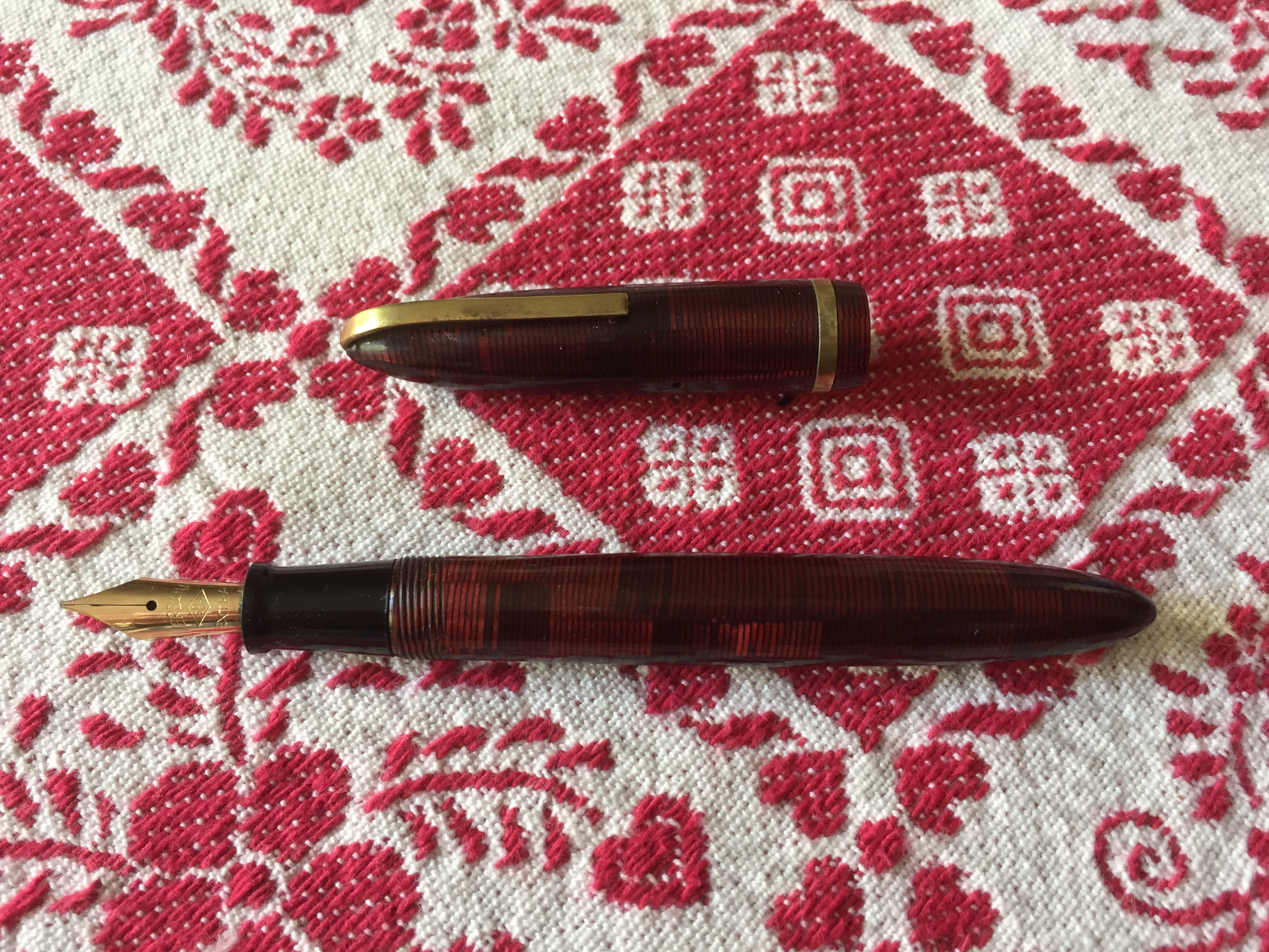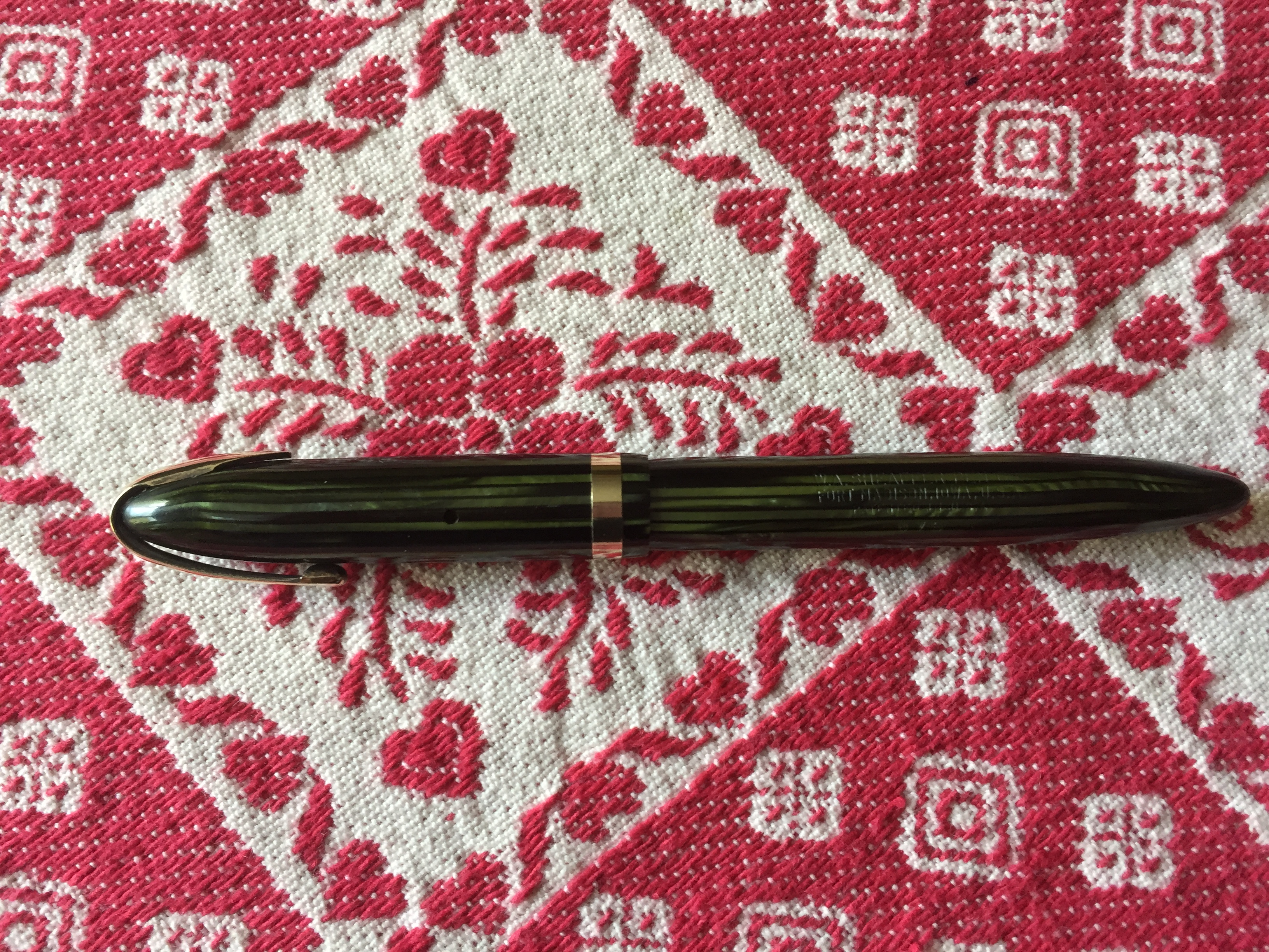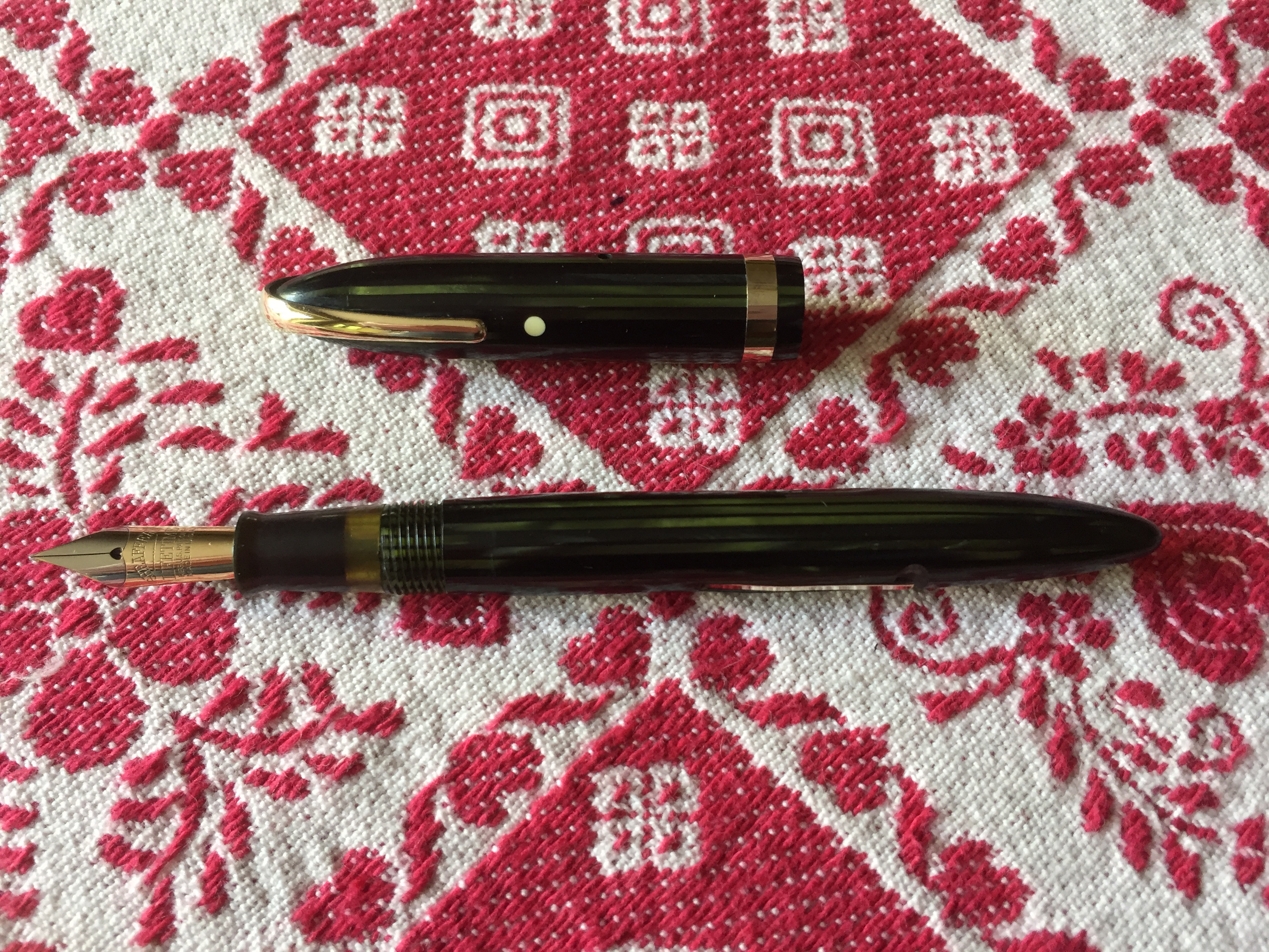 Come sempre vi mostro i miei nuovi arrivi, monotoni ma pur sempre gradevoli. Due stilografiche Aurora P88 in ottime condizioni, funzionanti (probabilmente la scatola conteneva una matita meccanica); Parker 51, anche questa funzionante in condizioni eccellenti; stilografica a pulsante di fondo Verbana, con pennino oro 585 analogo, molto bella la celluloide anellata rossa, in buone condizioni, da sostituire il serbatoio inchiostro; una Sheaffer Balance Lifetime 875 Green Striated, con clip militare, funzionante in ottimo stato; Sheaffer NoNonSense, nera con converter annesso, pennino misura M dorato, funzionante, in ottimo stato; due penne per stiloforo Omas Extra, pennino oro 585 Omas, di cui una (praticamente nuova, ha il sughero ancora intatto) con il marchio Corrado Accossano Roma (negozio storico romano per articoli da scrittura); per finire boccetta d'inchiostro Parker, mai usata o aperta e due poggia penne per vetrina della MB.