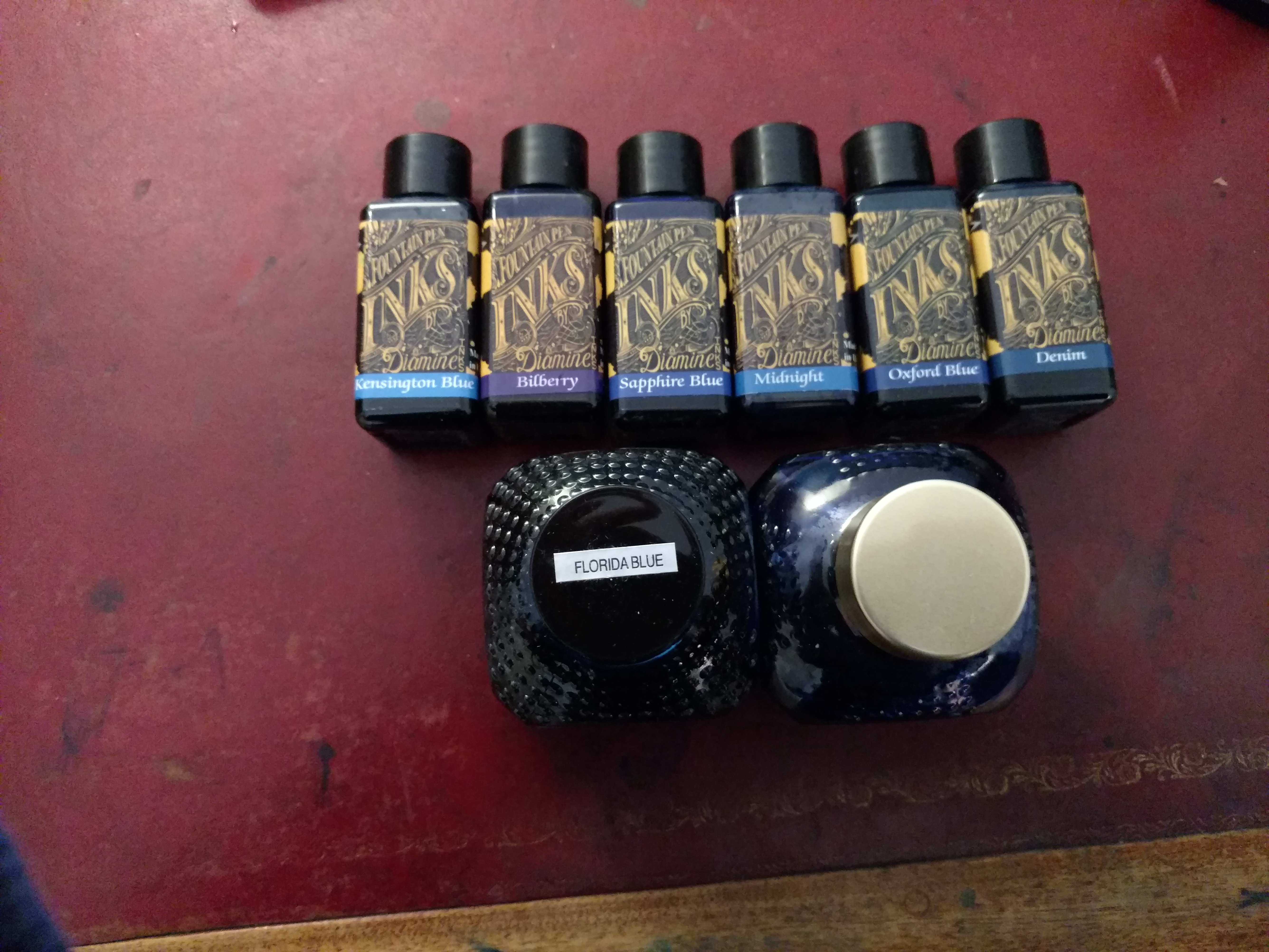 Mi aggrego anch'io, che proprio oggi ho ricevuto un bel pacchetto di inchiostri Diamine. In ordine di blu: Majestic Blue, Sapphire Blue, Sargasso Sea, Eclipse e, per ultimo ma non per importanza, Ancient Copper.