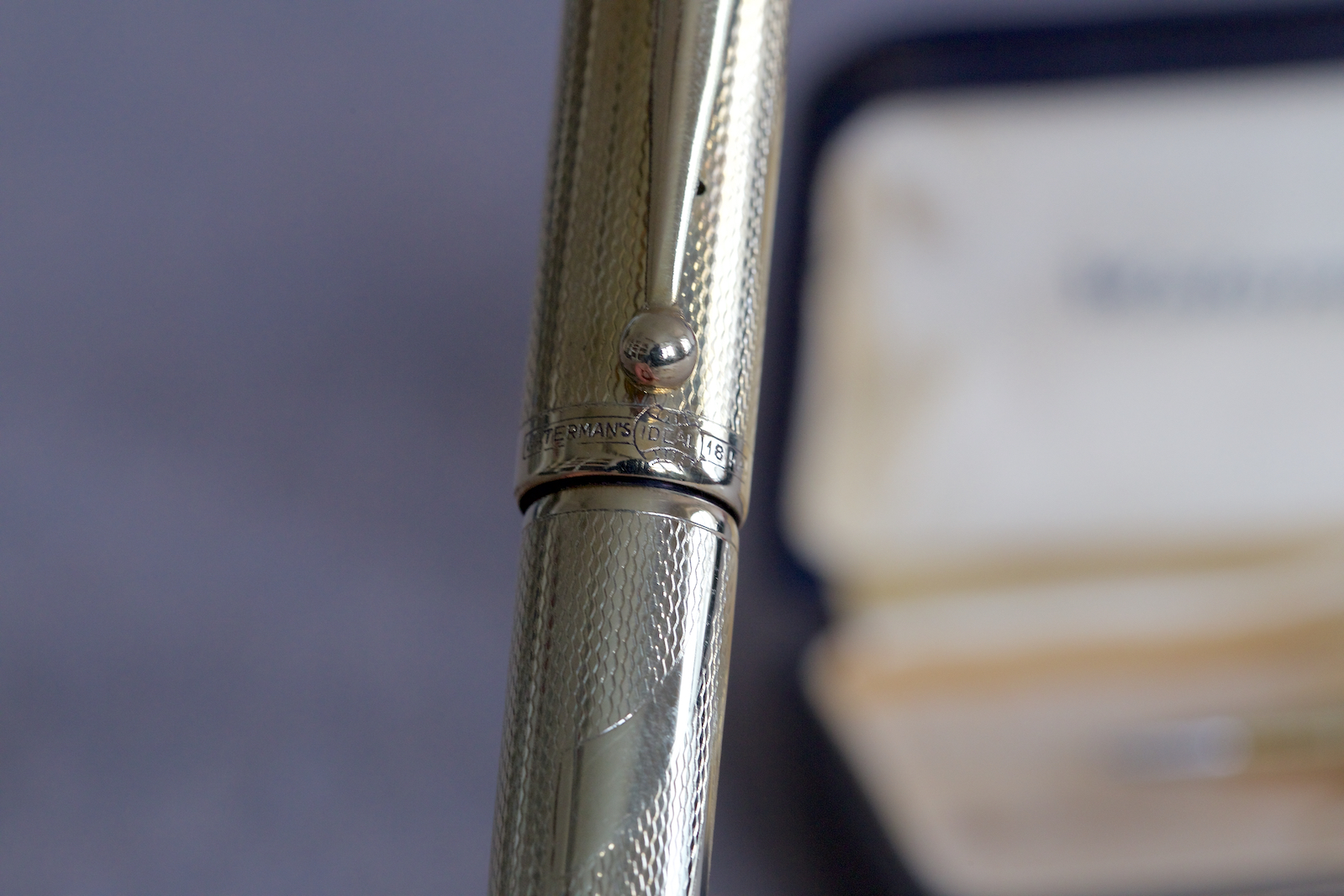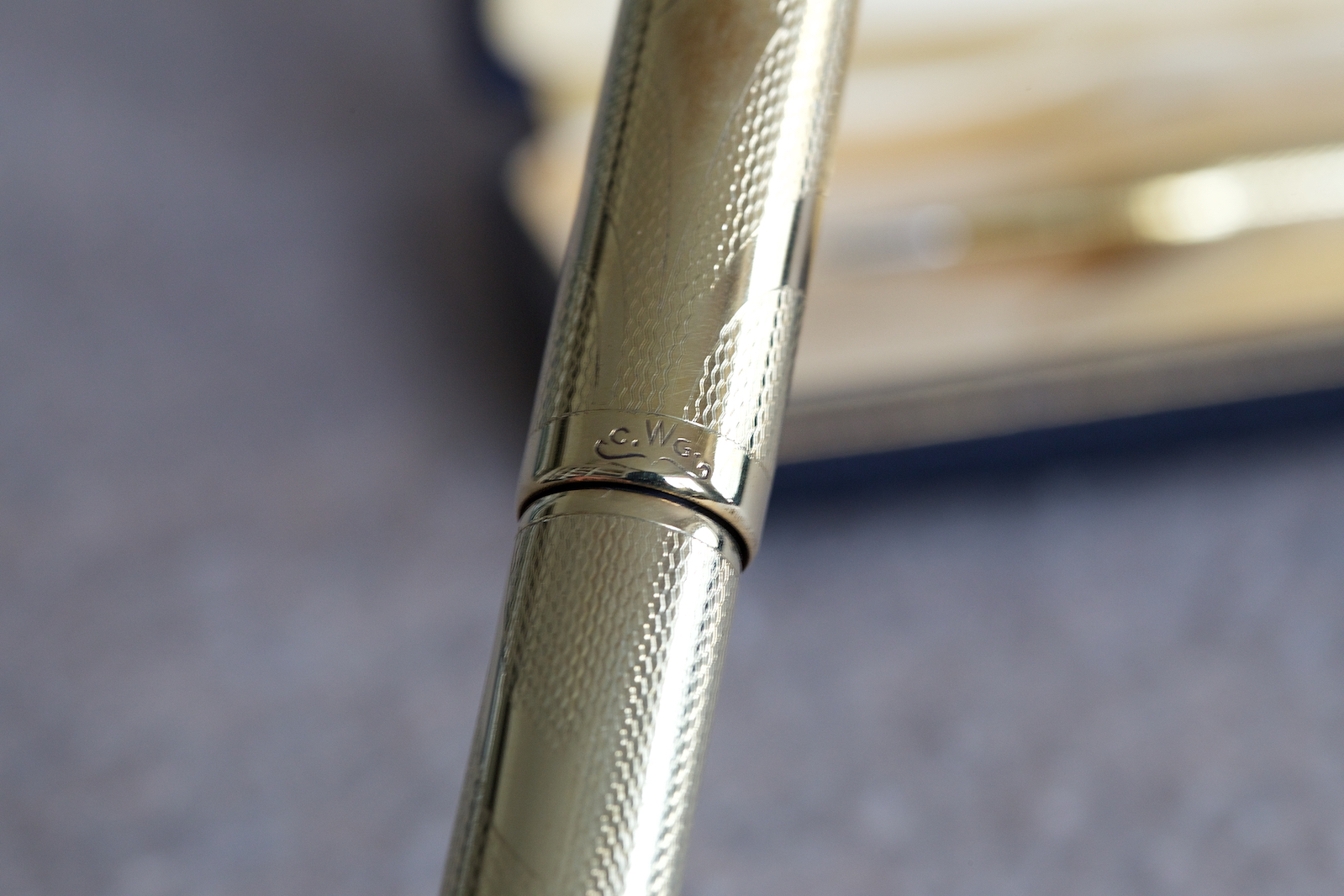 La penna stilografica è punzonata C. WG. , punzone che identifica Carlo Weingrill della ditta orafa Weingrill tuttora esistente ed operante a Milano dal lontano 1879. Sul fondello appare anche un numero che penso sia un numero che identifica le penne prodotte dal laboratorio orafo.