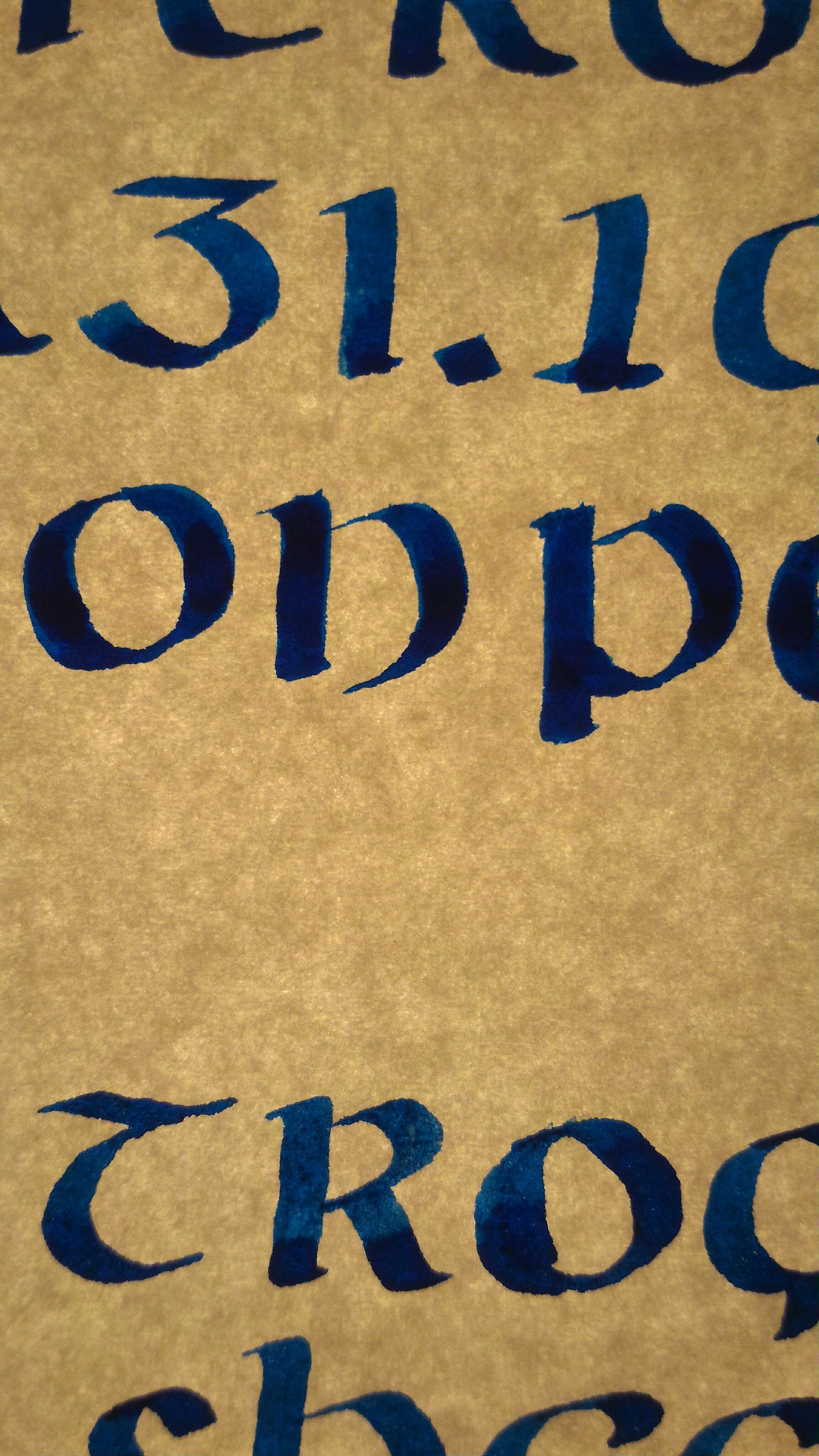 Cominciamo dal BSIAR. Da solo non è dei peggiori, ma l'aggiunta di gomma lo migliora di molto, specialmente nelle caratteristiche di flusso e feeling di scrittura che purtroppo non trapelano dalle immagini. Da "gommato" è molto più piacevole da stendere, i bordi sono più definiti, la penetrazione nella carta è minore e più lenta, l'asciugatura è molto, molto più lenta. Sono rimasto stupito dal cambio di colore che non mi aspettavo minimamente. Le caratteristiche di ombreggiatura vengono mantenute: nella parte scritta con inchiostro gommato le parti più scure sono più piccole proprio perché la maggior viscosità della miscela tende a mantenere ferme le "pozzanghere" di inchiostro. Questa foto è fatta all'interno con la lampada a led della ma scrivania. In alto inchiostro puro, in basso con gomma.