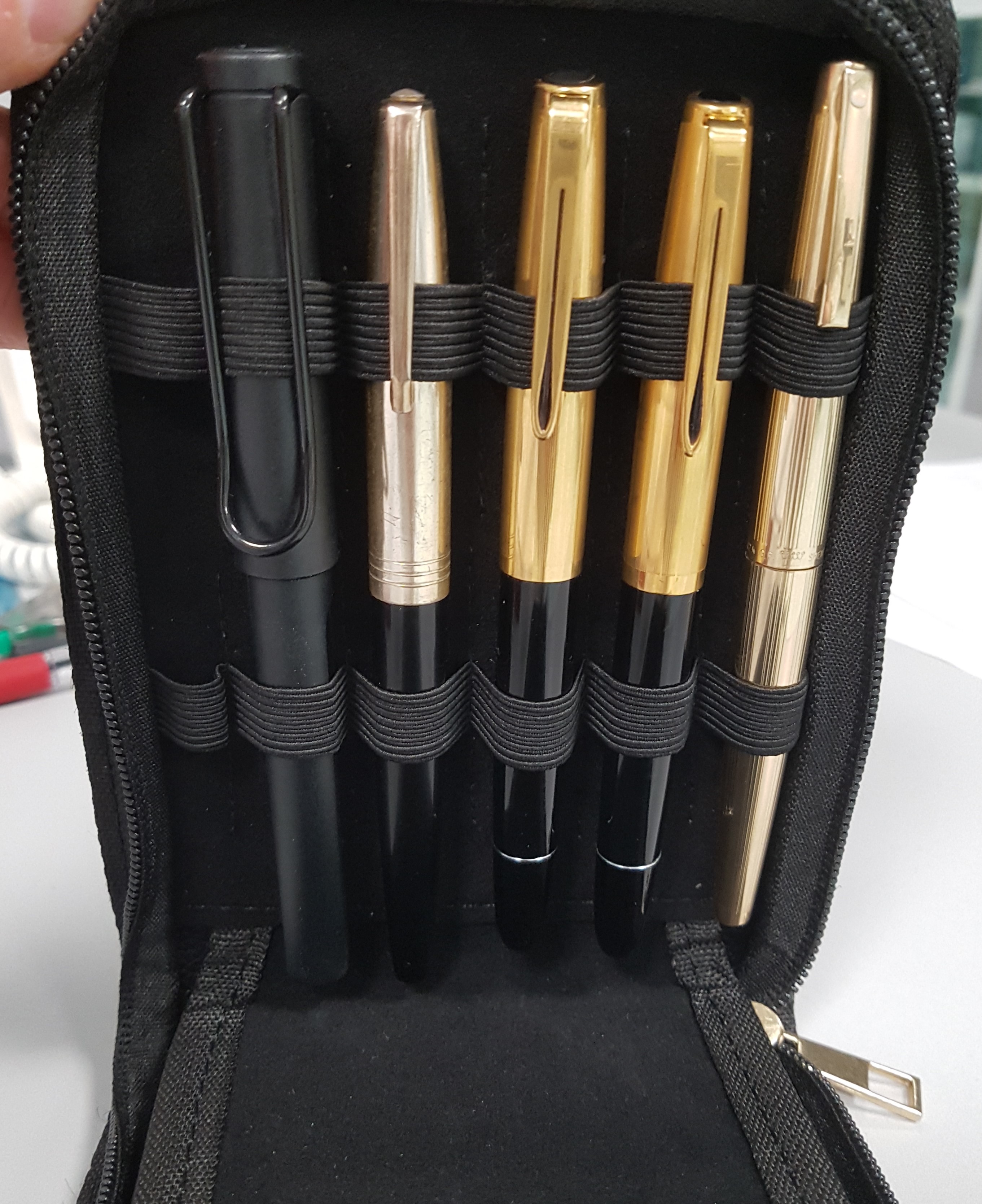 Grazie a un suggerimento colto su questo forum, ho scucito un passante sì e uno no in un astuccio di questo genere - basta una forbicina - ottenendo un astuccio con metà capacità ma con gli elastici assolutamente adeguati alle penne non slim.