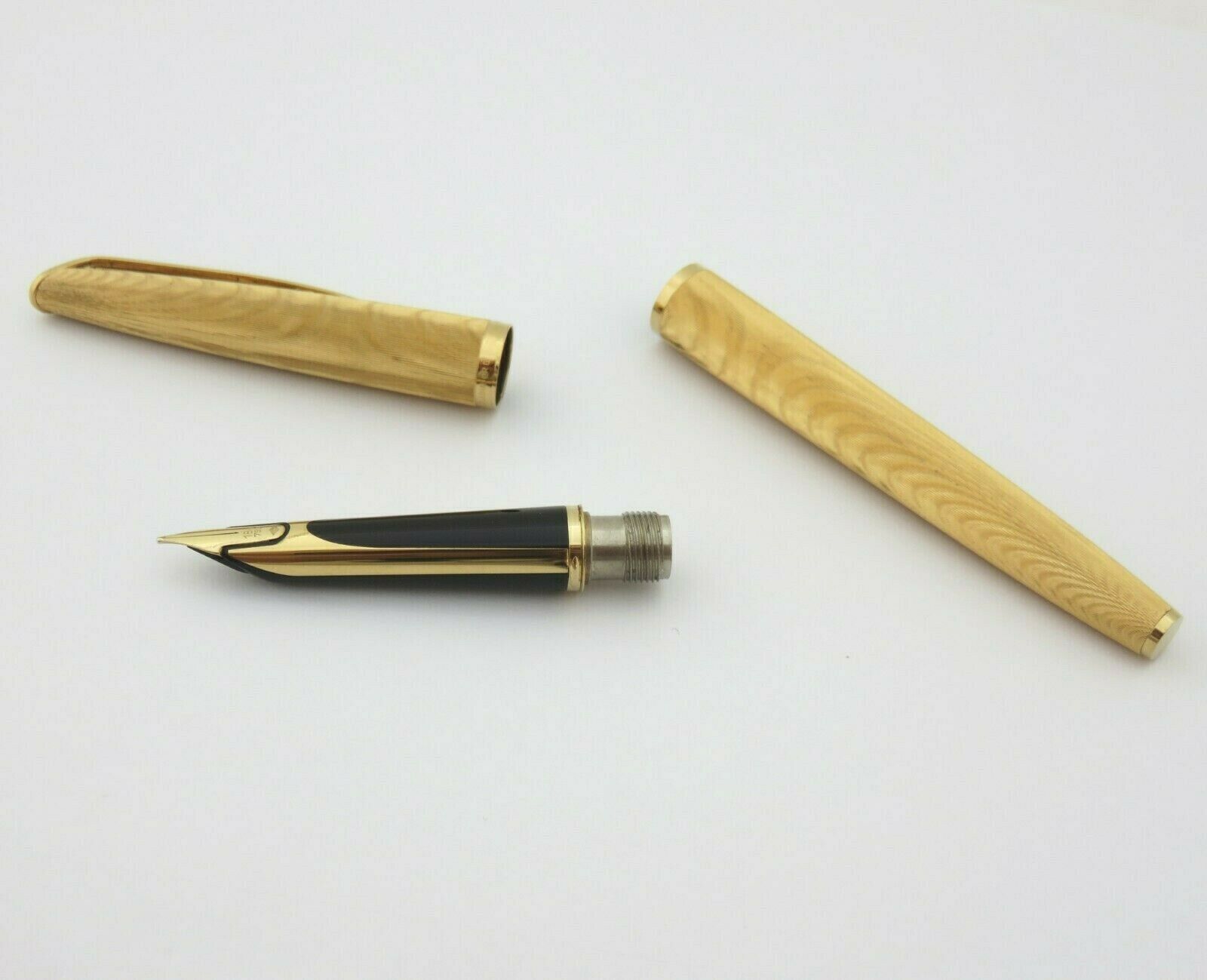 Fusto e cappuccio sono rivestiti di lamina d'oro, il pennino è d'oro 18k ed il modello è simile a quello della foto che allego, scaricata da internet (non mi è possibile allegare la foto di quella esposta nel suddetto negozio).