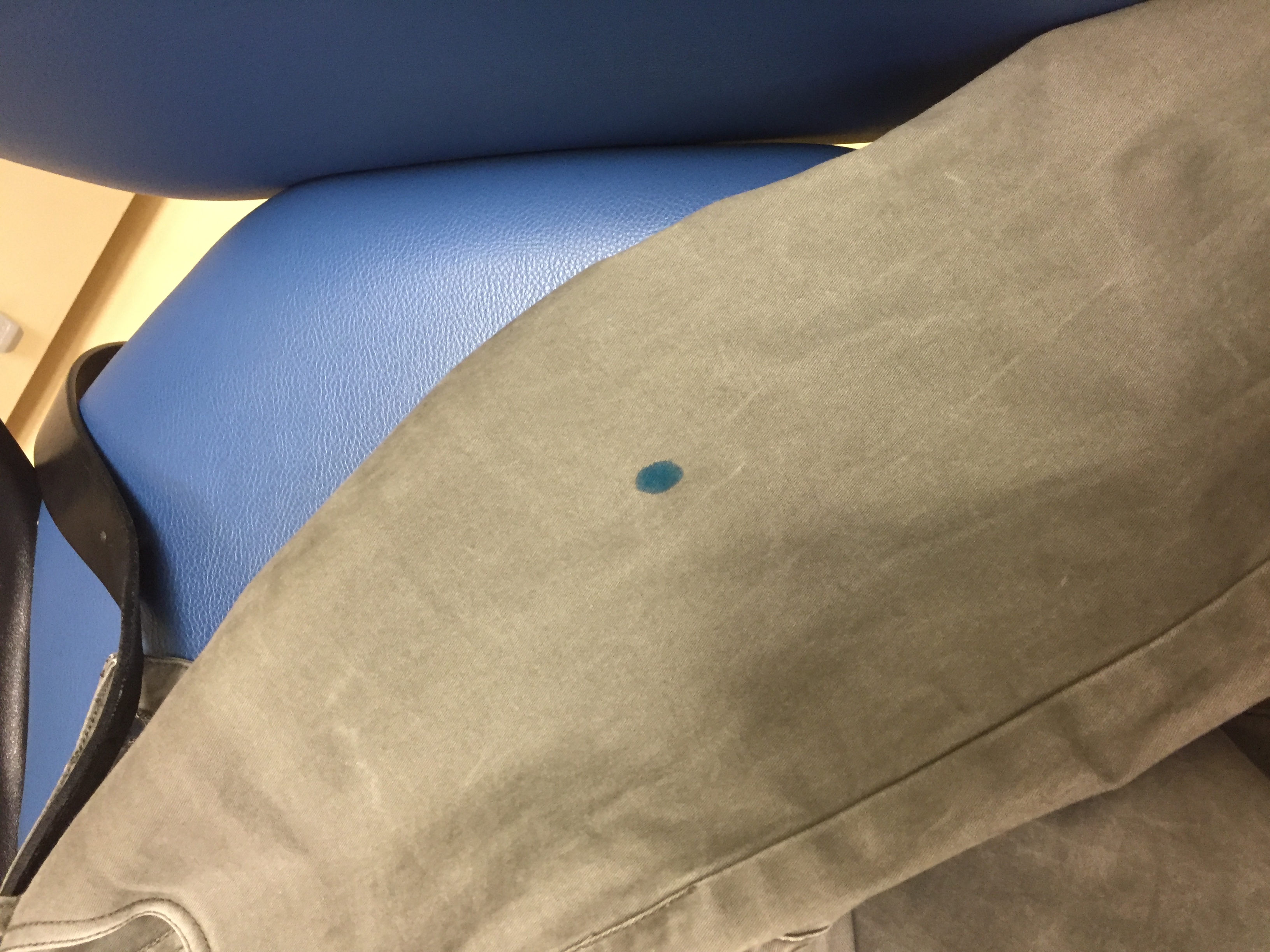 Vistosa macchia color Turchese Columbus sui pantaloni.