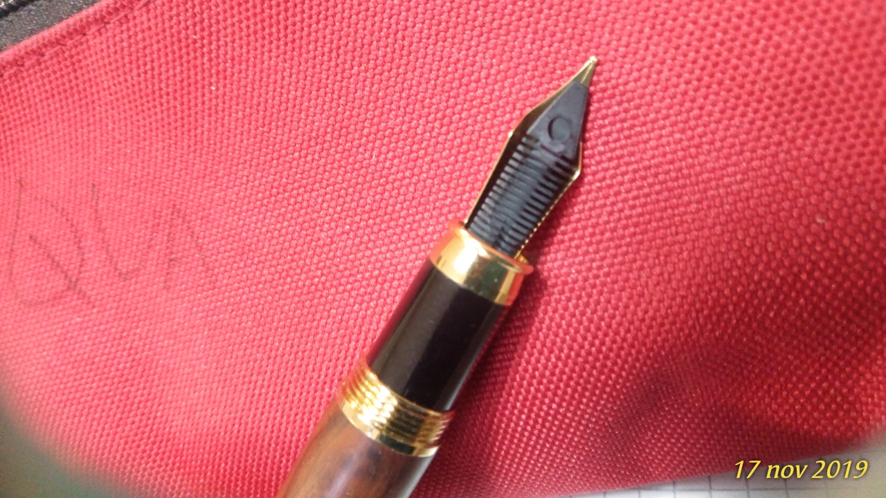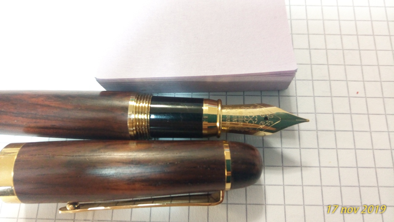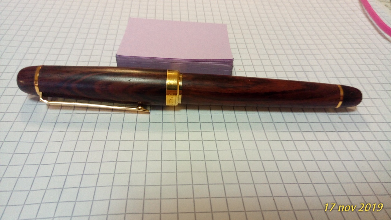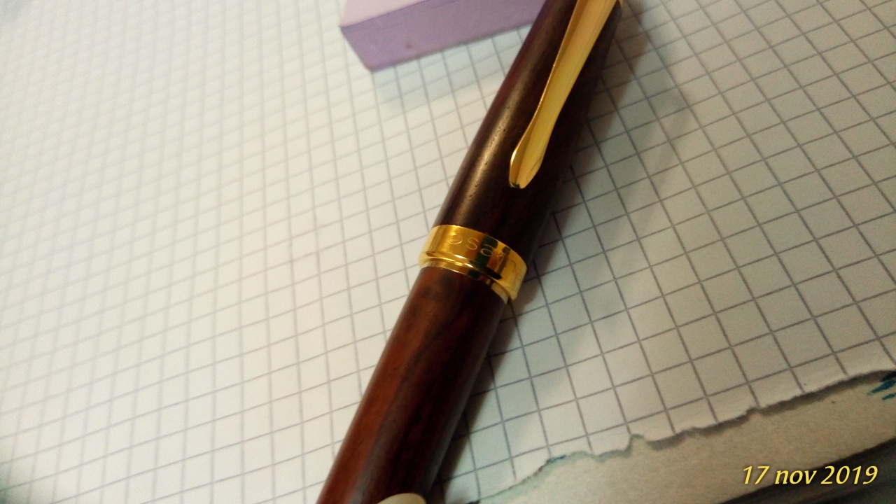 In più non so che inchiostro metterci e mi sarebbe piaciuto variare rispetto al classico blu reale in cartuccia; nè ho idea di come dovrei pulire la stilografica se si macchia con l'inchiostro, visto che ha il corpo in legno. Pensavo a qualche Diamine tipo il Chocolate Brown o il Sepia R&K o l'Alt Bordeaux sempre R&K, ricaricando la cartuccia con la siringa.