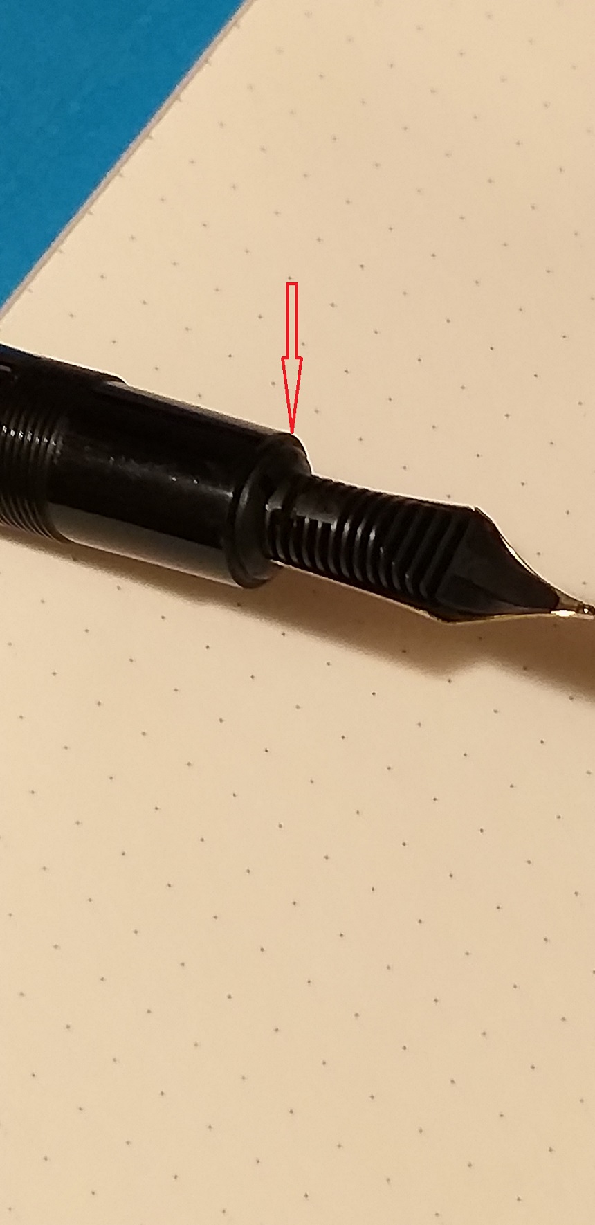 Quello è tutto un pezzo con la boccola dove sono inseriti condotta e pennino e che è avvitata nella sezione, la quale viene proprio tenuta in posizione da tale boccola essendo posta ad incastro nel fusto. La boccola è avvitata tra l'altro con una specie di silicone rosa ottenuto mescolandolo con uno bianco.