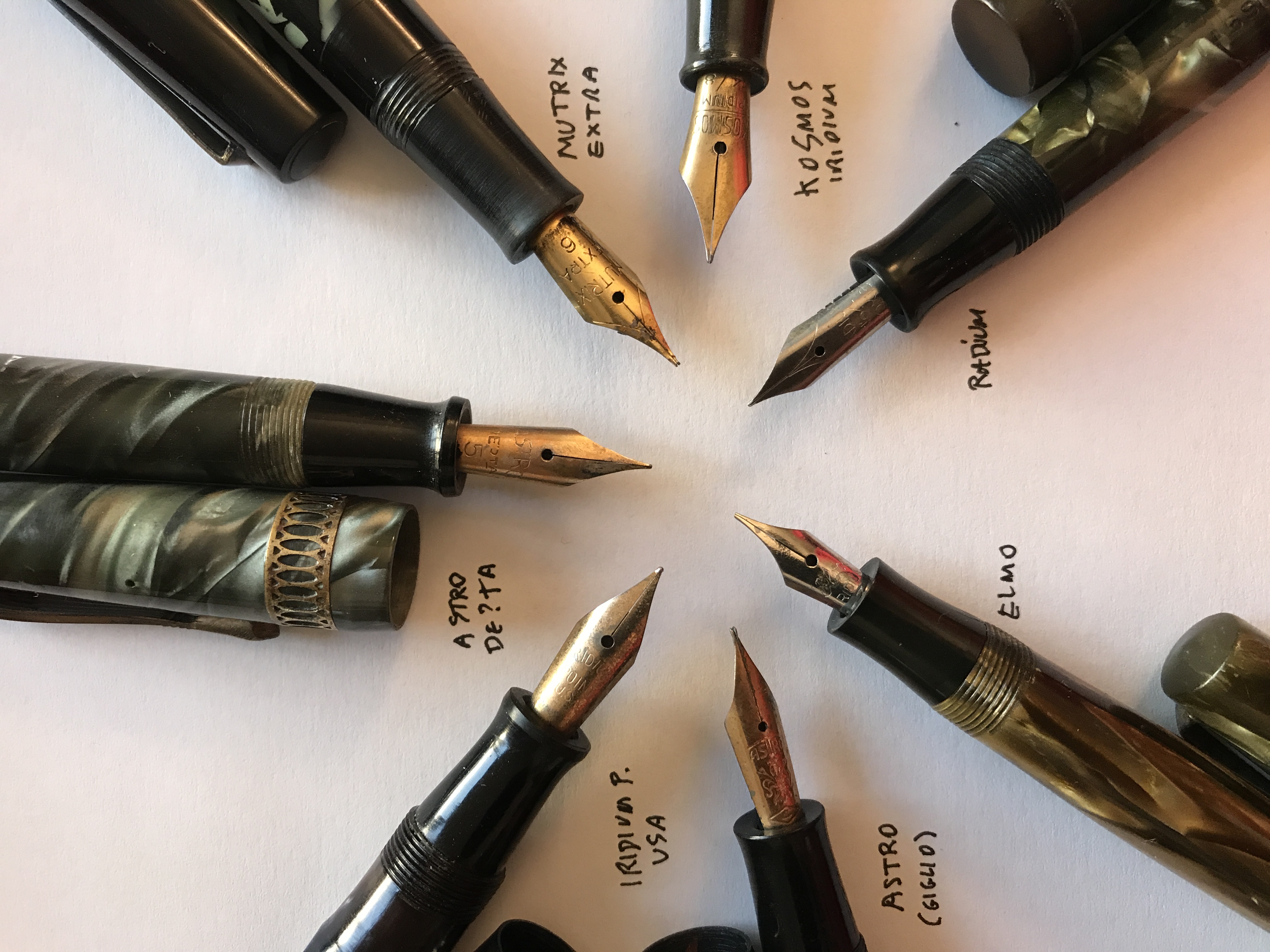 A quello che ho capito i vecchi pennini che si trovano sulle anonime italiane sono ancora più anonimi delle penne. Ho trovato questi in foto sulle mie anonime, immagino non ci siano notizie su di loro. O no? (Forse quello a ore 7 proviene da una Montegrappa?)