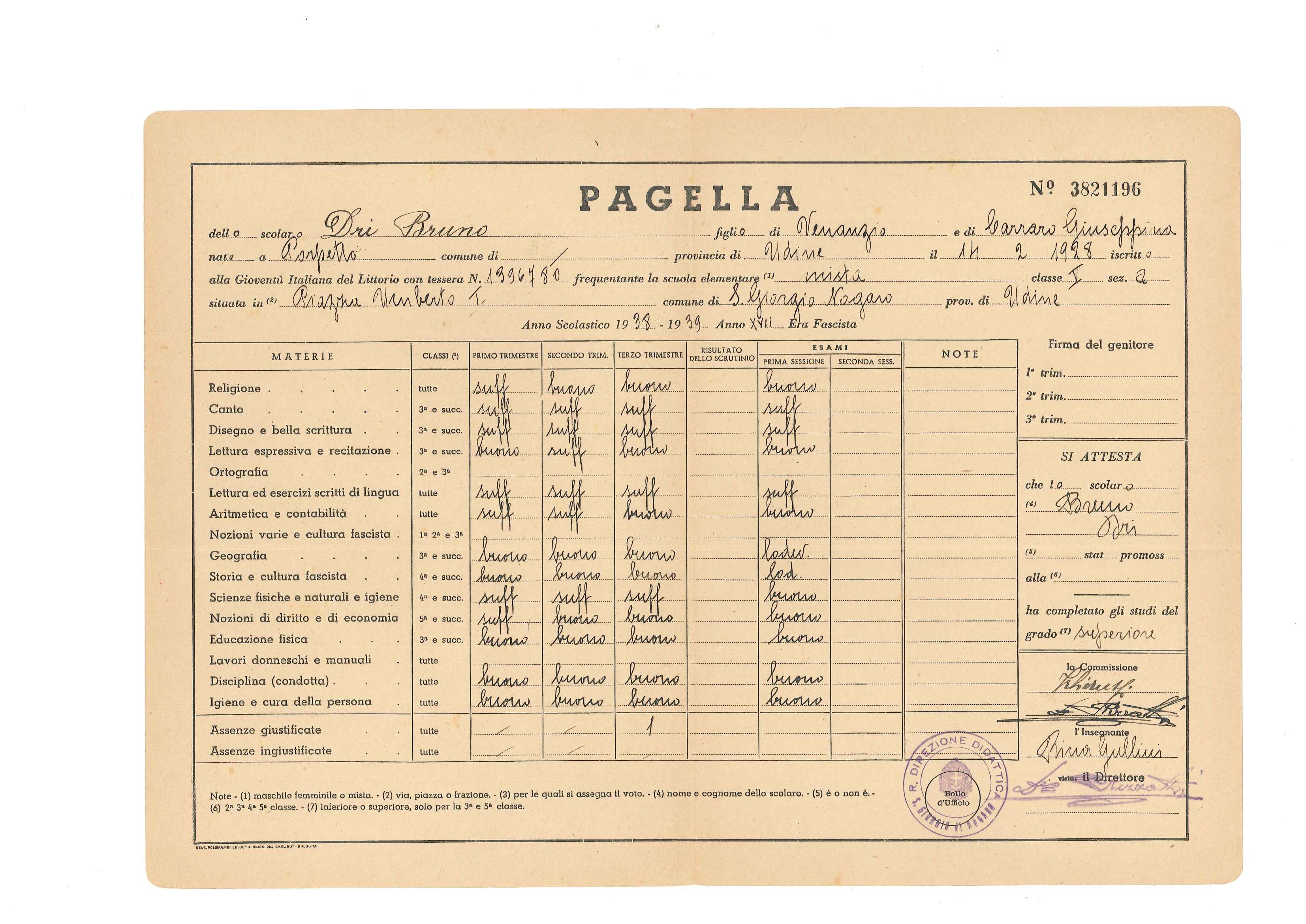 Buongiorno a tutti, prendo lo spunto di questo invio da un fatto di qualche giorno fa quando mio nipote mi chiese l'aiuto per scaricare la pagella elettronica di suo figlio che frequenta le elementari (le chiamo ancora così) dal sito della scuola.E' più facile andare sulla luna. Le mie erano cartacee e, sia la consegna che la visione ai genitori erano momenti che davano una certa emozione. Dal solito baule ho prelevato la pagella di mio zio, anno scolastico 1938 - 39, per farvi vedere come venivano compilate a mano dall'insegnante. Il "Babo" Bruno passò quasi tutta la sua vita missionario in Pakistan Orientale ora Bangladesh.