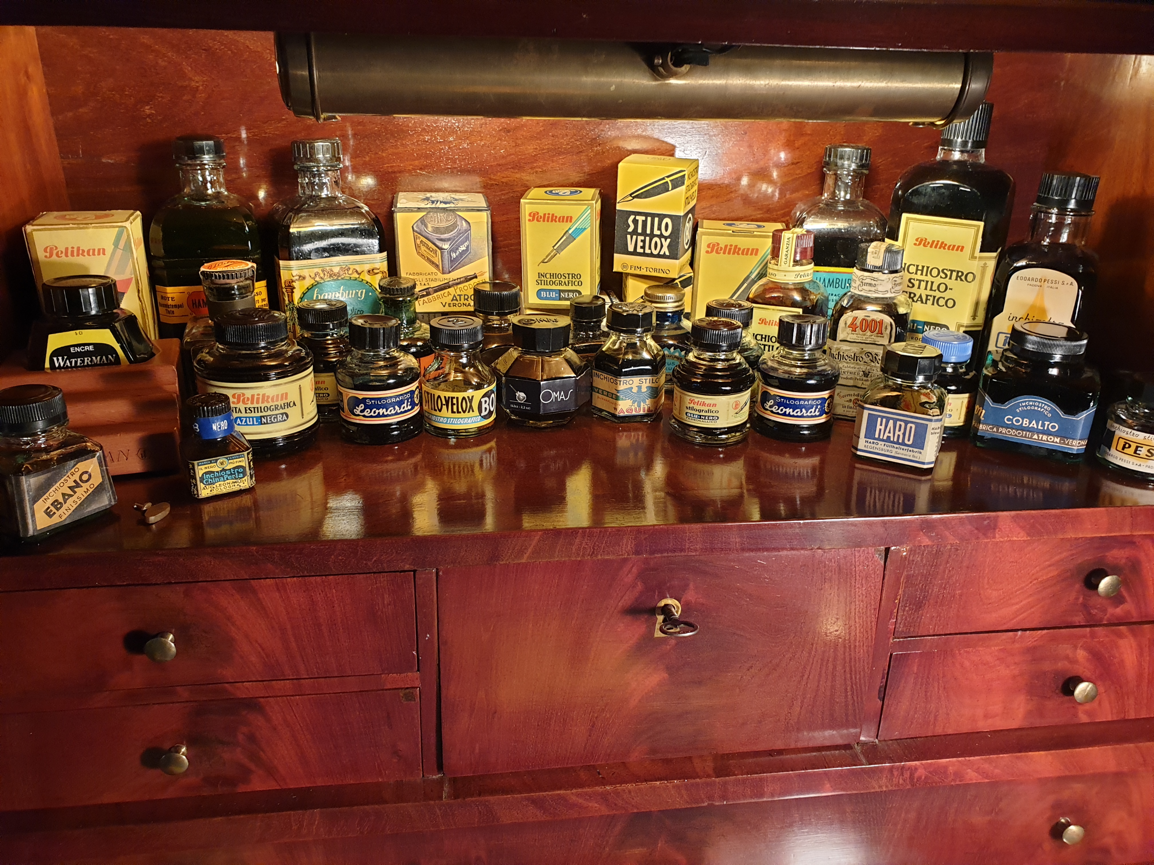 Amo anche tutto quello che circonda il mondo stilo , per es. gli inchiostri , nuovi che mi piace acquistare per un utilizzo immediato oppure vintage che colleziono come segno della storia meno recente dei vari marchi , internazionali ed italiani , maggiori e minori , oltre ai volumi che descrivono storia ed evoluzione delle aziende e dei loro modelli di penne nel tempo.