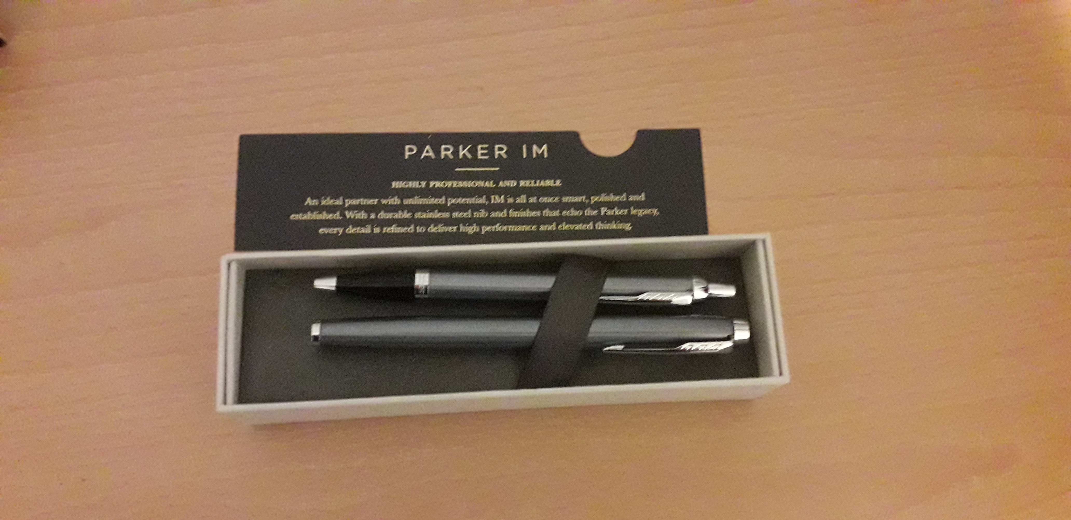Vi mostro anche io l'ultima accoppiata comprata, la Parker IM biro e stilogragica di colore grigio-azzurro.