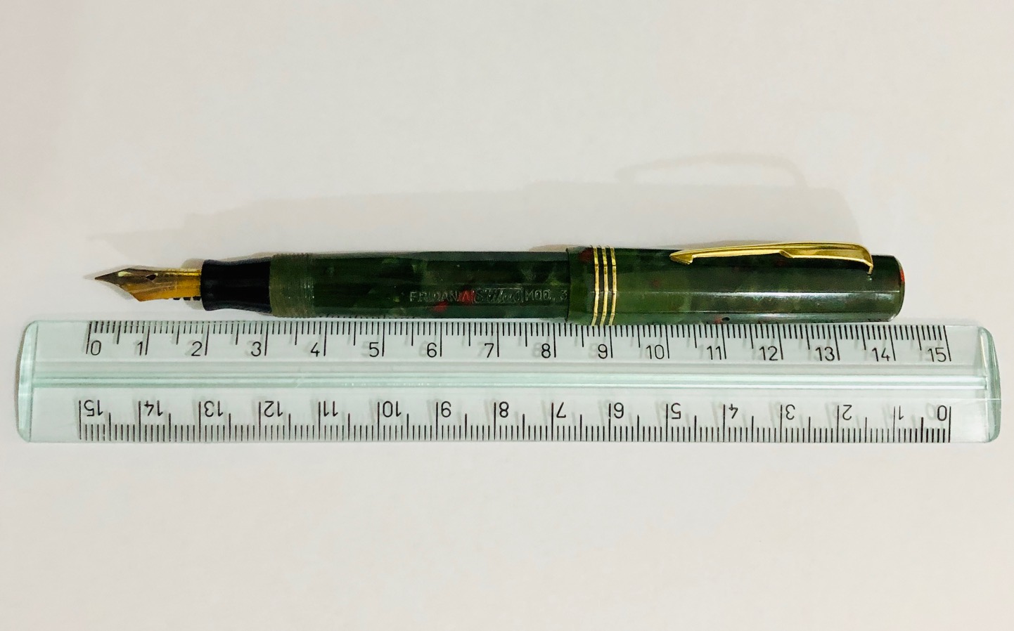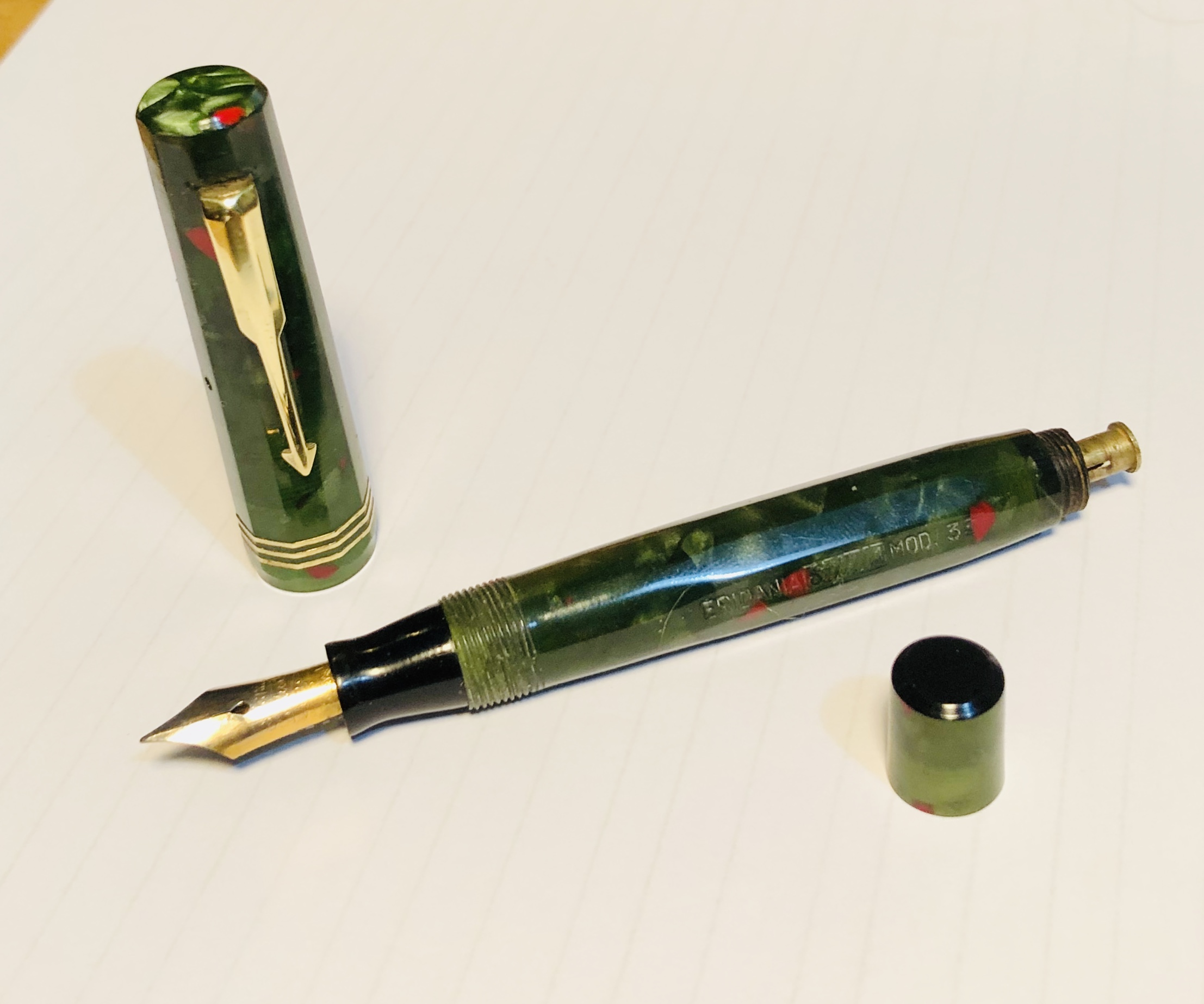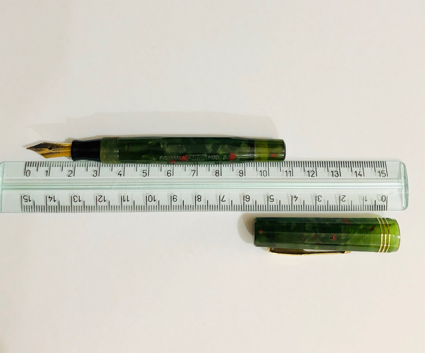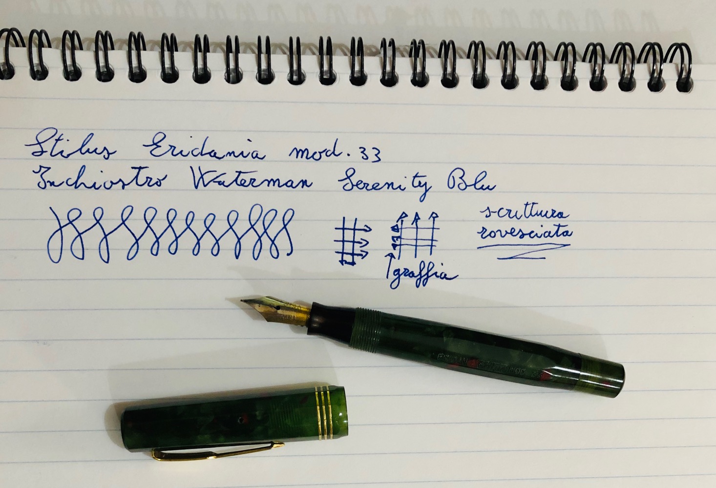 La penna e’ quella che ho comprato al Pen Show di Napoli, previa preziosa indicazione di Piccardi (grazie!), ed è una Eridania stilus mod. 33 di celluloide con livrea marmorizzata verde e rossa