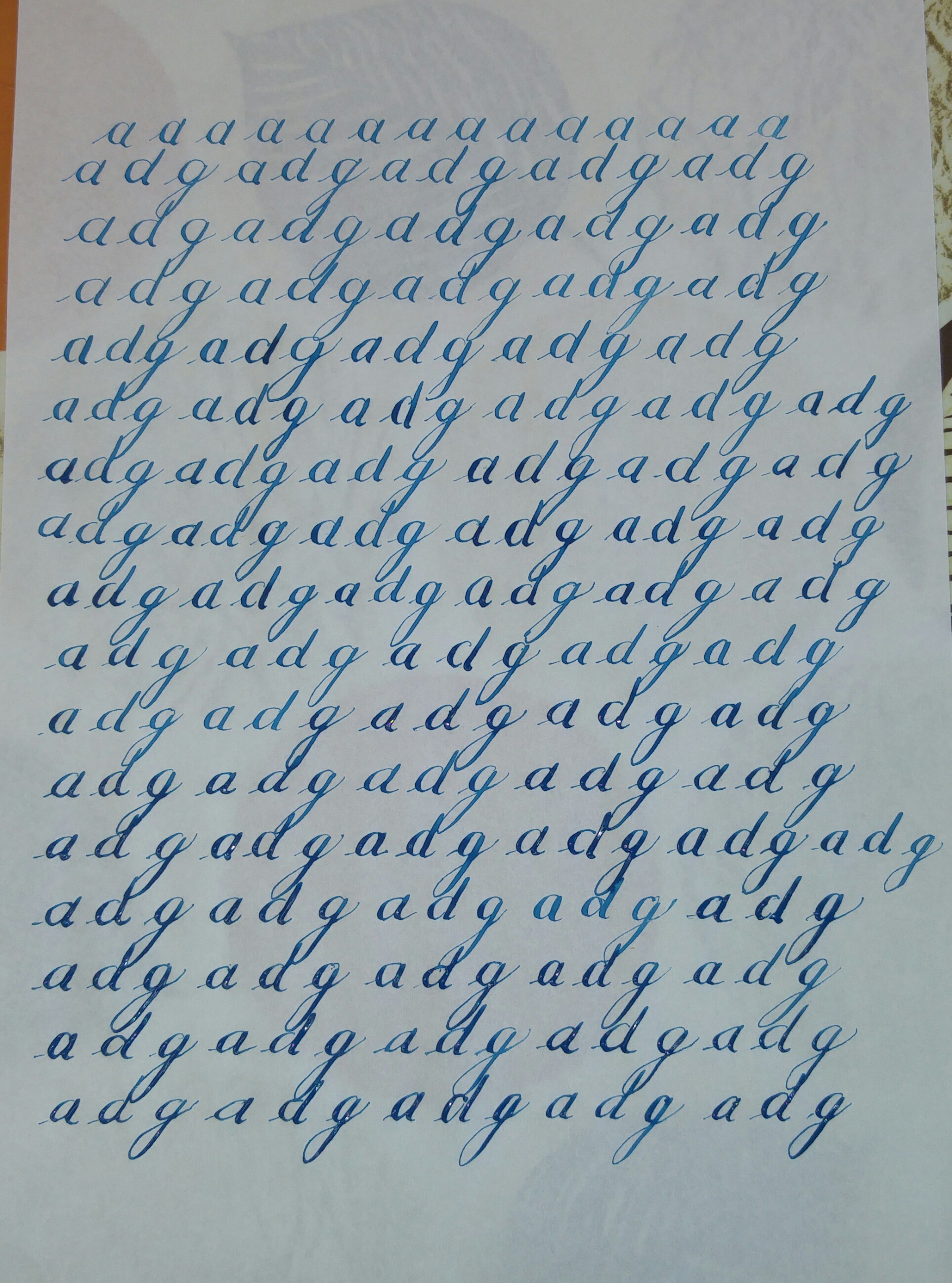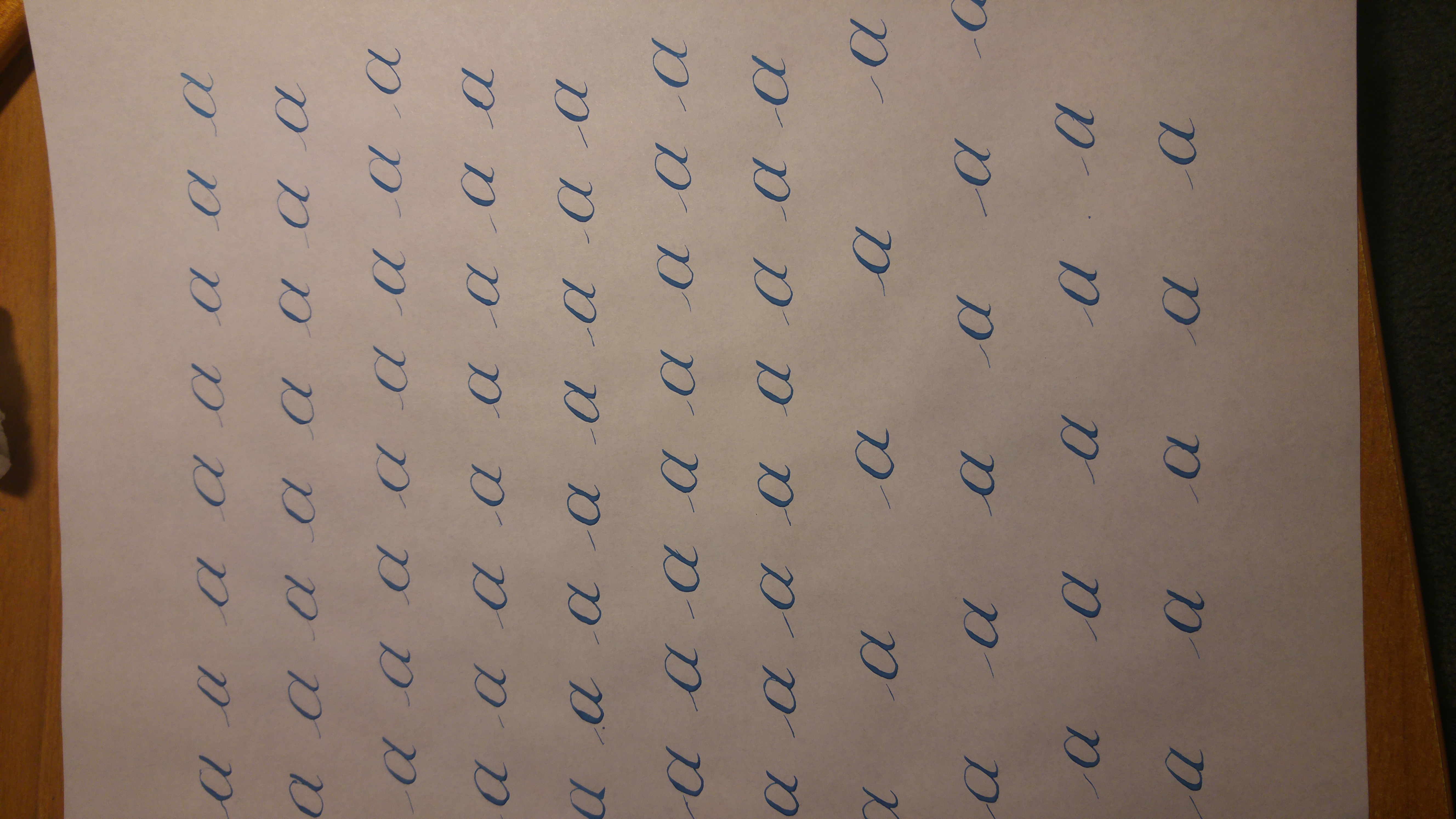 Posso chiederti che pennino utilizzi? Forse ti concede anche una maggiore dimensione delle lettere, e sarebbe un bene per imparare a calibrare il passaggio fra linee spesse e sottili.