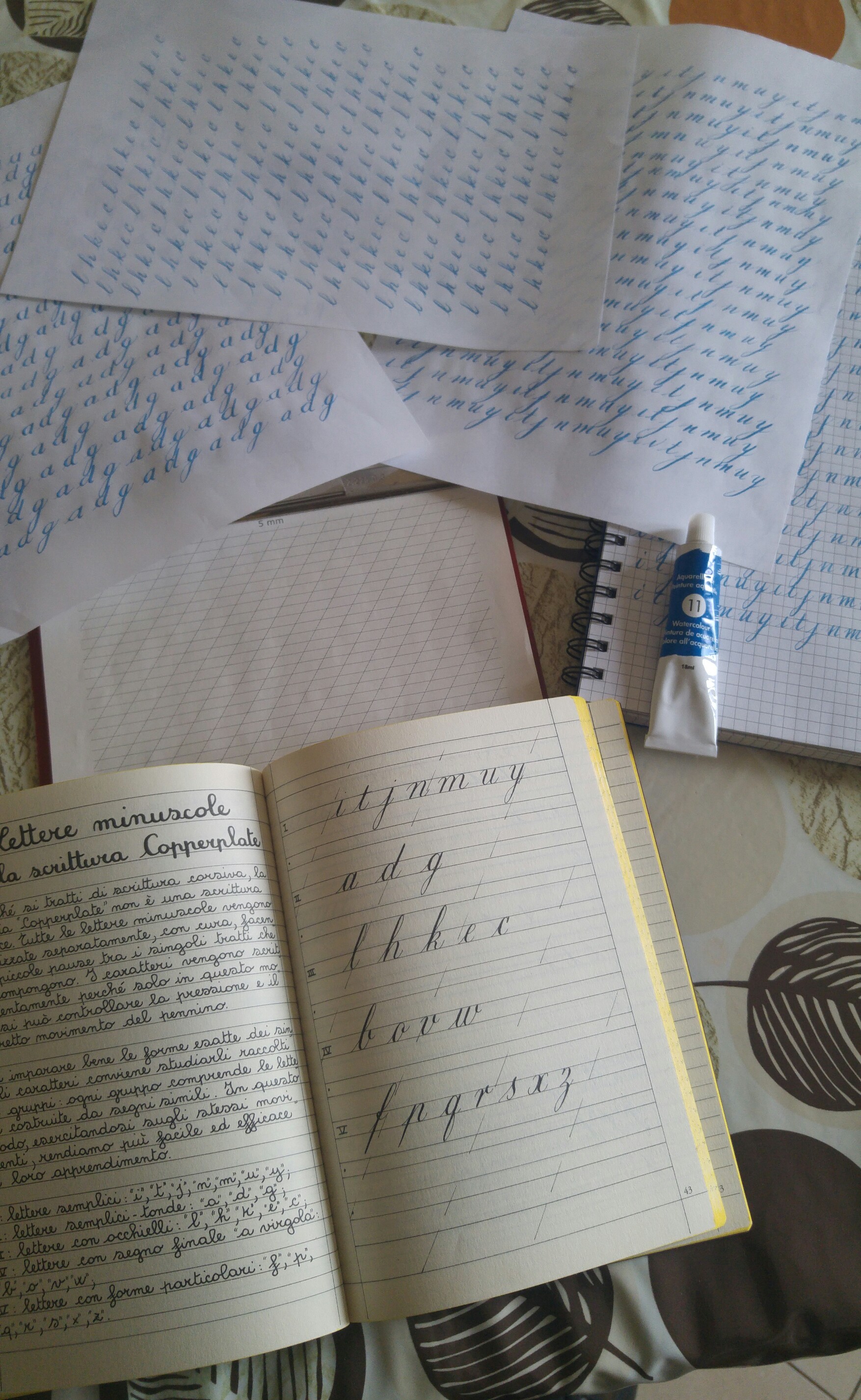 consiglio da auto didatta, quindi non so quanto sia corretto, io prenderei come riferimento le linee della falsariga, almeno hai dei riferimenti di inizio e fine, poi quando hai acquisito una po’ di familiarità provi la figura nello spazio tra le diagonali.