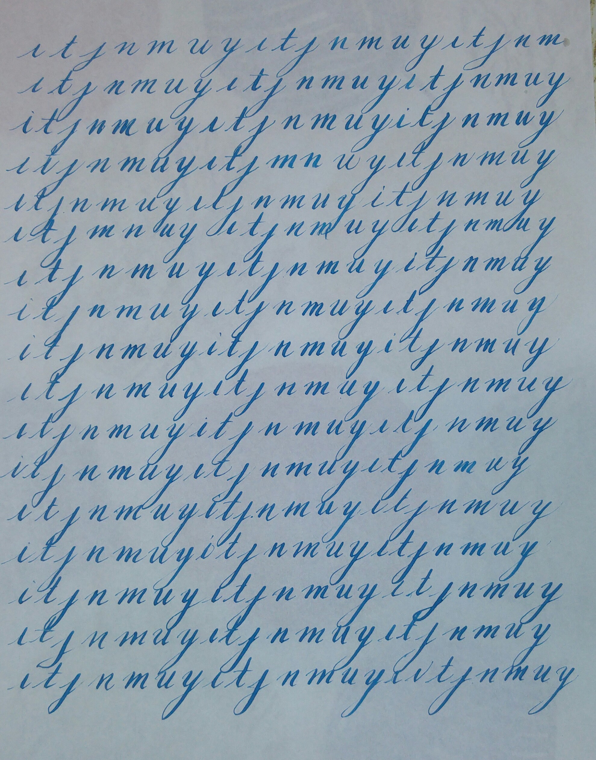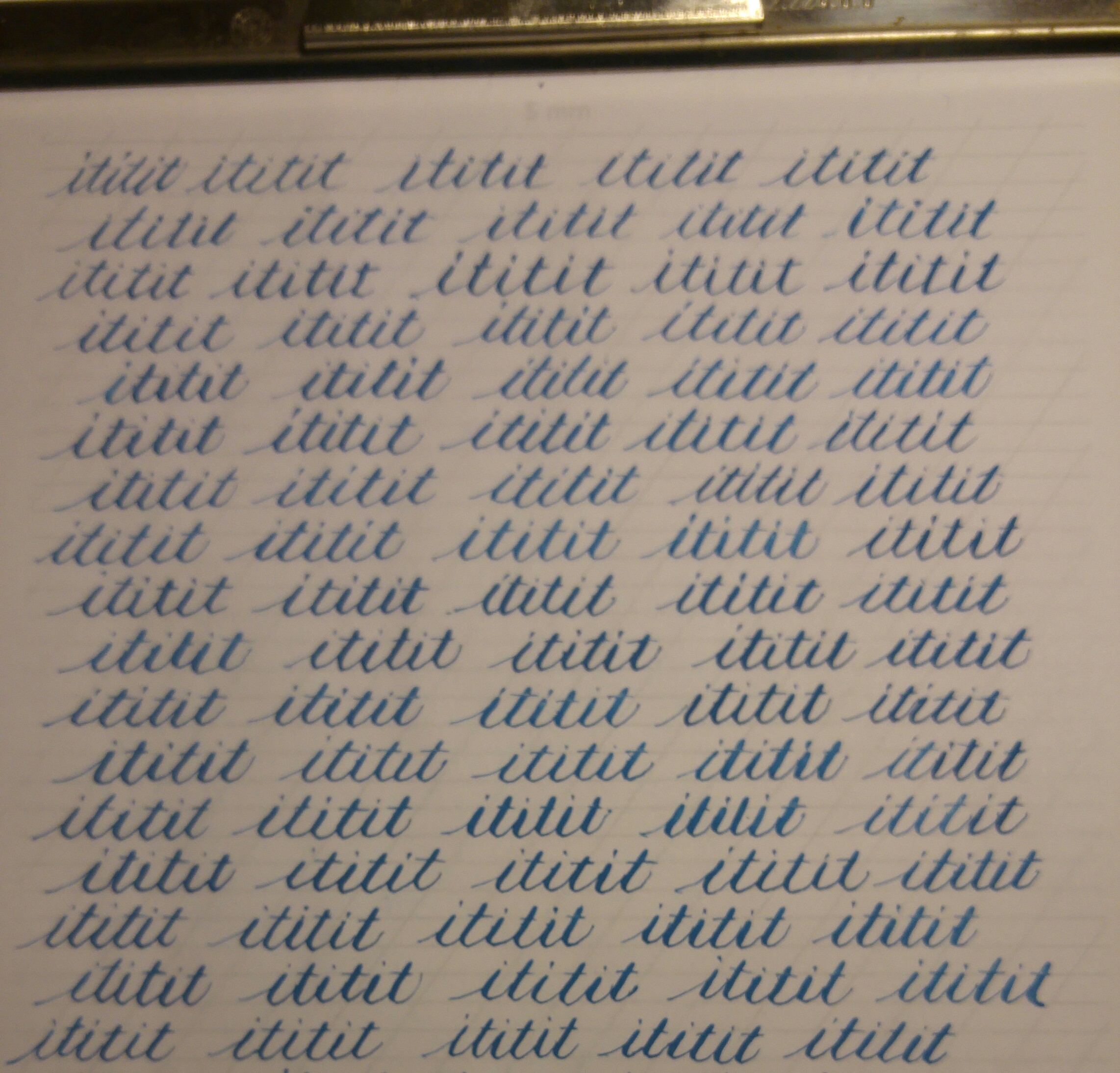 - In generale: lascia spazio tra le righe e quando ripeti le stesse lettere per esercizio, lascia abbondante spazio fra le singole lettere; le lettere isolate si analizzano meglio e non si influenzano a vicenda mentre scrivi, lo stesso vale per le righe di scrittura. Usa il rapporto "corretto" delle altezze (3,2,3). Metti i "puntini" sulle i: sempre uguali, sempre alla stessa altezza, e "disegnati" (non il semplice appoggio della punta del pennino). anche i "tagli" della t, falli come vuoi ma in una serie falli sempre uguali. Memorizza altezze diverse per "b, f, h, k, l, " (altezza massima), per "d" (per esempio 2/3 del massimo ascendente), per "t" (per esempio 1/3 del massimo ascendente): allo stesso modo "f, g, j, y" massimo discendente, "p, q" (per es. 2/3 del massimo discendente).