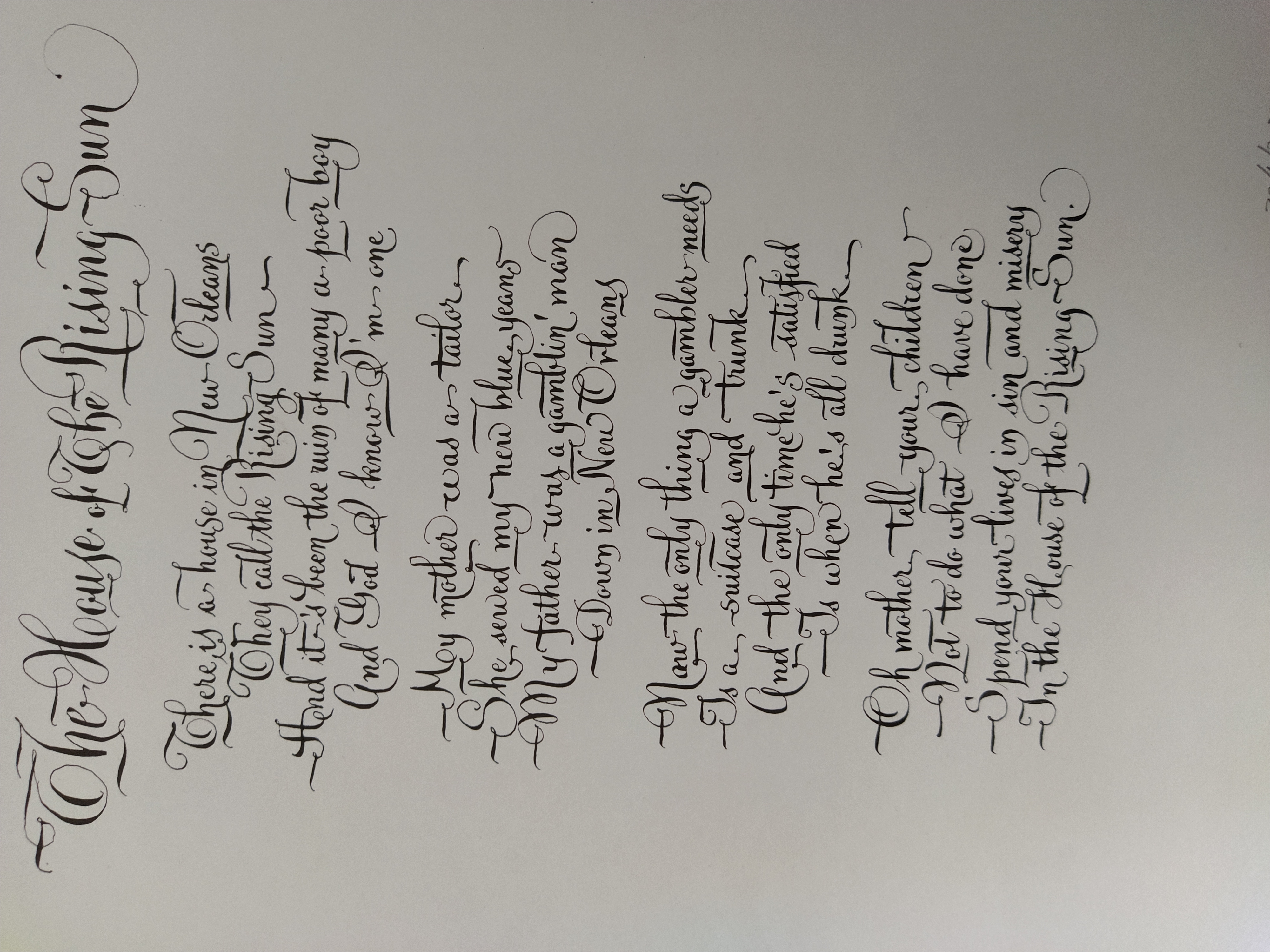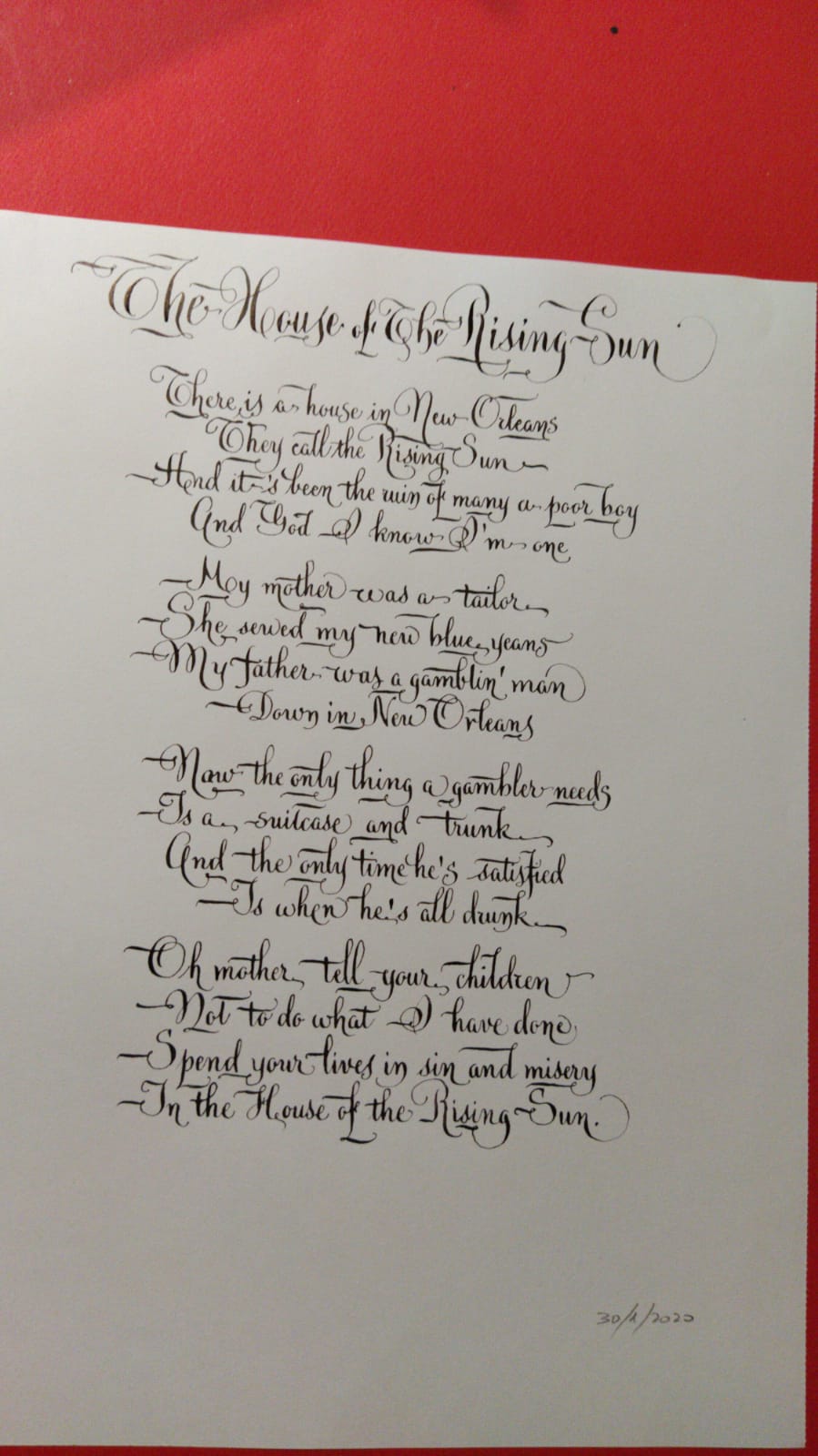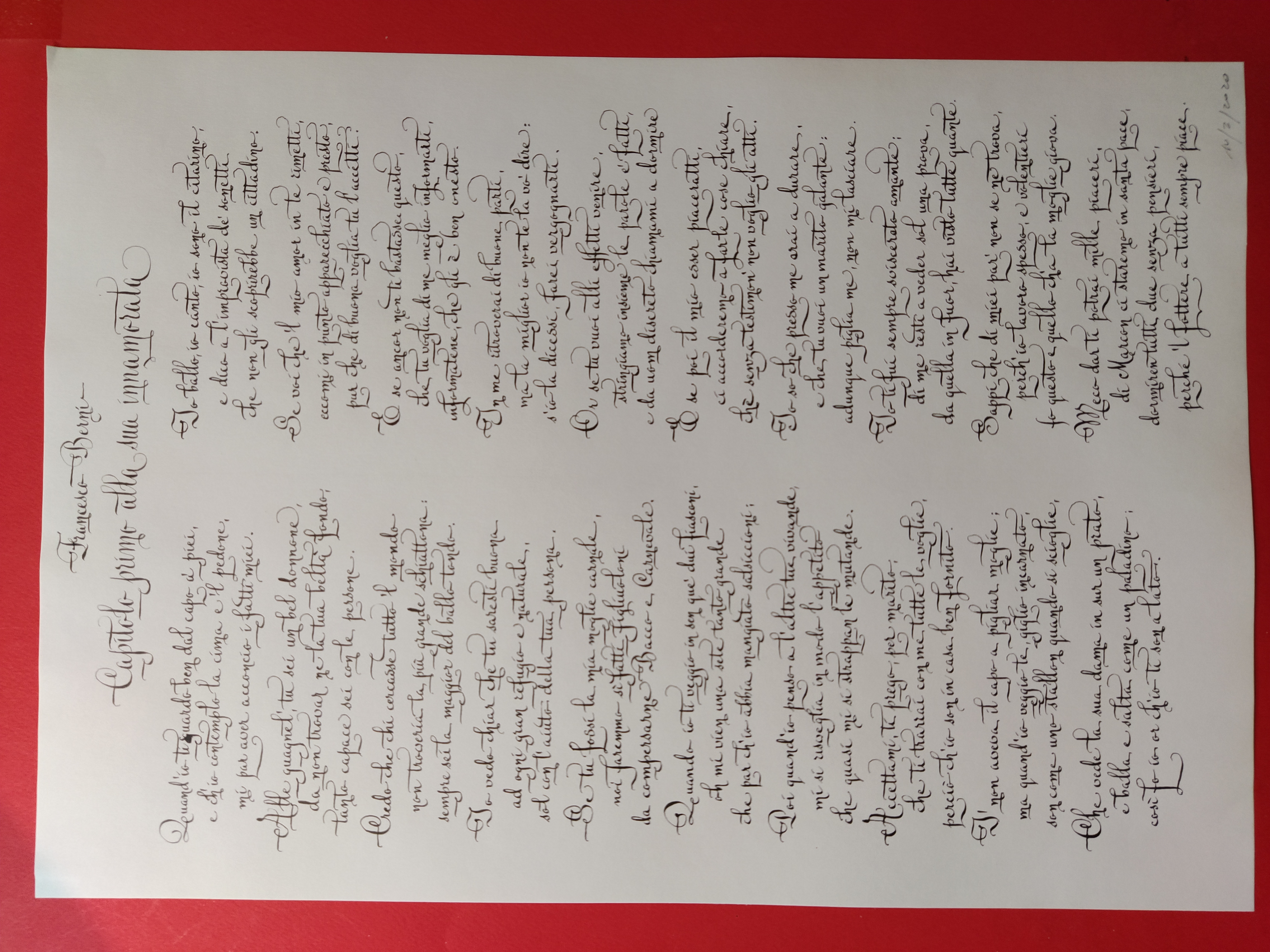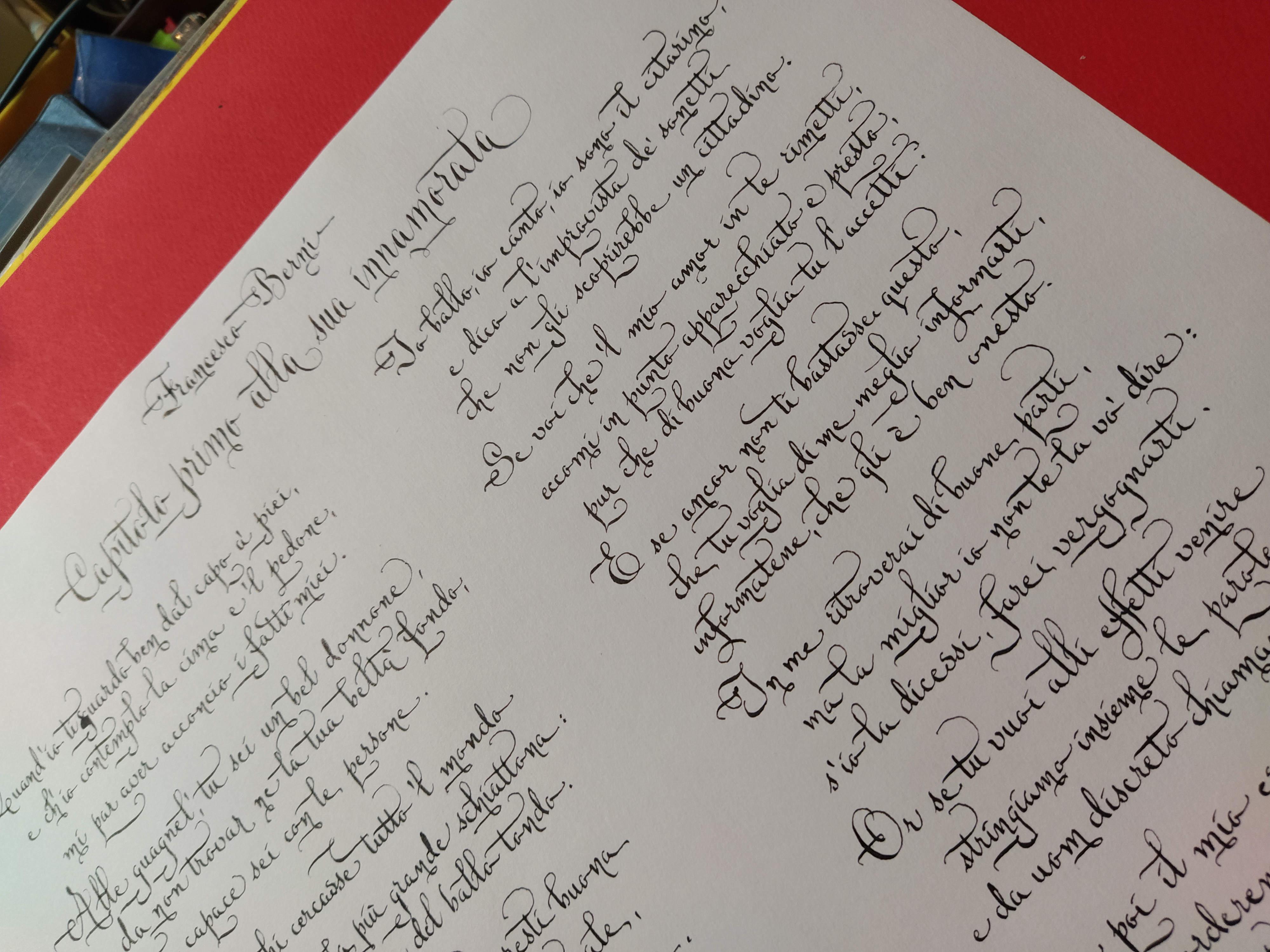 Rimanendo sullo "stile divertimento", per verificare l'effetto su un formato A3 con diversa impaginazione, fo scelto questo componimento della prima metà del '500 che come lunghezza poteva starci. L'effetto mi sembra gradevole e, in qualche modo, adatto al componimento; la scrittura è molto semplice e assolutamente libera da rigidi formalismi, naturalmente con l'ausilio di una falsariga per mantenere la corretta struttura a terzine e i dimensionamenti della linea di scrittura per far stare tutto nella pagina; una linea di mezzeria a matita per dividere in due colonne e il resto libero.