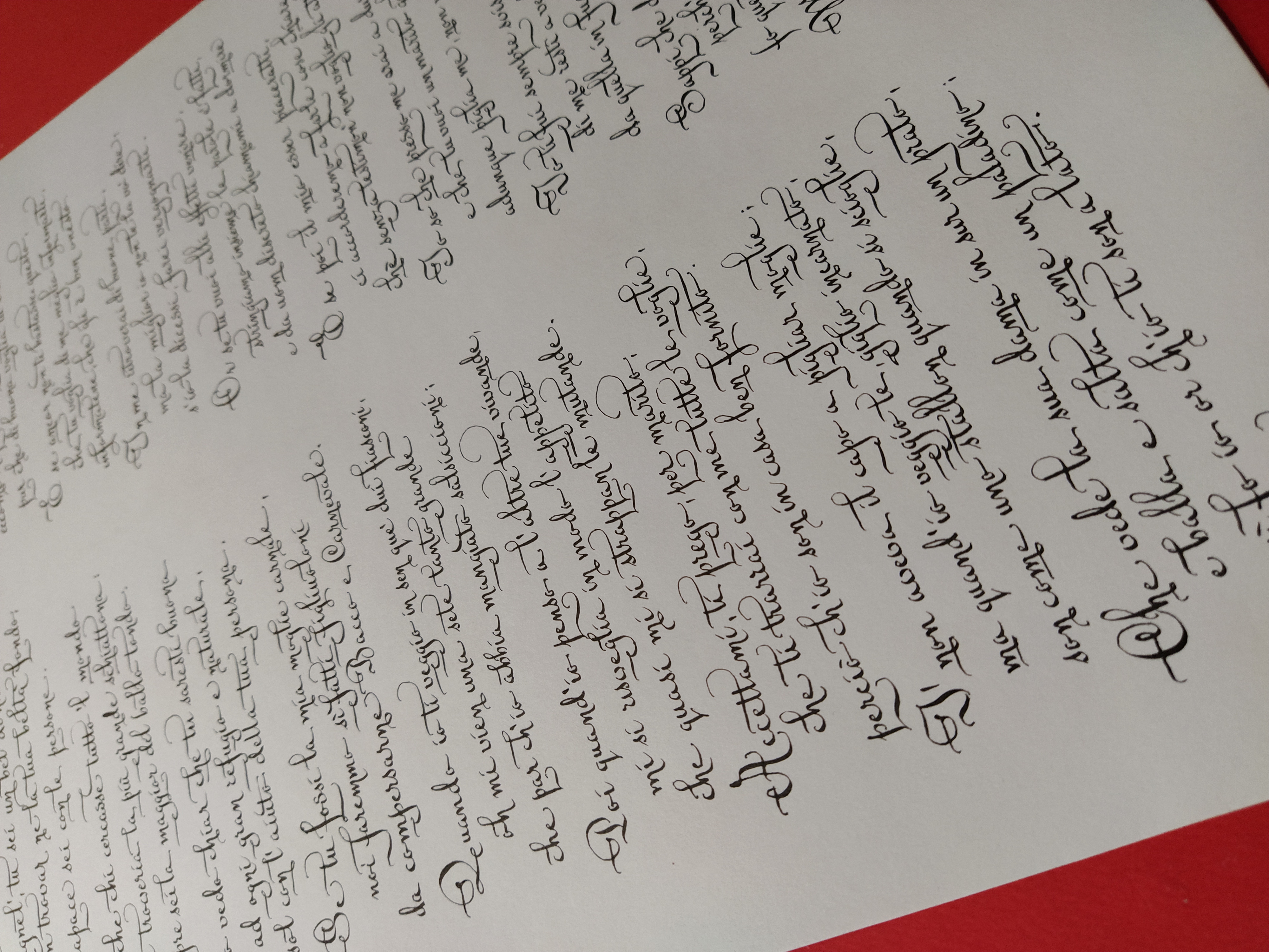 calli1958 ha scritto: giovedì 6 febbraio 2020, 13:39 Qualche giorno fa un piccolo attacco di inchiostrite mi ha portato a mettermi a scrivere "liberamente" e "senza premeditazione"... ne è risultato uno scritto che, senza preoccuparmi di dimensionamenti particolari né di "forme" specifiche (tranne di aver linee dritte su cui scrivere>), mi pare abbia un colpo d'occhio gradevole nonostante la "effimera consistenza" della grafia: caratteri molto semplici, in qualche caso di libera interpretazione, con l'aggiunta di un po' di orpelli qua e là. Guardando senza osservare mi ricorda immagini di vecchi scritti; non so se questa impressione sia condivisa.