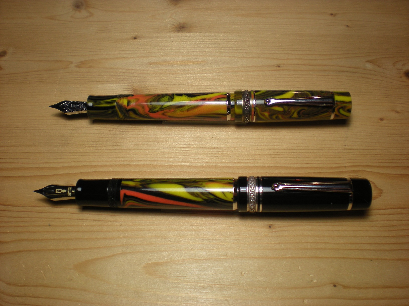 La Gallery ha un pennino 14K, gradazione M, mentre la Douè ha un pennino Fusion, gradazione F. Ho caricato le penne con un Waterman Blu Florida e fra i due non noto un'apprezzabile differenza di tratto. Quello che sorprende è la scorrevolezza del Fusion, all'altezza dei migliori pennini presenti sul mercato.