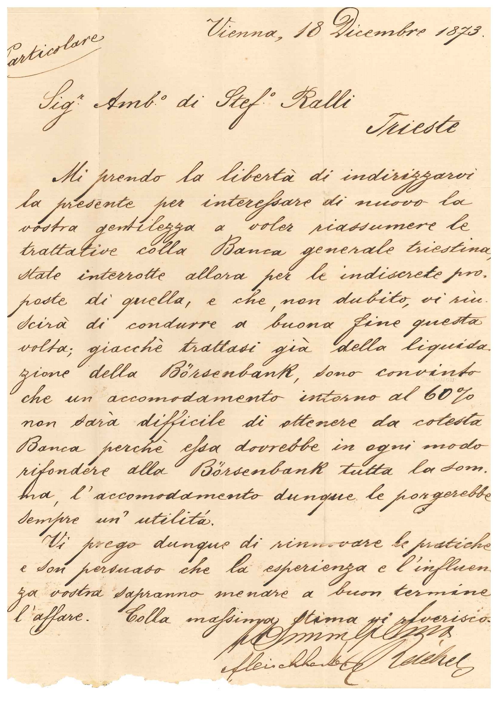 Trattasi di una lettera scritta nel 1873 per una trattativa bancaria.