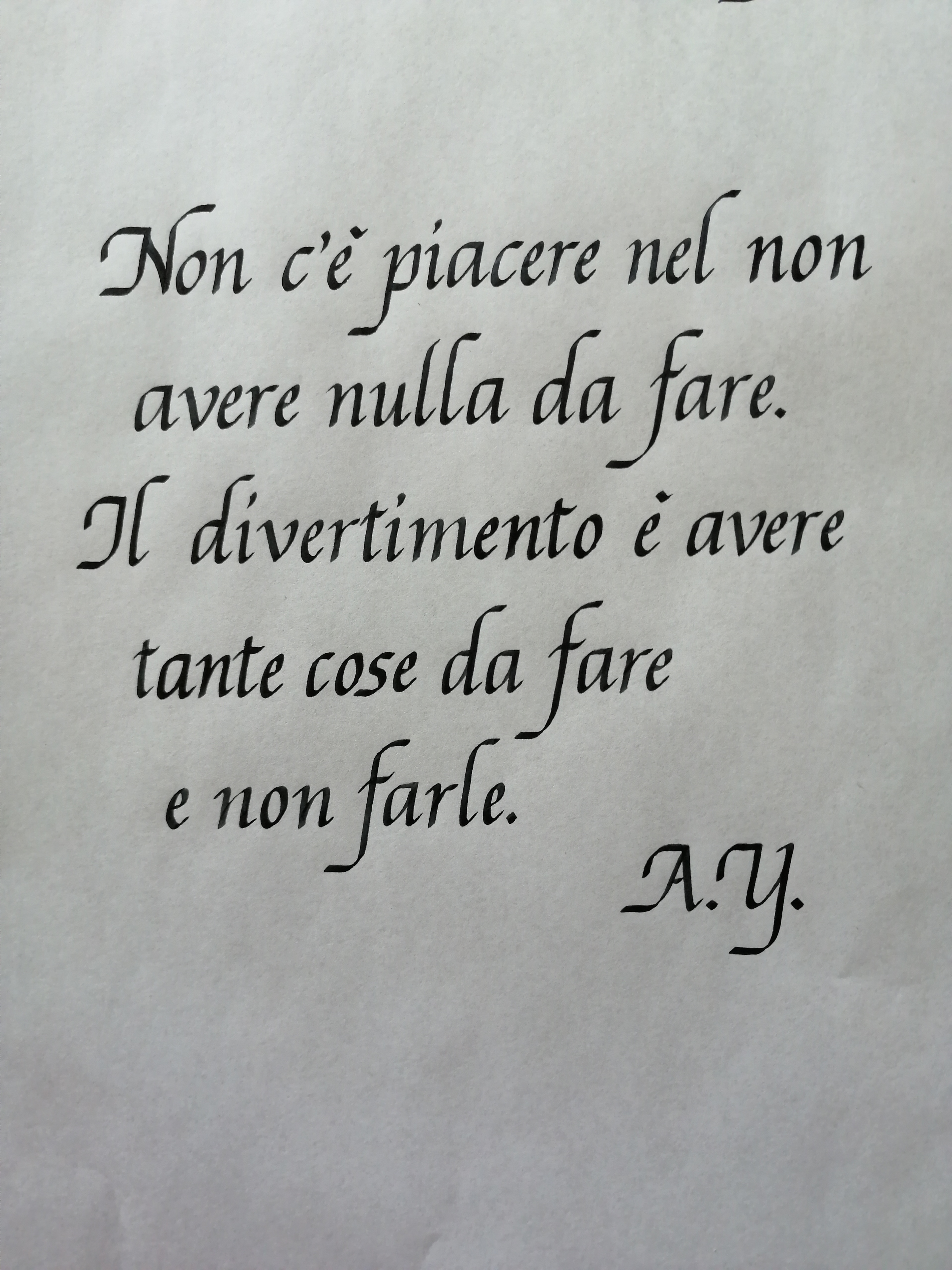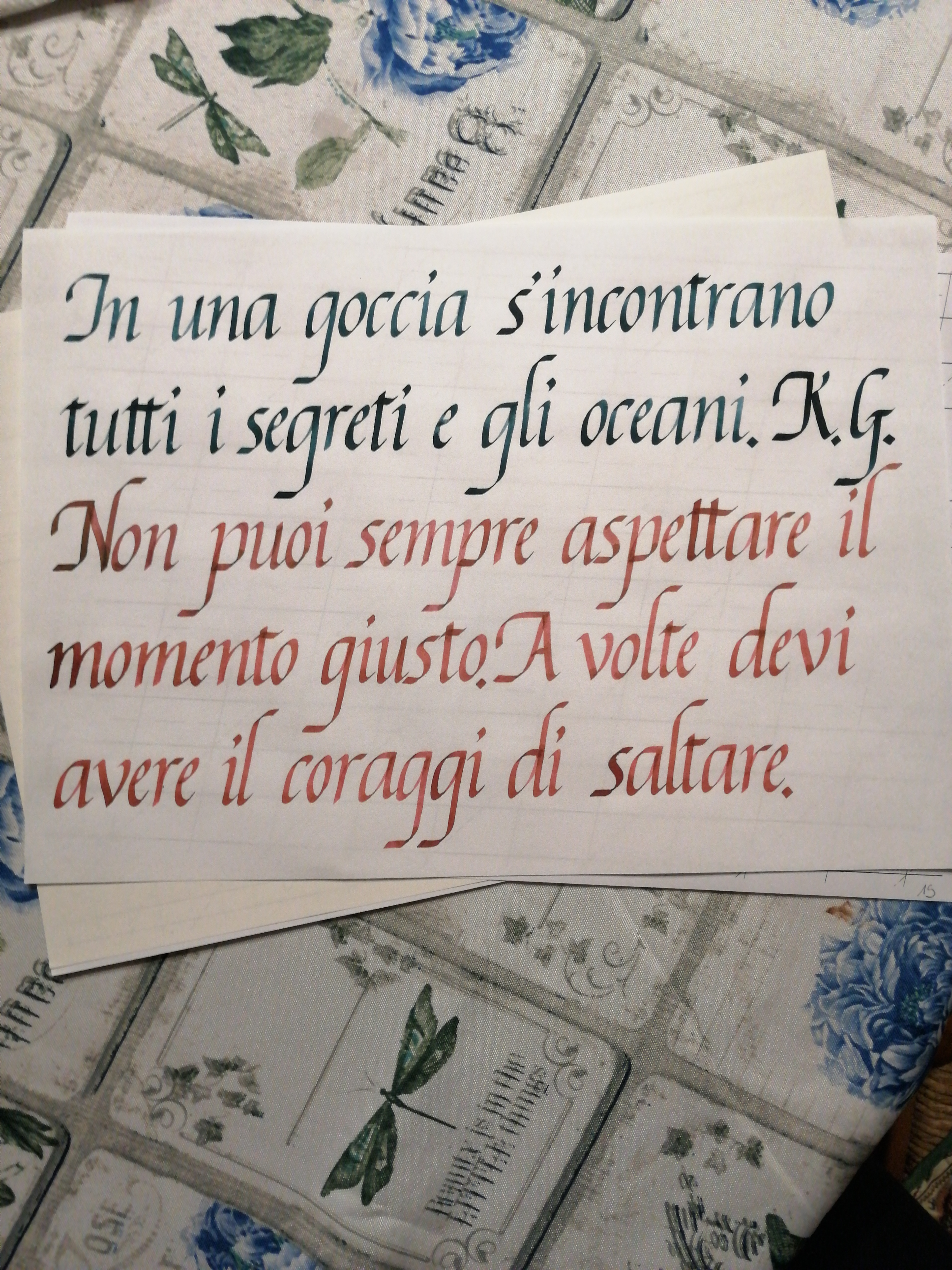 Dory ha scritto: ↑domenica 15 marzo 2020, 8:35Verissimo che nelle prove non ci si preoccupa dei margini, ma lasciare comunque un po' di spazio "facilita" l'effetto e l'analisi dello scritto, così da saper meglio regolarsi nelle prove successive e immaginare l'effetto finale, oltre eventualmente ad avere spazio per "provare" qualche estensione e decorazione (nel caso venisse voglia di farlo).calli1958 ha scritto: ↑sabato 14 marzo 2020, 22:00 Come sempre grazie dei consigli. Queste pagine sono quasi sempre esercizi senza altro scopo che la pratica quindi non mi preoccupo dei margini e uso gli inchiostri di cui ho disponibilità. La a é il mio punto debole ma continuo a lavorarci. Per i puntini e la distanza faró delle prove, avendo finito il corso non ho nessuno con cui confrontarmi e quindi vado a stima. Dove e come metteresti il punto?