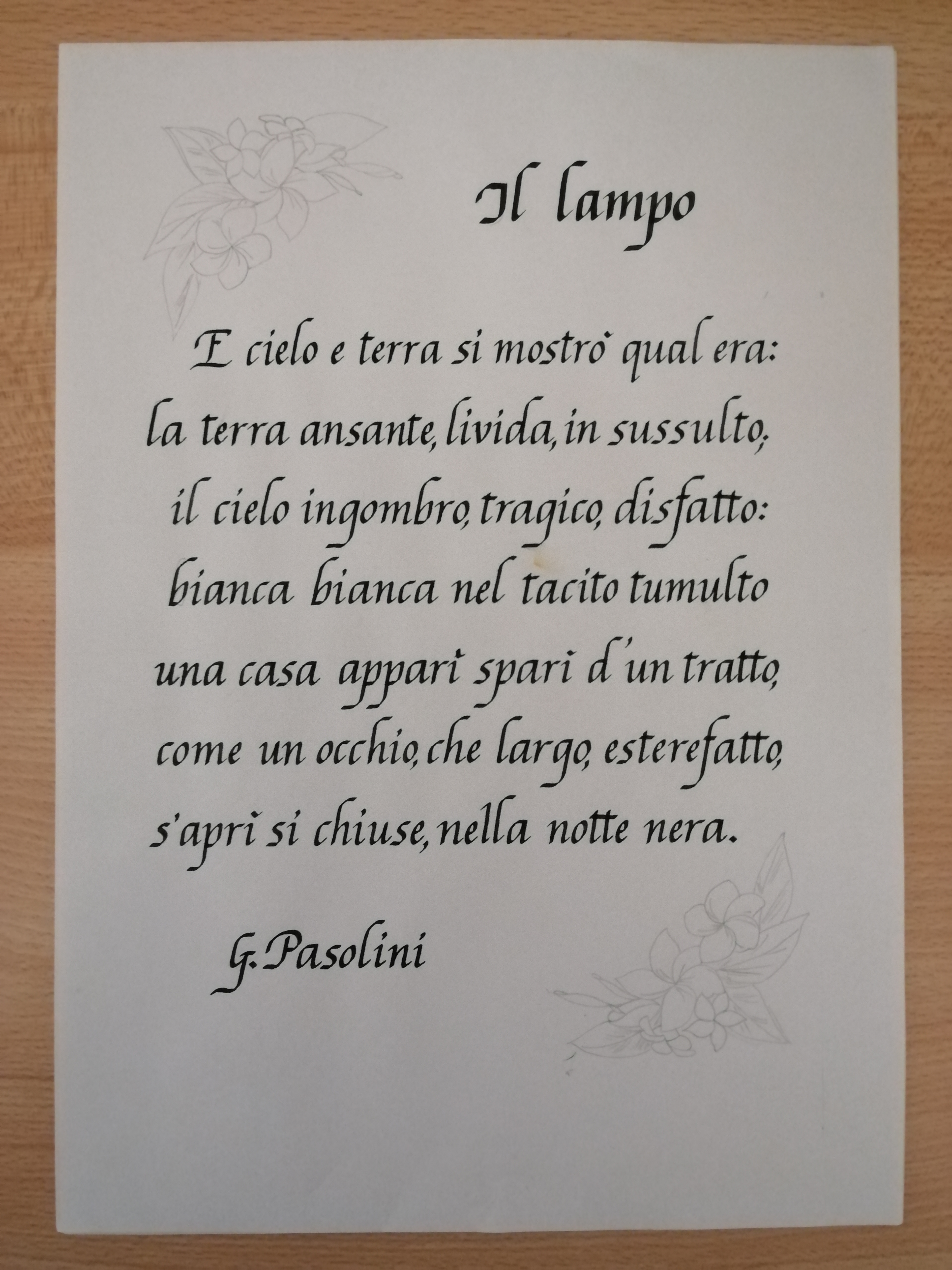 Ispirata da Calli1958 ho provato anch'io a fare una composizione un pó più articolata con una delle mie poesie preferite. Dopo tre prove cercando di non dimenticarmi lettere e di allineare decentemente il testo questo é il risultato (all'ultimo ho macchiato il foglio, ma non ce la potevo fare a riscrivere tutto di nuovo).