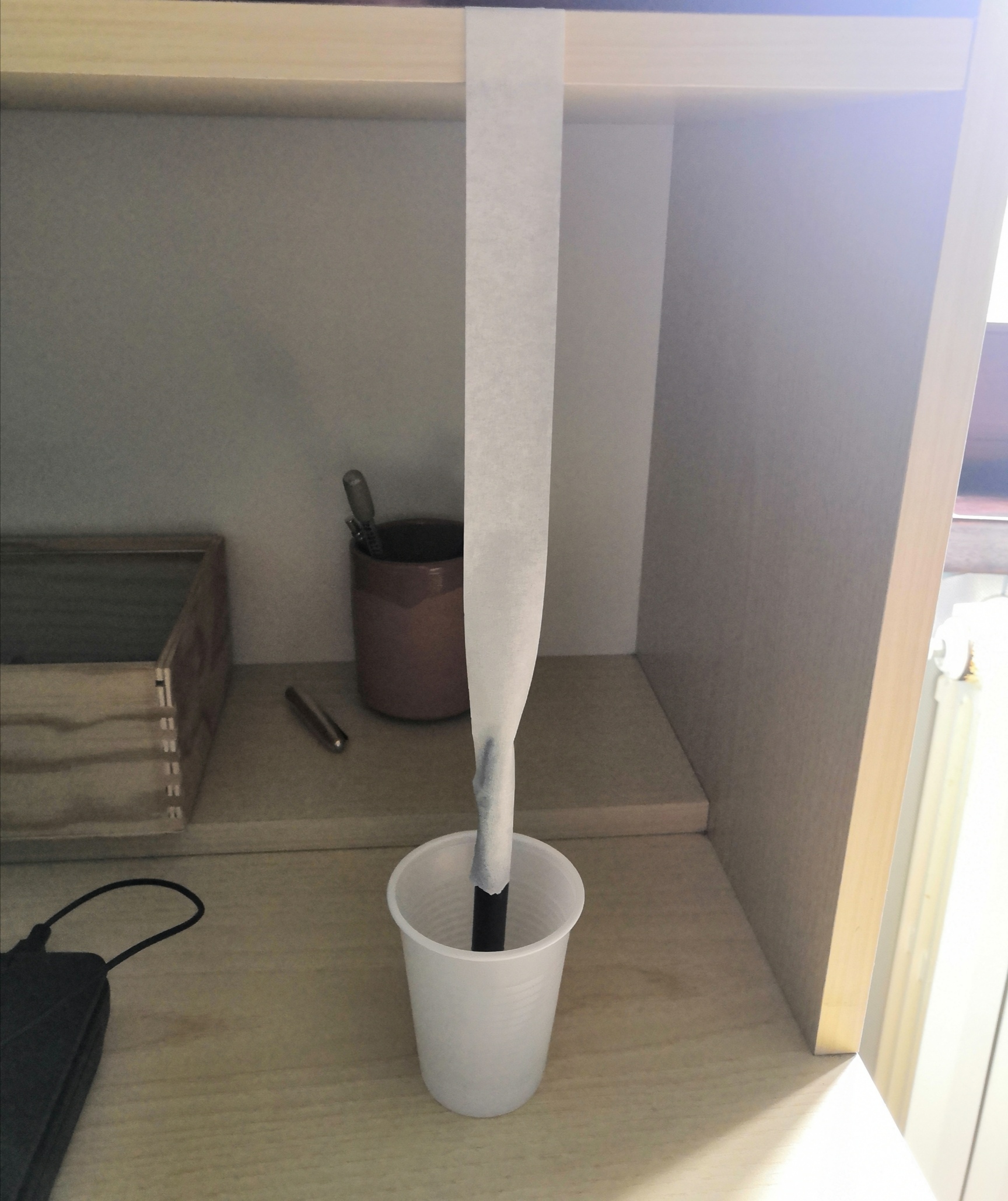 Dopo essere stata a testa in su, e aver riscontrato che non esce acqua da nessuna parte, tutto asciutto, sto facendo un altro esperimento. Ho "impiccato" la penna con del nastro carta, o carta gommata, che dir si voglia, per vedere se trafila acqua dalla filettatura.