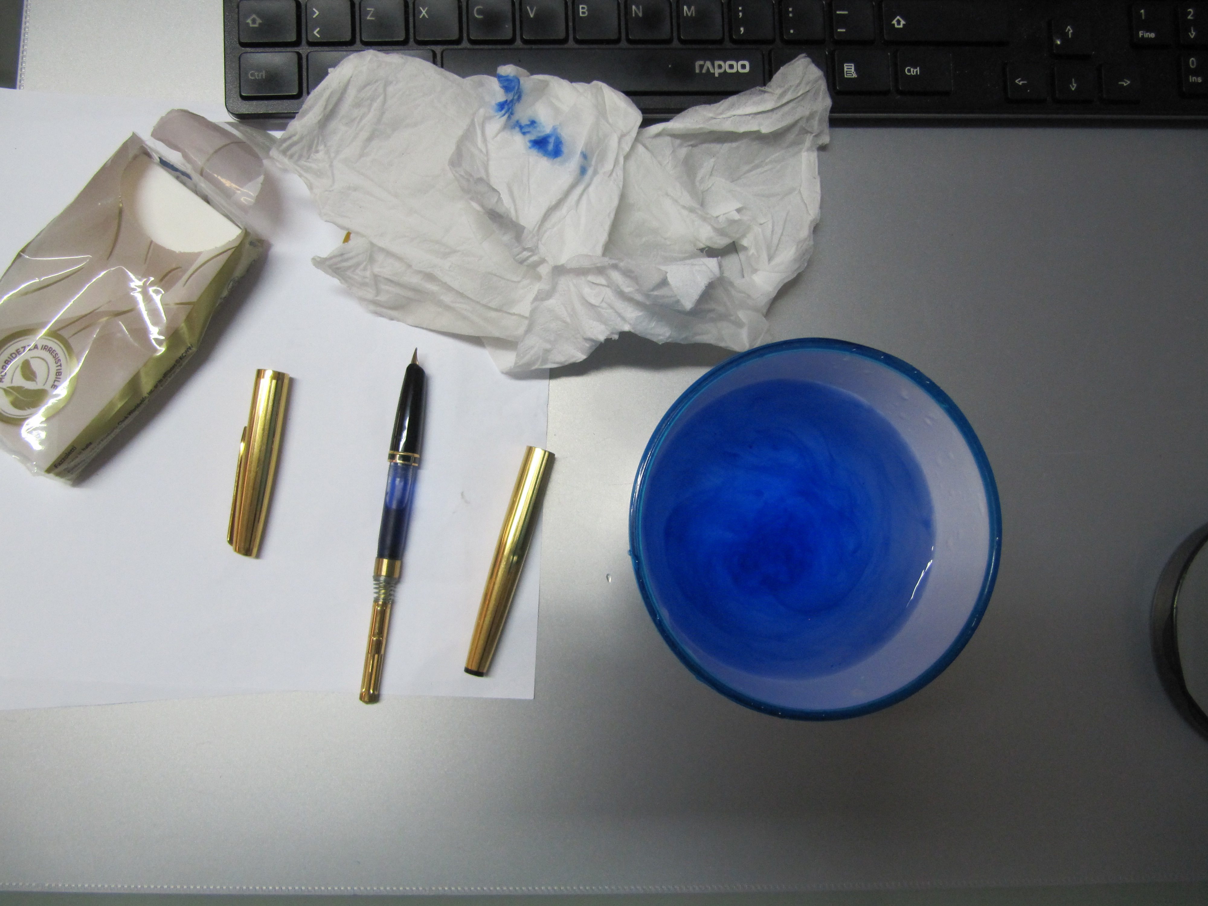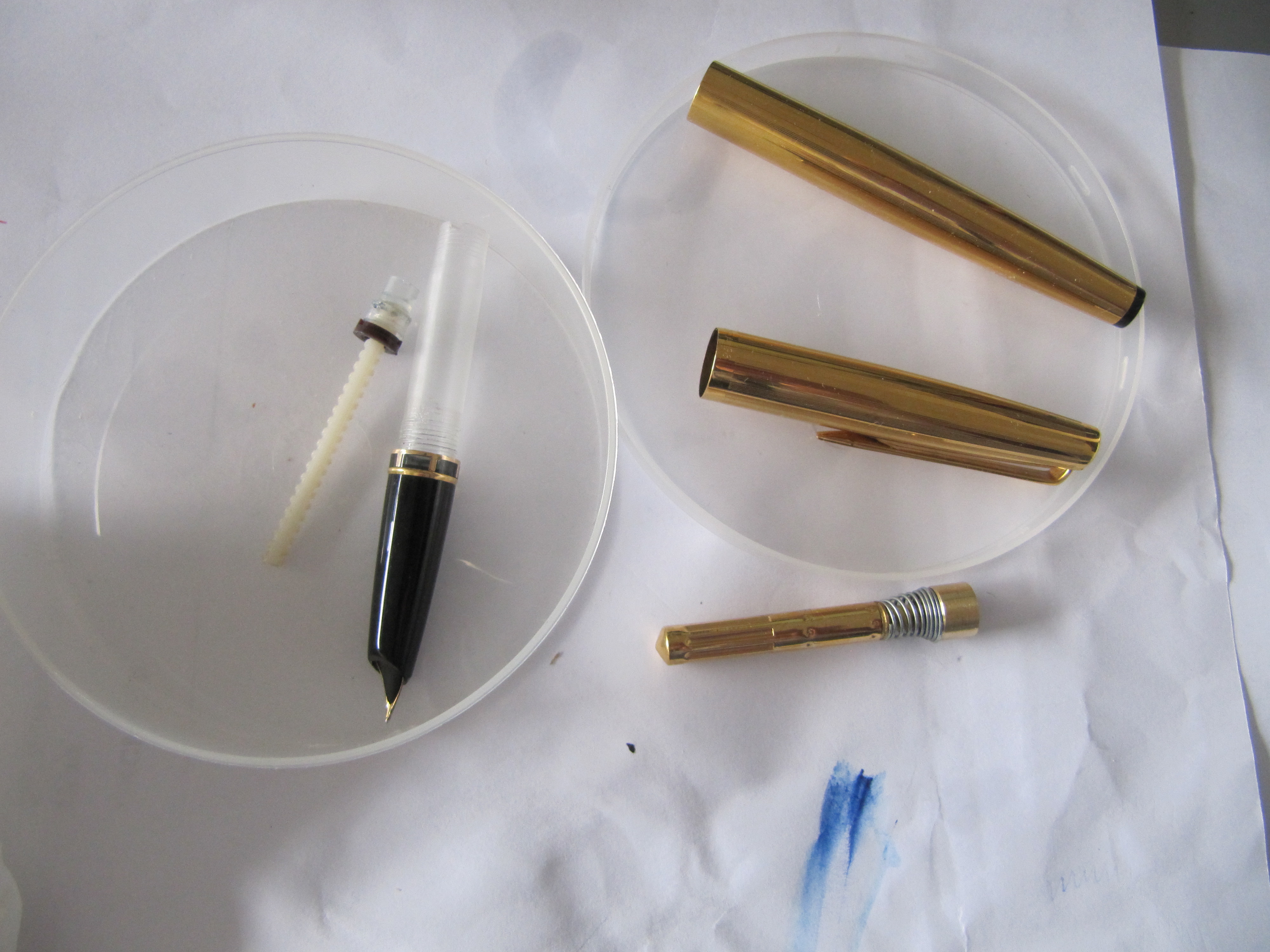 A seguito di vari tentativi infruttuosi effettuati nei giorni passati dopo aver spruzzato lo spray WD.., ho provveduto a lasciarlo agire per altri due giorni. Oggi ho tentato a lungo invano tanto che era mia intenzione riporre la penna, dopo aver rimosso lo spray che ne aveva avvolto le parti, nell'apposito cofanetto. Ma proprio quando mi ero quasi arreso all'insuccesso di separare il corpo dal fusto della stilografica ho tentato un'ultima volta avvolgendo, questa volta, attorno al corpo della stessa un elastico in caucciù affinché la mia presa fosse più salda. Ed ecco che finalmente quello che sembrava ormai un fallimento annunciato si è trasformato in un successo parziale. Dico parziale perché ho riscontrato un problema nella clip del pulsante che sembra non voler funzionare e che comprimendo la molla rende difficoltoso l'inserimento del serbatoio all'interno del fusto. Nel frattempo, in attesa di decidere come procedere, ho anche provveduto ad aspirare acqua dentro il serbatoio per fare in modo che l'inchiostro secco in esso contenuto possa "reidratarsi" e fuoriuscire definitivamente dal serbatoio ed in parte ciò è avvenuto poiché l'acqua che da esso è uscita ne contiene tracce. Per il momento è tutto ed adesso la questione che mi pongo e per la quale chiedo ulteriori e graditi consigli diventa la seguente: come riparare il meccanismo che consente al pulsante di "alzarsi"?