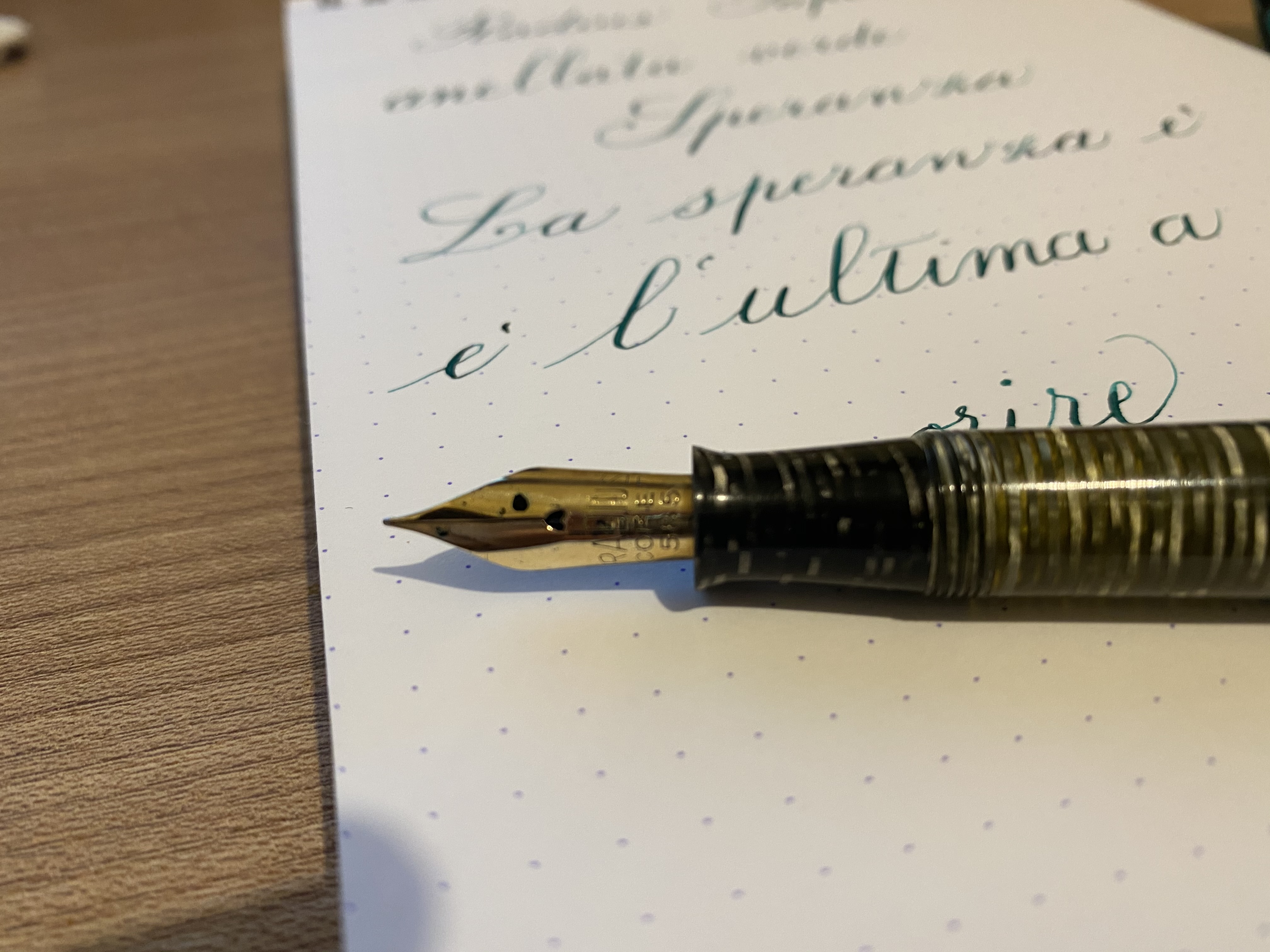 Per me la cosa interessante di questo pennino è la sensazione di nuovo che mi da, sento che ha bisogno di scrivere per sciogliersi. Solo che ho qualche remora ad inchiostrarla e vorrei fare la scelta giusta per l'inchiostro, qualcosa che lubrifichi bene. Mi è stato già consigliato il Noodler's EEL, vediamo se arriva qualche altro suggerimento.