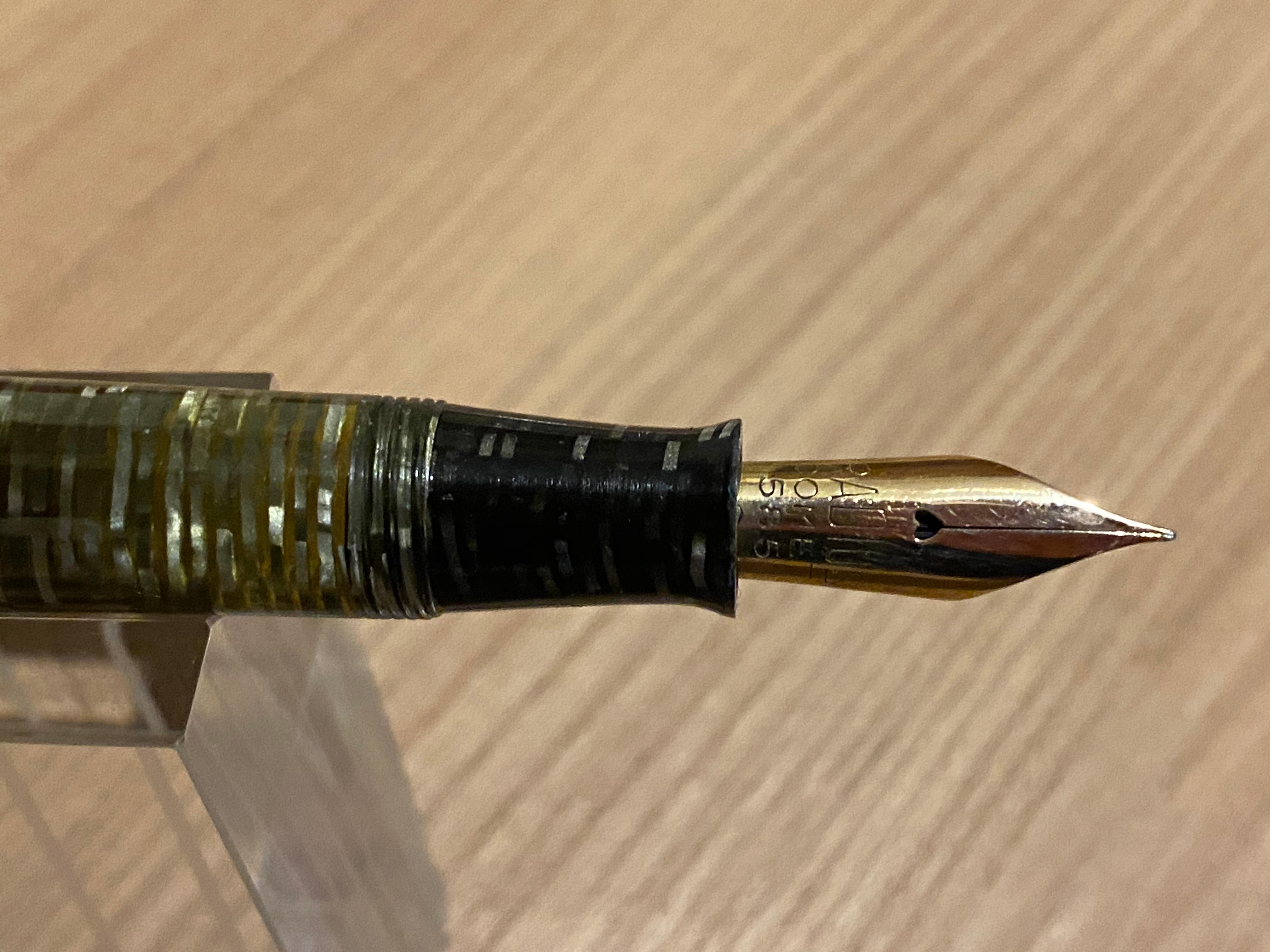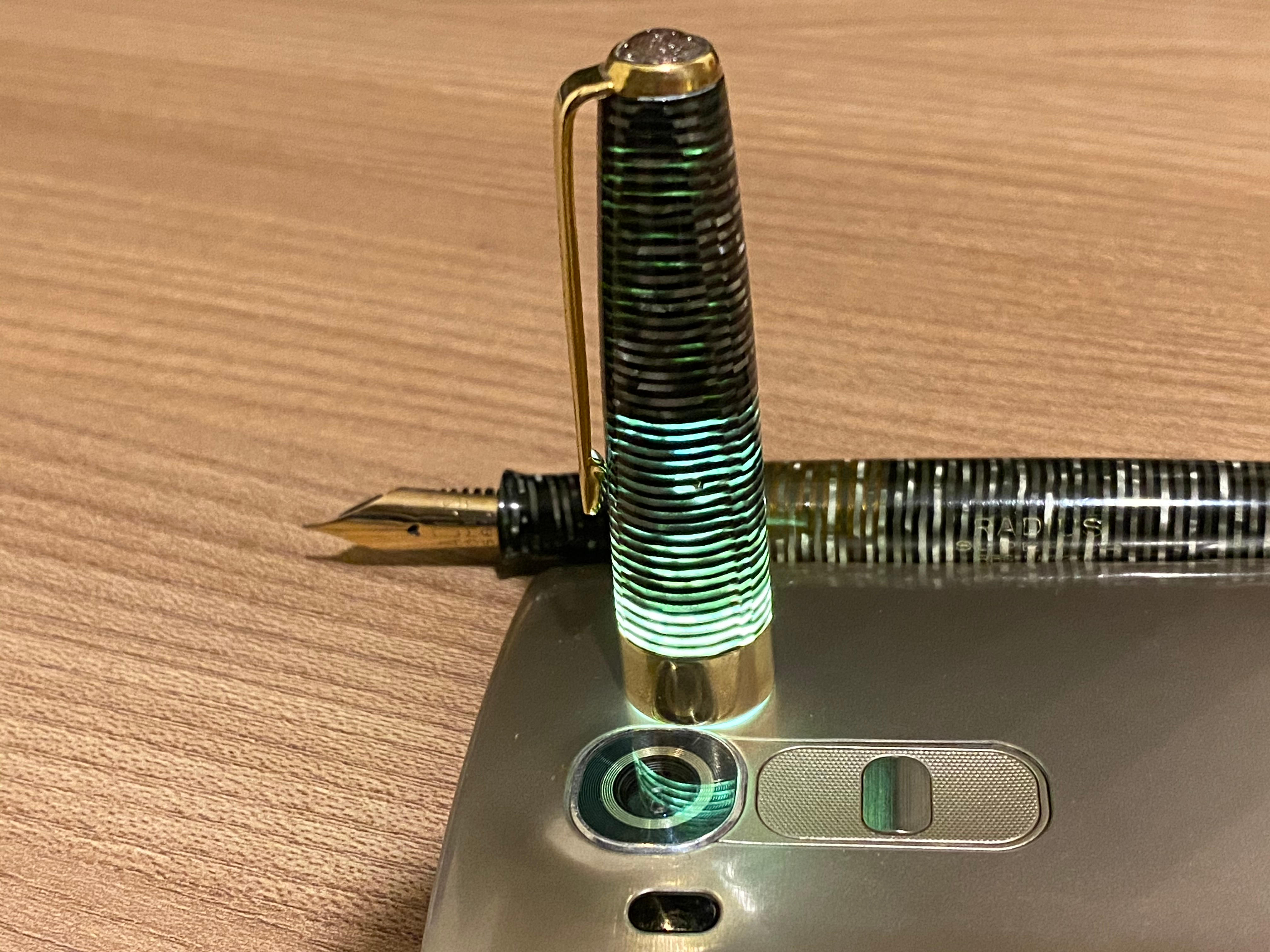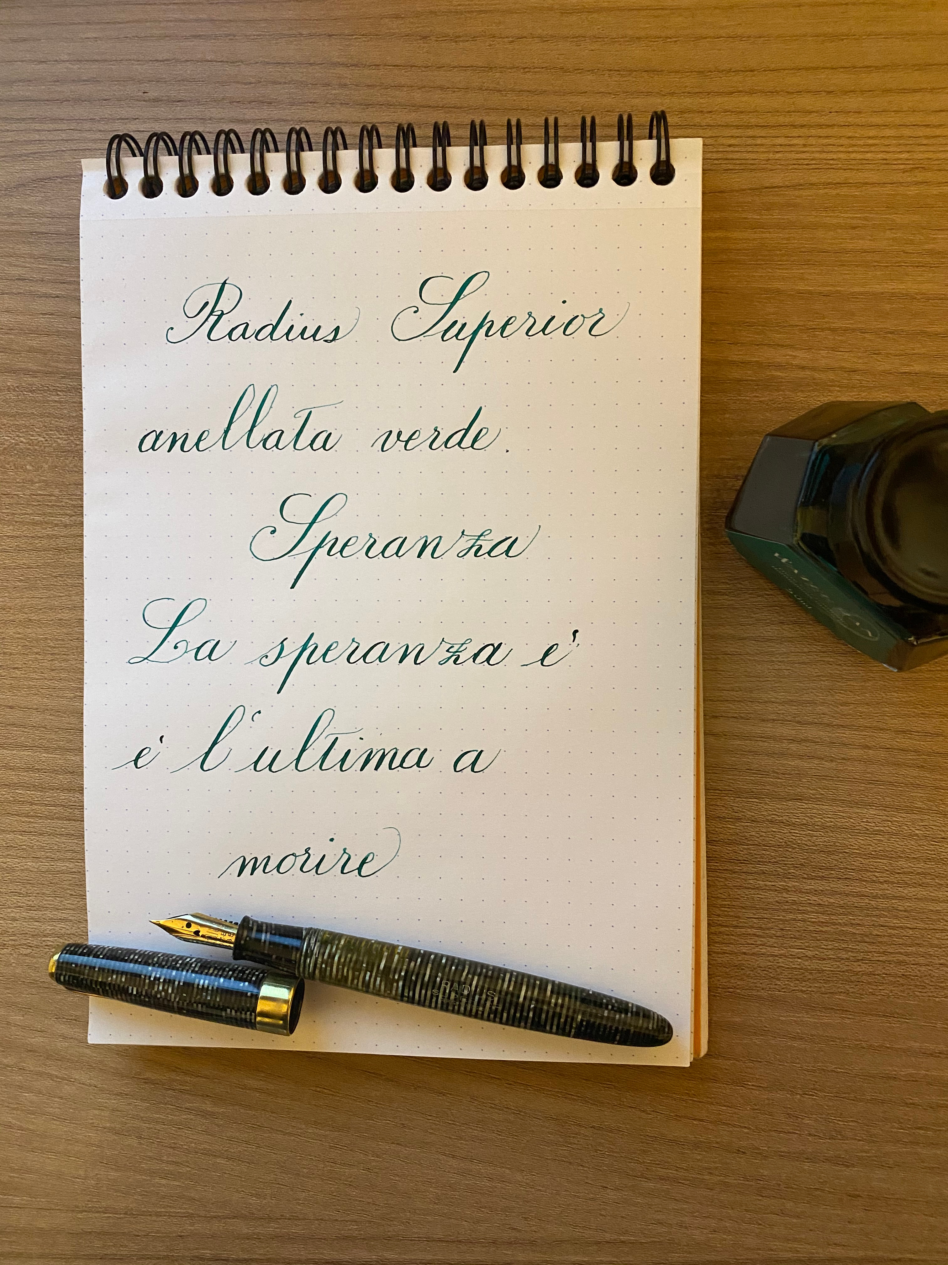 La penna è lunga 13.1 cm con un diametro del fusto nel punto massimo di 12 mm ed un peso di 16.7gr. Le linee direi che si ispirano molto alla Parker Vacumatic, la Radius però ha un sistema di caricamento a pistone fatto molto bene. La celluloide anellata ha conservato perfettamente la sua trasparenza visibile anche nel cappuccio. Il pennino è un extra fine flessibile in oro 14K marchiato Radius COMET dal tratto un po' tagliente, infatti si sente che quasi tende a graffiare la carta quando lo si fa flettere. Secondo me ha principalmente bisogno di sciogliersi essendo praticamente nuovo. Senza esercitare pressione è comunque scorrevole. Credo che per questa penna, almeno agli inizi, ci voglia un inchiostro che lubrifichi bene per addolcire il pennino, sono graditi suggerimenti al riguardo. Per il momento l'ho provata per intinzione con il Waterman Harmonious Green.