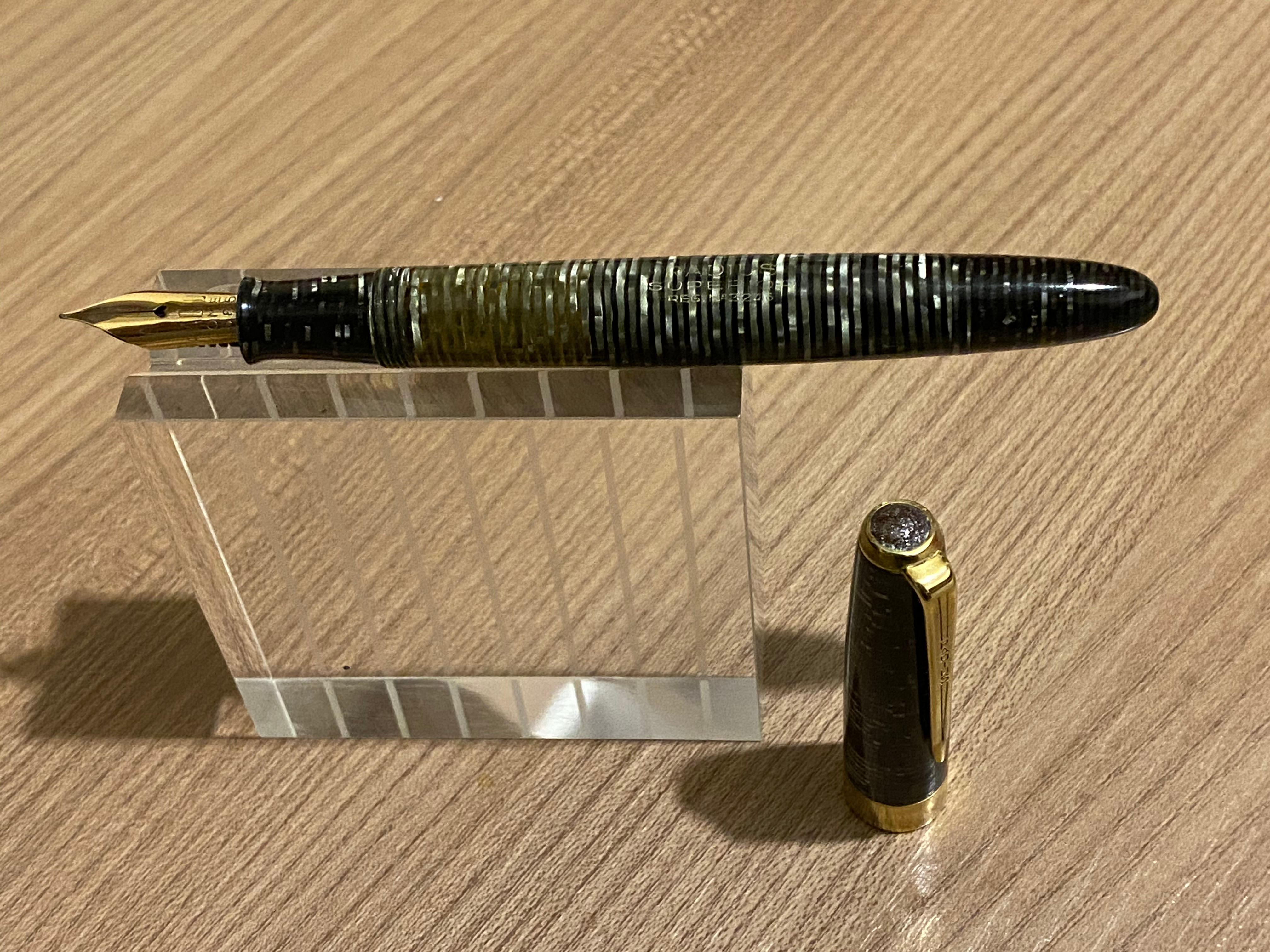 Ecco uno degli ultimi acquisti, una Radius Superior praticamente intonsa in celluloide anellata trasparente. La penna aveva solo il sughero che si era completamente rinsecchito perdendo tenuta, grazie al buon Massimo ora carica senza problemi con un sughero nuovo di pacca.