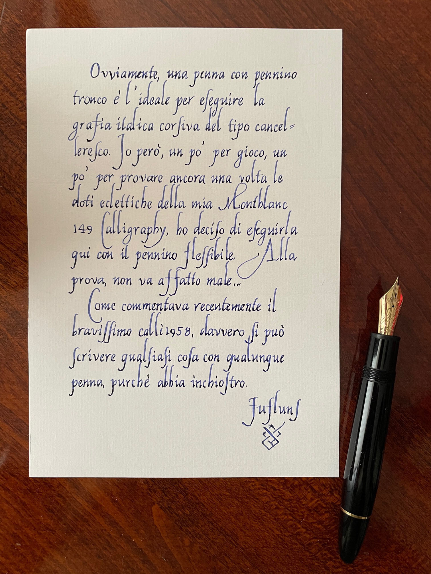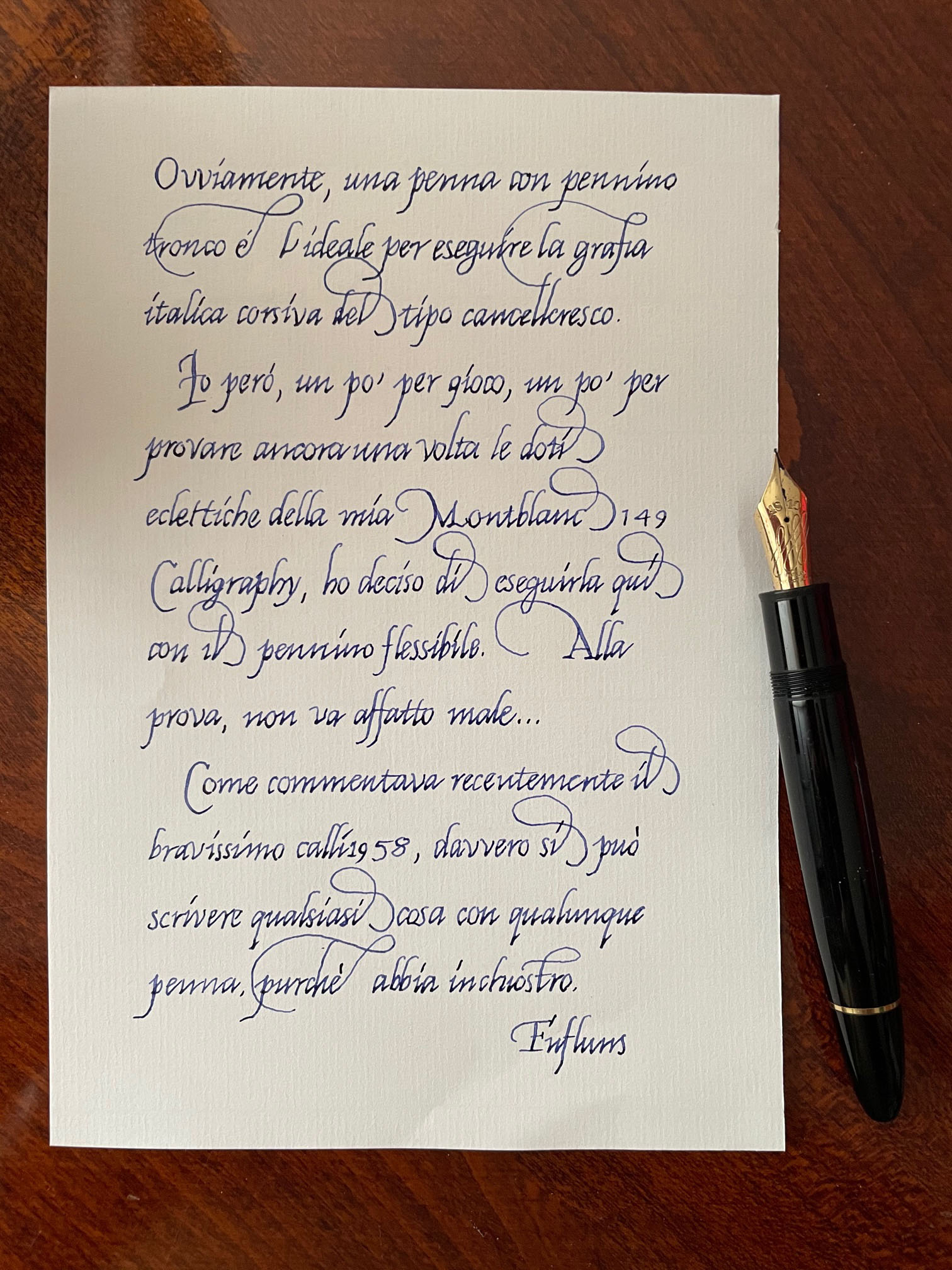 Discorso a parte merita il Calligraphy, ma solo se ti piacciono i pennini extra-fini. È il mio miglior extra-fine. Punto. In più, è flessibile ed elastico. In più, si può usare, a volere, per fare un po’ di calligrafia appuntita. Ma resta uno straordinario, grande, pennino extra-fine monocolore. Montblanc richiede si paghi un premium rispetto alle altre 149 nuove, ma secondo me ne vale davvero la pena, se ti piacciono i pennini extra-fini e se sei intenzionato a comprare una 149 nuova.