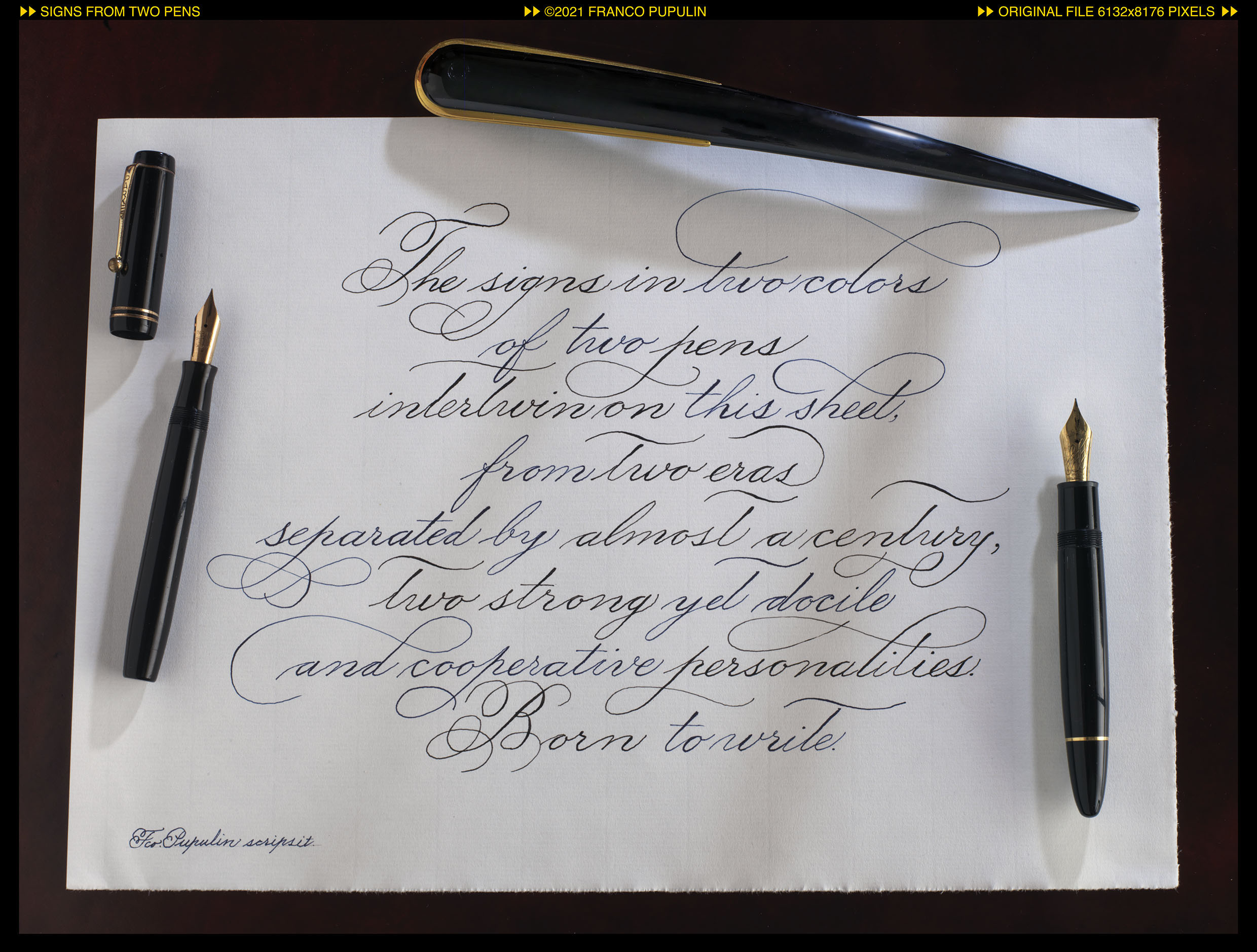 Nell'esercizio che vi presento di seguito l'ho utilizzata insieme ad una Parker Duofold Senior fatta in Canada. La sua origine canadese la rende una penna "umile" dal punto di vista del collezionista, ma le sue belle dimensioni e lo splendido pennino, extra fine e flessibile, ne fanno un ottimo strumento di scrittura.