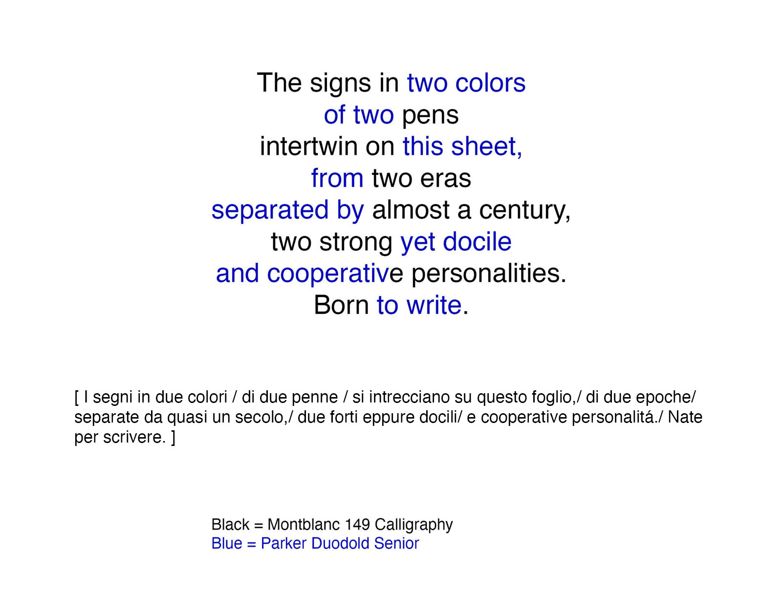 Qui ho mescolato i segni delle due penne, la Calligraphy caricata con il suo classico inchiostro Black Permanent e la Duofold con il Cobalrt Blue di Graf von Faber Castell. La differenza di tonalità di questi due inchiostri scuri non è troppo evidente, e ho pensato di sottolinearla nel seguente diagramma: