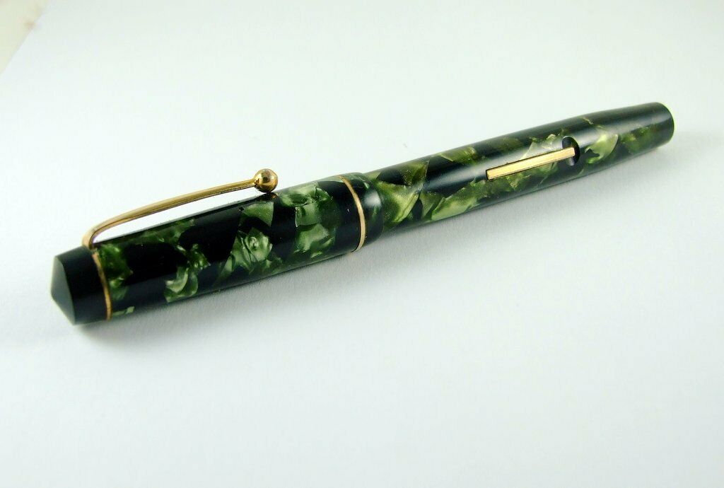 - Materiali: corpo e cappuccio in celluloide “Ethernite”, sezione, fondello ed alimentatore in ebanite, pennino d’oro a 14 carati, finiture metalliche dorate. Il cappuccio, che si chiude in circa un giro e mezzo, è dotato di due fori d’aereazione e si calza molto bene.