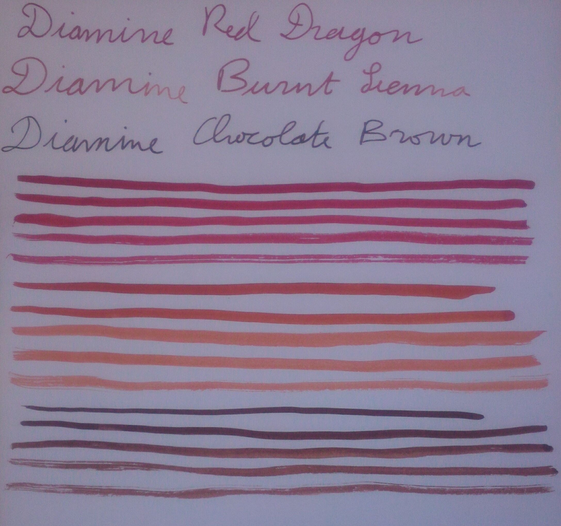 Ecco qua. Come fedeltà cromatica lascia un po' a desiderare (povero telefono, sta tirando gli ultimi): il Red Dragon è troppo rosa ad esempio, ma visto che sai come sono dal vivo due dei tre inchiostri potrai farti un'idea del terzo, almeno spero.