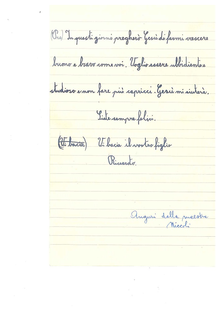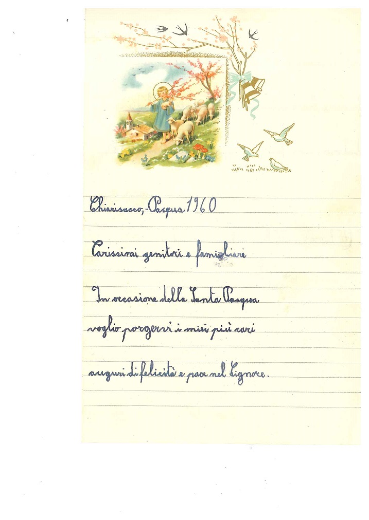ricart ha scritto: lunedì 29 giugno 2020, 14:34 Voglio farvi vedere come scrivevo quando ero in seconda elementare (si chiamava così) in questa letterina di auguri che ho trovato in una vecchia busta nella solita soffitta. Allora si usava il pennino con la cannuccia e si intingeva nel calamaio in vetro inserito in un'asola ricavata nel banco. Questo era biposto, fatto in legno e dipinto in nero. Il piano inclinato si sollevava per custodire i quaderni e il "sillabario". Quando qualche compagno più turbolento urtava il banco erano guai perché dal calamaio, senza tappo, usciva un'onda nera gigantesca che inondava tutto quaderni, libri e tutto quello che trovava nel percorso. Mi ricordo che assistevo meravigliato alla "magia" della maestra che, dopo aver riempito alla fontana un bottiglia, inseriva una polverina e l'acqua diventava nera. Questo della lettera è un bel nero che, dopo tutti questi anni, è ancora tale ma altre volte, dopo pochi giorni, virava sul marrone scuro.