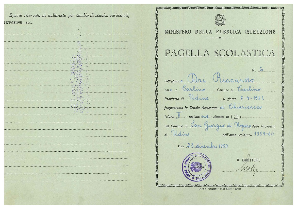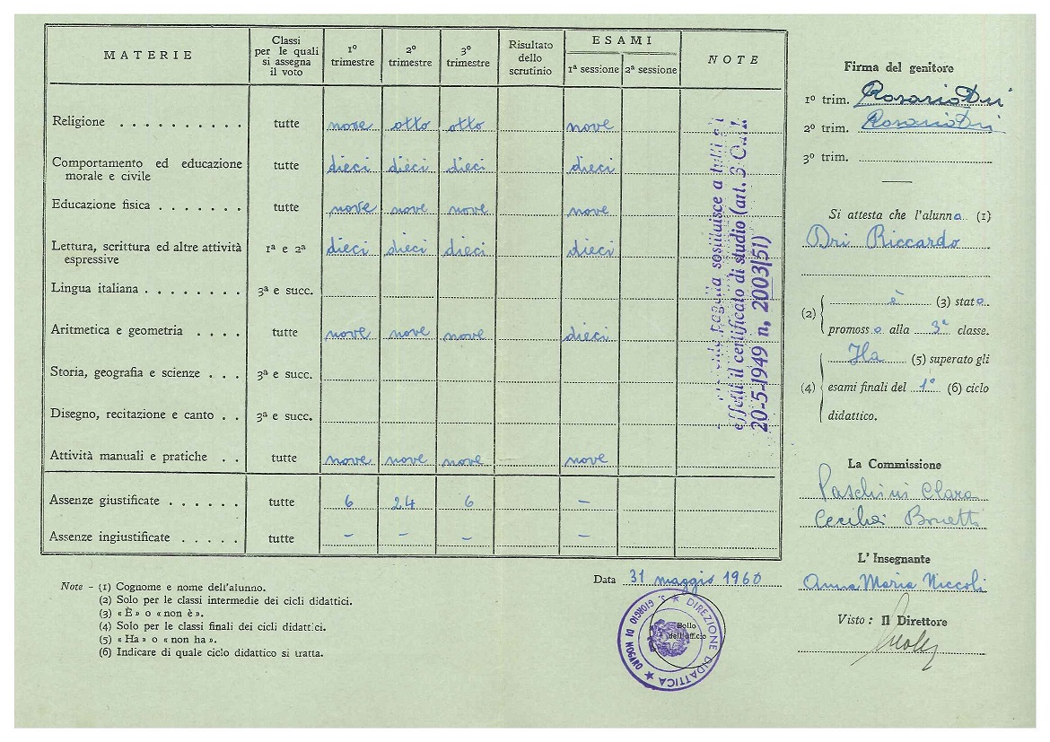 inserisco anche la pagella, dello stesso periodo, per farvi vedere come scriveva la maestra quando compilava il documento.Anche lei usava il pennino, non mi ricordo che avesse una stlografica. Il papà firmava con la mia penna.