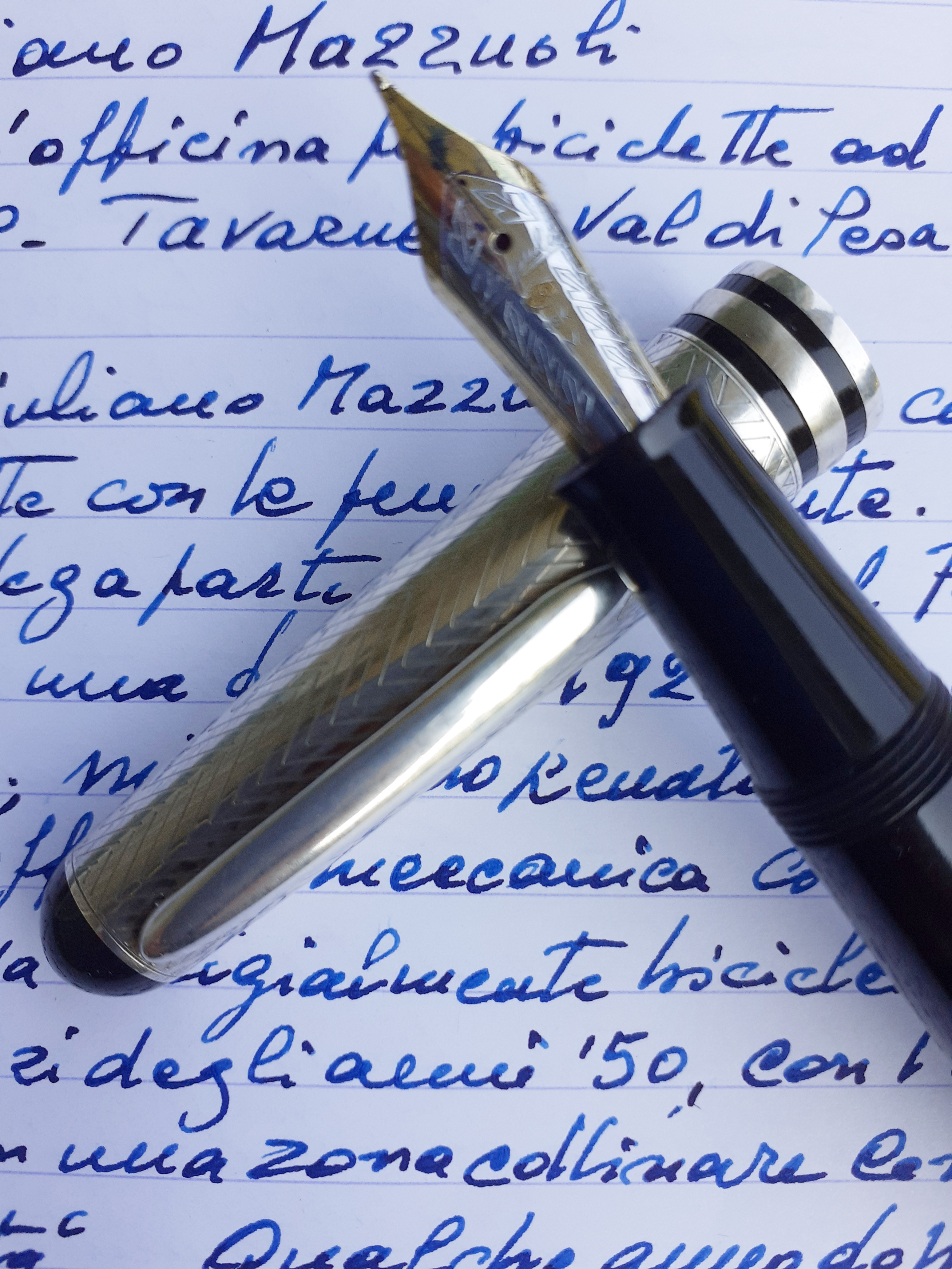 La penna è ben bilanciata, il pennino ha un giusto tratto di un M europeo, con una scrittura morbida e fluida, senza essere troppo copiosa come flusso, comunque senza incertezze, come si conviene ad un pennino in oro; la flessibilità è modesta, ma di abitudine non calco mai la mano quando scrivo.