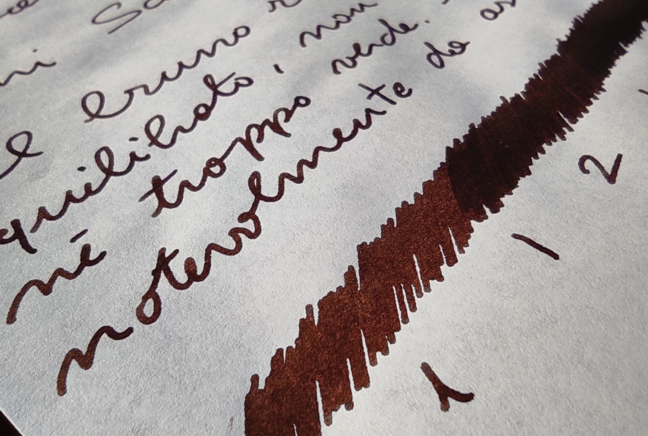 buongiorno. aggiungo, su pennini fini (decimo F, spippolata per aumentare flusso) il colore e' un bel cioccolata fondente. se ci metti vicino il nero si vede la differenza, altrimenti si avverte un colore piu' caldo, ma resta a livello di sensazione