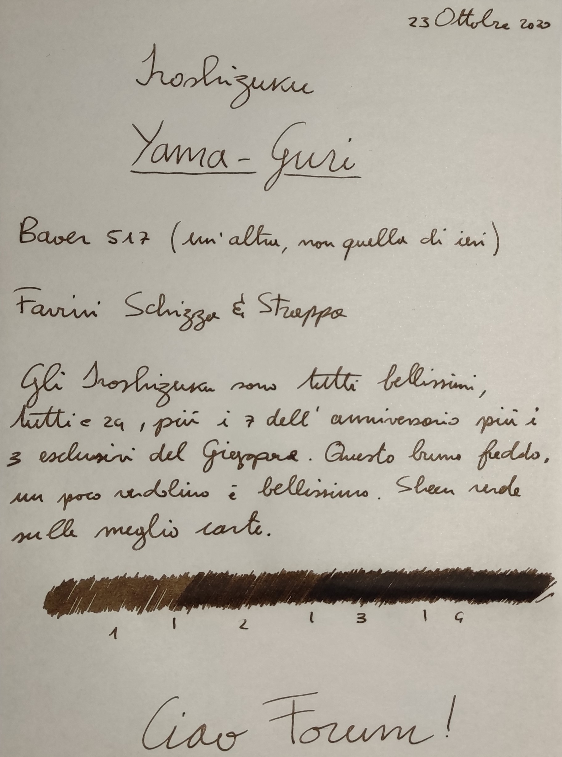 mi ha fregato la "," invece del ";" no, non "voglio" che lo yama-guri valga i soldi che costa, quindi nessun conflitto da risolvere. quello che intendevo chiedere e' se il poco shading fosse reale o conseguenza di penna o carta o fotografia. hai scritto "oggettivo", quindi la foto e' realistica: poco shadingGhiandaia ha scritto: ↑venerdì 23 ottobre 2020, 11:20Quando leggo domande come questa un po' rido sotto i baffi (che non ho), un po' la prendo sul serio e mi scervello a mettermi nei panni di chi la chiede, un po' mi vien da dire "ma che domanda è". Alla fine l'unica cosa che posso fare con un minimo di fondamento di verità è giudicare secondo il mio metro: in tal caso la risposta è: certo, vale ogni centesimo. Da quello che mi dici mi pare che da una parte tu "voglia" che questo inchiostro valga i soldi che costa, ma d'altra parte il riscontro del dato oggettivo (poco shading) ti rema contro. Come risolvi questo genere di conflitti lo sai solo tu. Magari un campione?