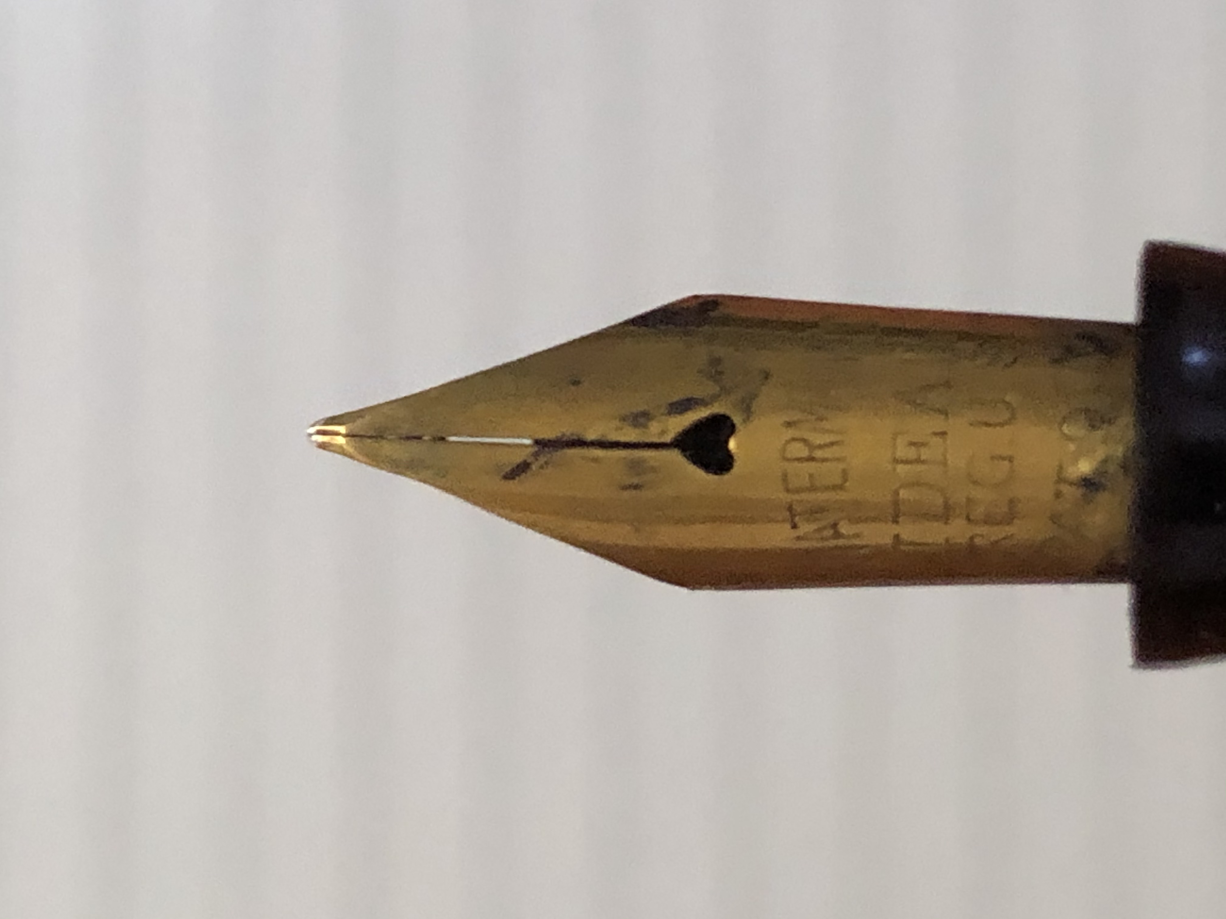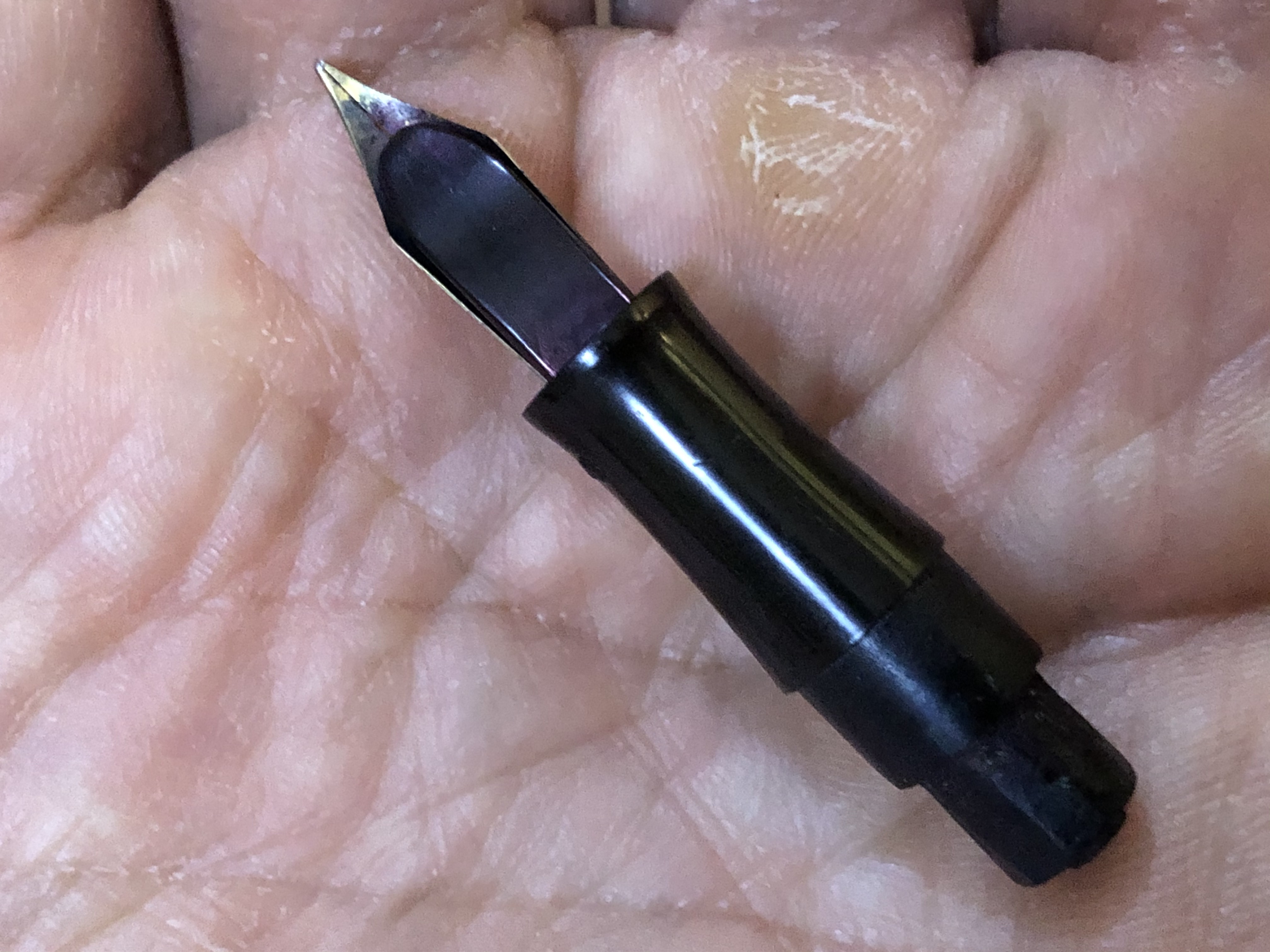 Se guardi la foto dove viene tenuto sul palmo della mano, vedrai che c'è un bel residuo di inchiostro tra la fine dell'alimentatore e la punta del pennino; e se è presente lì, quasi certamente l'alimentatore sarà pieno di inchiostro secco.
