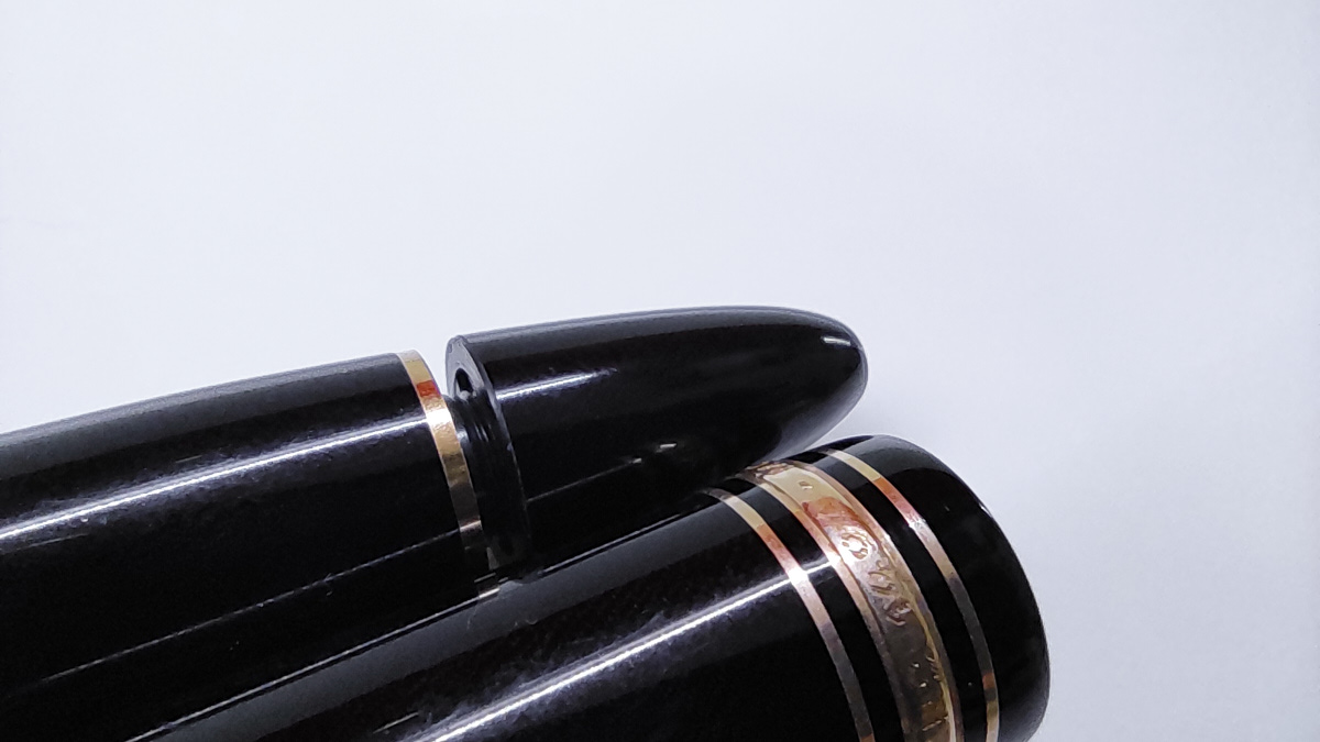 Posseggo anche una MB 149 anni 80 (ebonite split) pennino bicolore 14k con gradazione M. Scrive come un medium. Da notare come quest'ultima sia 2 mm più' alta della versione moderna. Ma i cappucci sono identici in lunghezza! Il "reverse writing" e' un fine. Mentre nella versione moderna resta un EF, quindi non c'e' stacco.