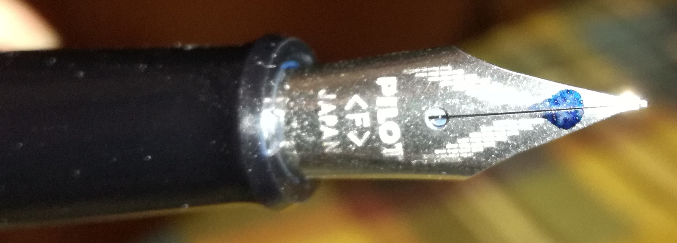 Salve a tutti, ho una Pilot Metropolitan e ogni volta che la "stappo" mi ritrovo puntualmente una macchiolina di inchiostro tra i rebbi, e come se non bastasse la penna ha qualche problema di flusso dell'inchiostro, nel senso che prima scorre normale poi improvvisamente il flusso diminuisce (in genere sensibilmente, ma una volta mi è parso quasi come se la penna fosse quasi scarica); ho una Pilot Kakuno con pennino che dovrebbe essere virtualmente identico e non ho nessuno dei due problemi. Ho provato a smontare completamente alimentatore e pennino della Metropolitan e a tenerli una notte in acqua con un paio di gocce di detersivo per piatti, ma il problema non si è risolto. Allego anche una foto della punta, sia delle Metropolitan sia della Kakuno, poiché mi paiono diverse. Quale può essere il problema e posso fare qualcosa per risolverlo?