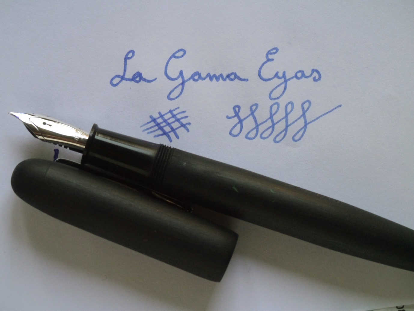 La Eyas può piacere nella sua livrea seria e nella sua finitura che al tatto sembra quasi satinata (la sezione della penna è invece lucida.), oppure può sembrare un po' monotona (a confronto con la enorme scelta di varianti di colore di una Ranga, ad esempio), tuttavia è una penna che si è rivelata interessante in quanto ben predisposta ad accogliere vari tipi di pennini.