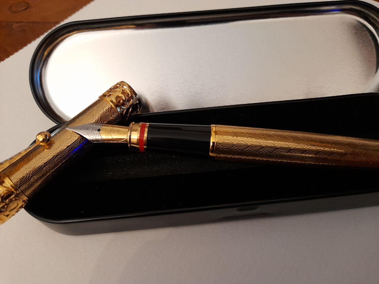Che dire, è bellissima e scrive magnificamente: pennino medio piuttosto abbondante, feedback piacevole e ben bilanciata. Sembrerebbe davvero laminata in oro, la lavorazione è fantastica dal vivo