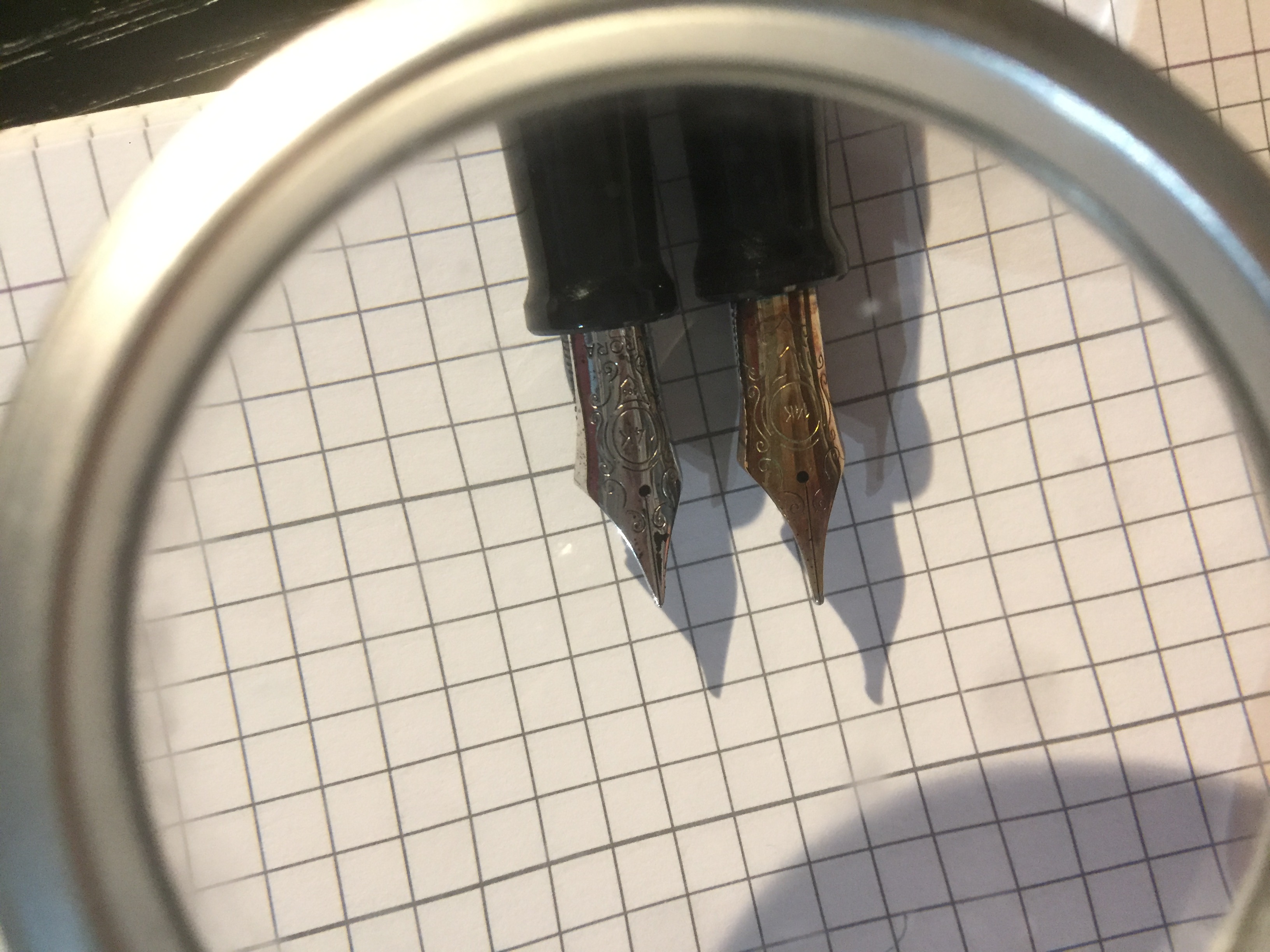 Purtroppo non ho mai avuto il nero Aurora, per cui rimando ad altri per il confronto tra i due inchiostri. La penna ha un pennino 14 kt che mi è stato indicato (acquistata usata a un Pen Show) di taglia F.