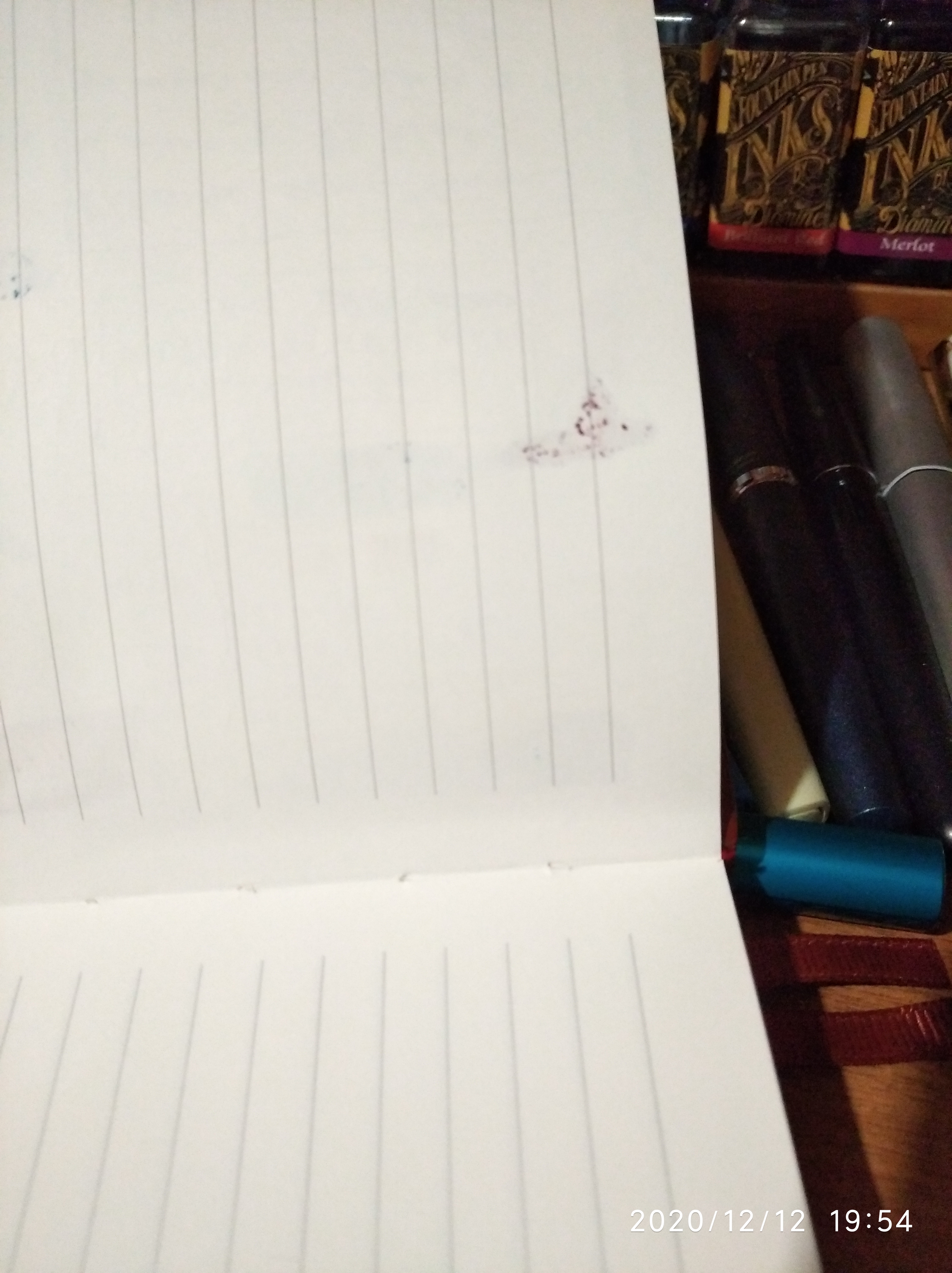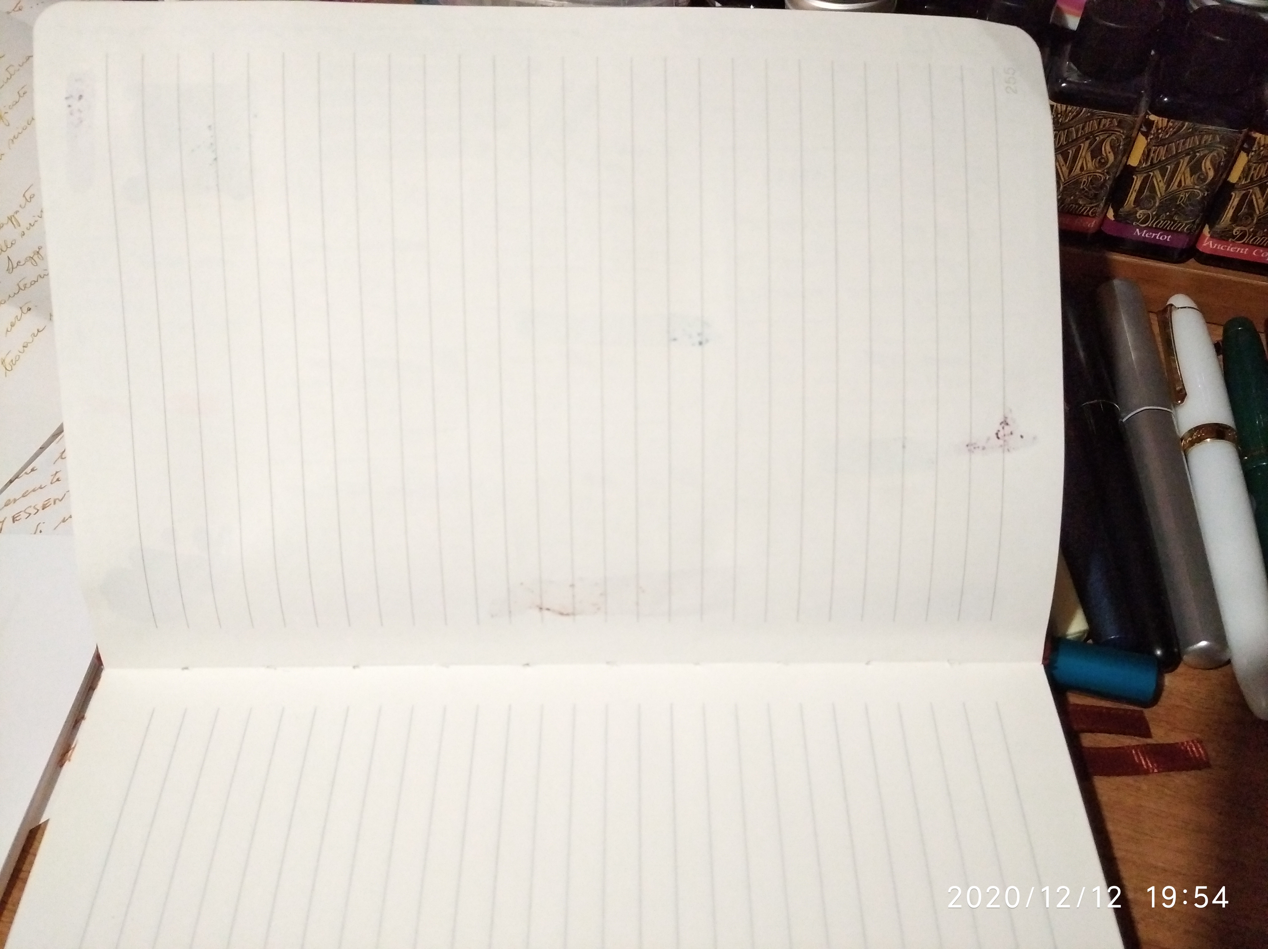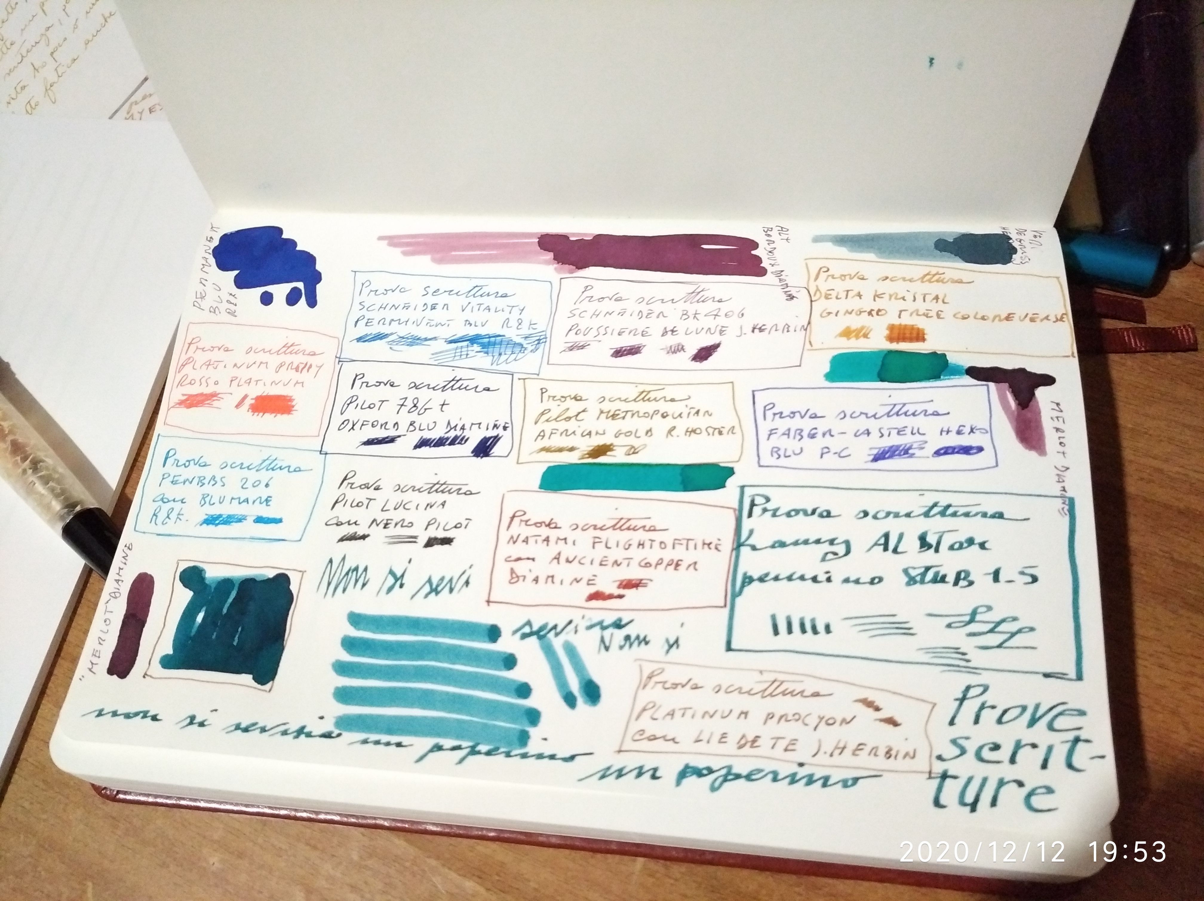 Comunque vi spiego cosa voglio fare e perché mi serve un diario: voglio usare una pagina per ogni inchiostro, facendo il classico spennellamento in un angolo e usando il resto della pagina (o magari delle pagine, se decido di allargare lo spazio per ogni colore/marca) per testarlo con le varie penne in cui lo userà in futuro. Una specie di archivio ordinato e aggiornato di volta in volta, più che un diario, per avere un saggio del colore e uno di come si comportano con esso varie penne, senza dover annotare in modo caotico su altri diari.