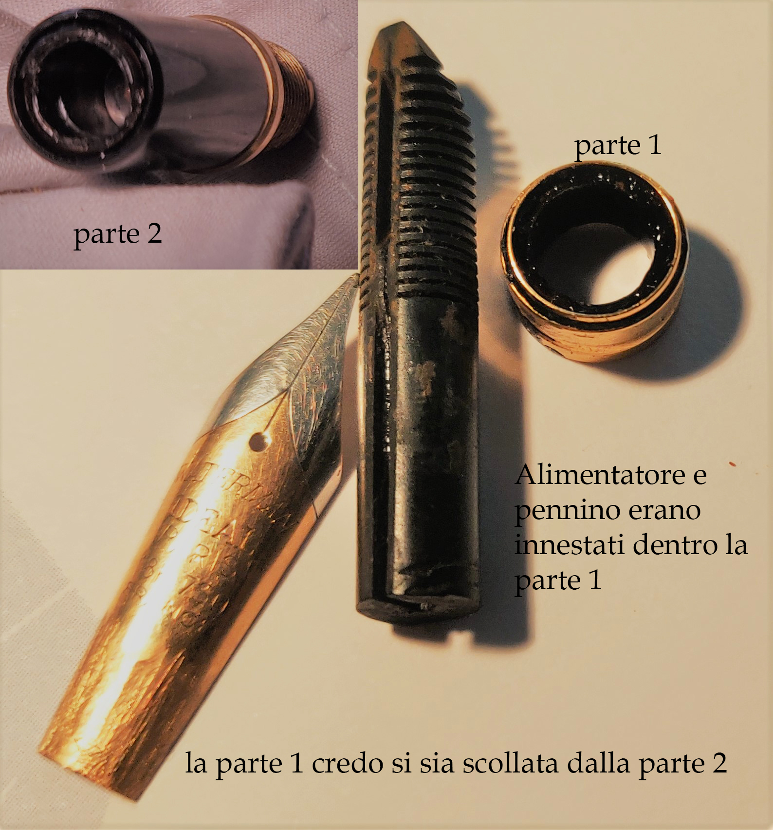 La mia Waterman Ideal tipo leMAn ha 30 anni di età forse qualcosa in più. Non la usavo da 25 anni e ho deciso di fare una pulizia profonda, anche perché dopo una pulizia superficiale, il flusso dell'inchiostro si interrompe. L'ho smontata ed ho notato che la sezione ( nella foto le due parti della sezione vengono indicate come parte 1 e 2) in cui si inserisce il pennino con l'alimentare è spezzato ( o mi sbaglio?) . Vi mando delle foto . Qualcuno può darmi una idea. se è vero quello che penso come è riparabile?
