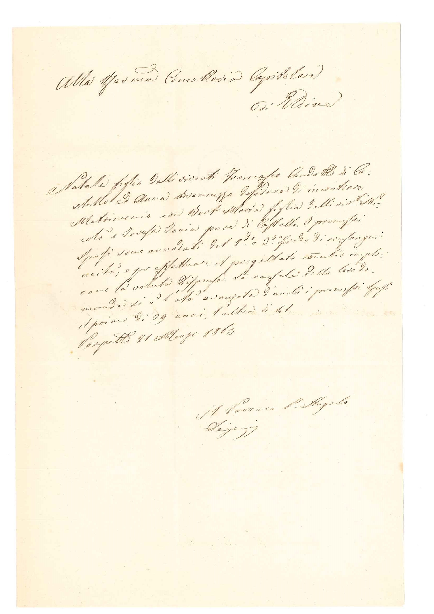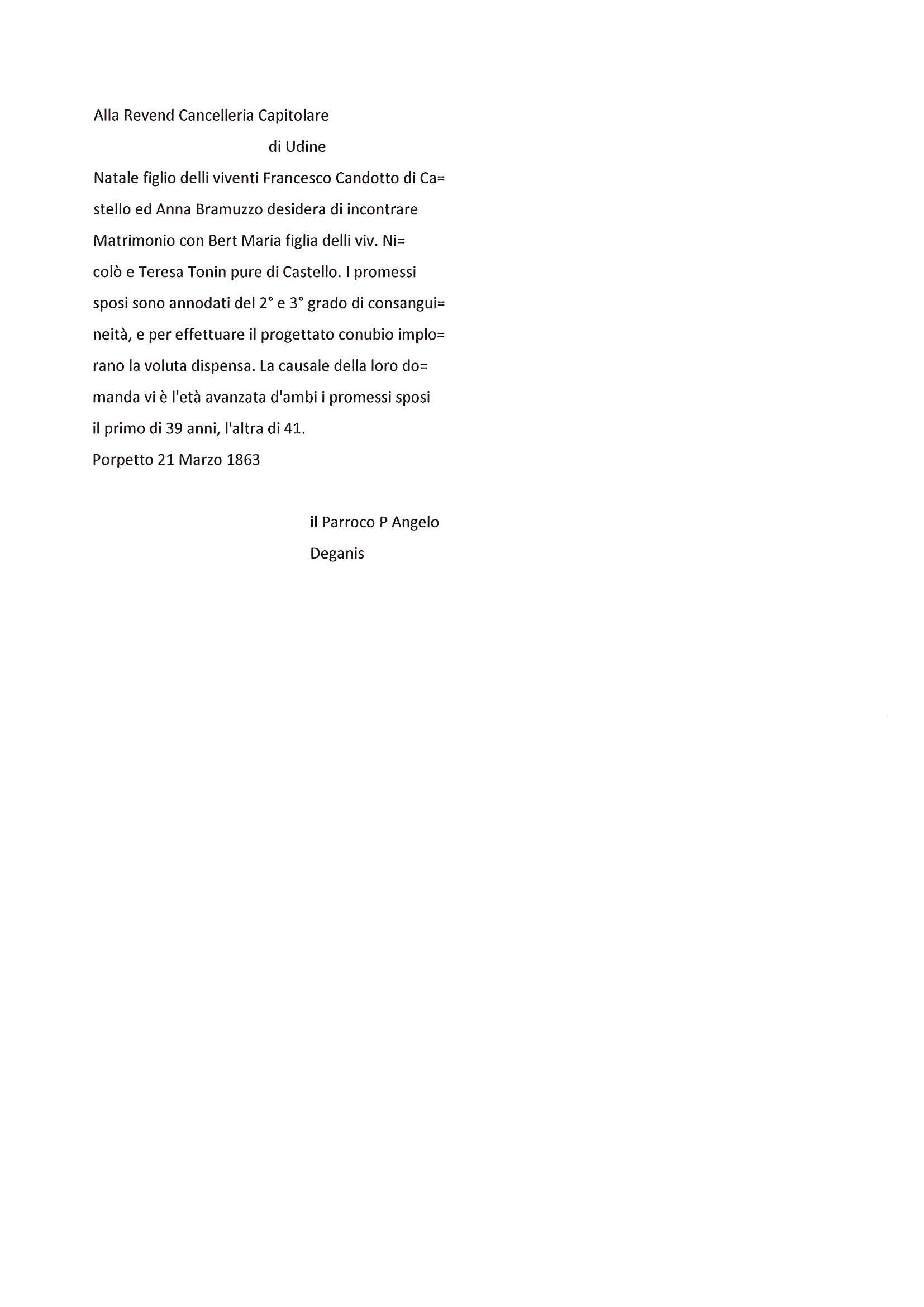Pubblico una lettera del 1863 indirizzata alla Cancelleria Capitolare di Udine per ottenere una dispensa matrimoniale. I protagonisti sono Natale e Anna che si sposarono l'anno dopo. Natale morì nel 1873 e Anna nel 1912 all'età di 90 anni. Il pievano di Porpetto, Angelo Deganis, morì nel 1884.