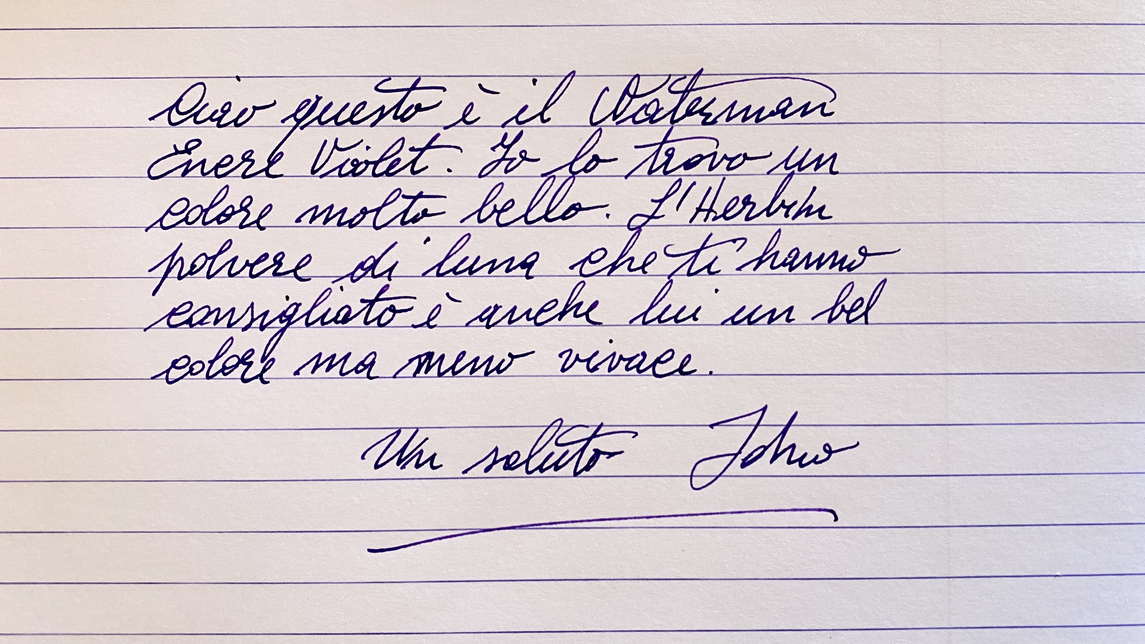 Ho visto il Waterman violet ma dalle scansioni mi sembra troppo chiaro (magari mi sbaglio) o in alternativa l’herbin violette pensée, mentre vorrei evitare i Diamine... che dite? Avete consigli o suggerimenti?