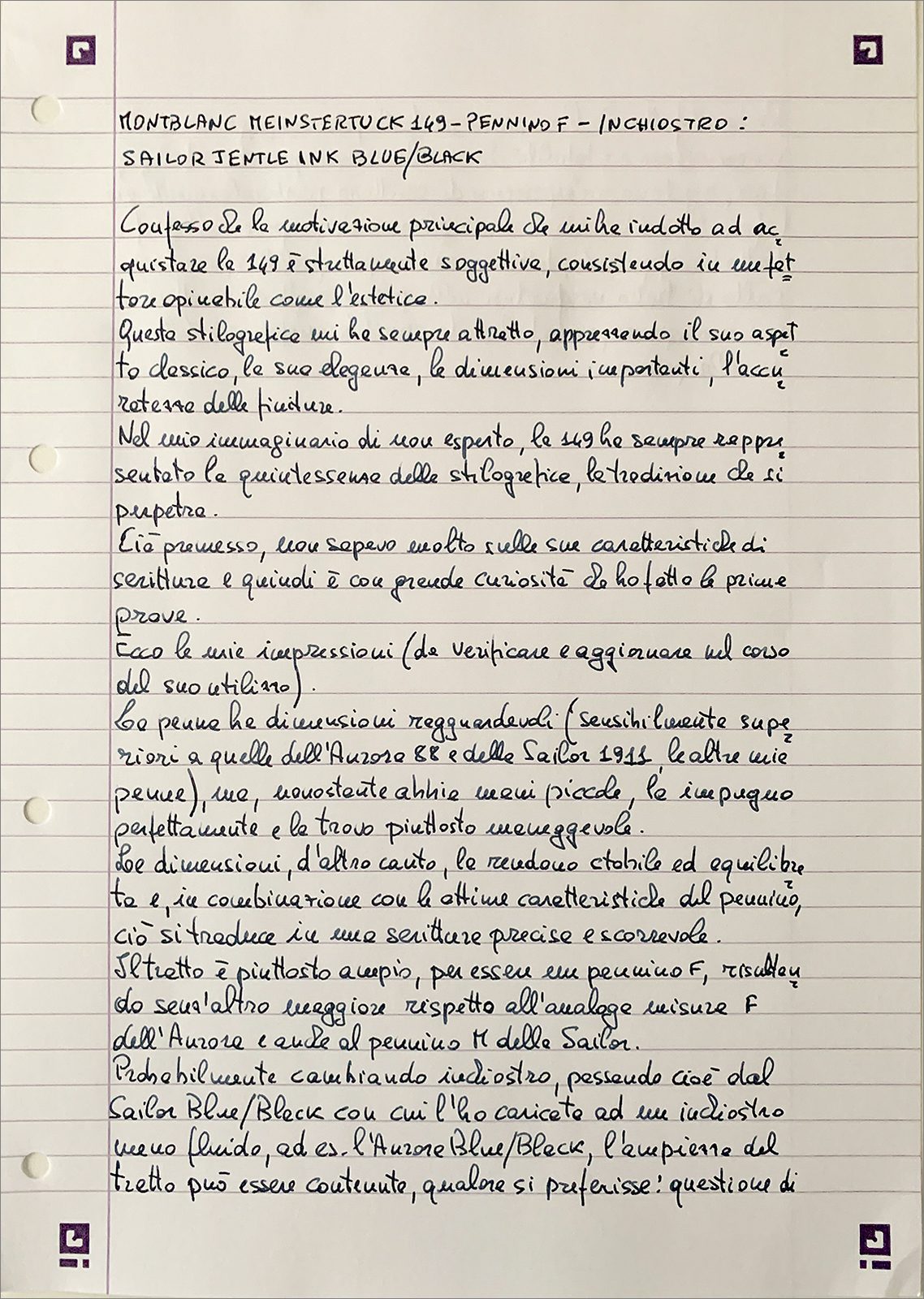 Probabilmente cambiando inchiostro, passando cioè dal Sailor Blue/Black, l'inchiostro che ho impiegato per la prova, ad un inchiostro meno fluido, ad es. l'Aurora Blue/Black, l'ampiezza del tratto potrebbe essere contenuta, se lo si preferisse: questioni di gusti.